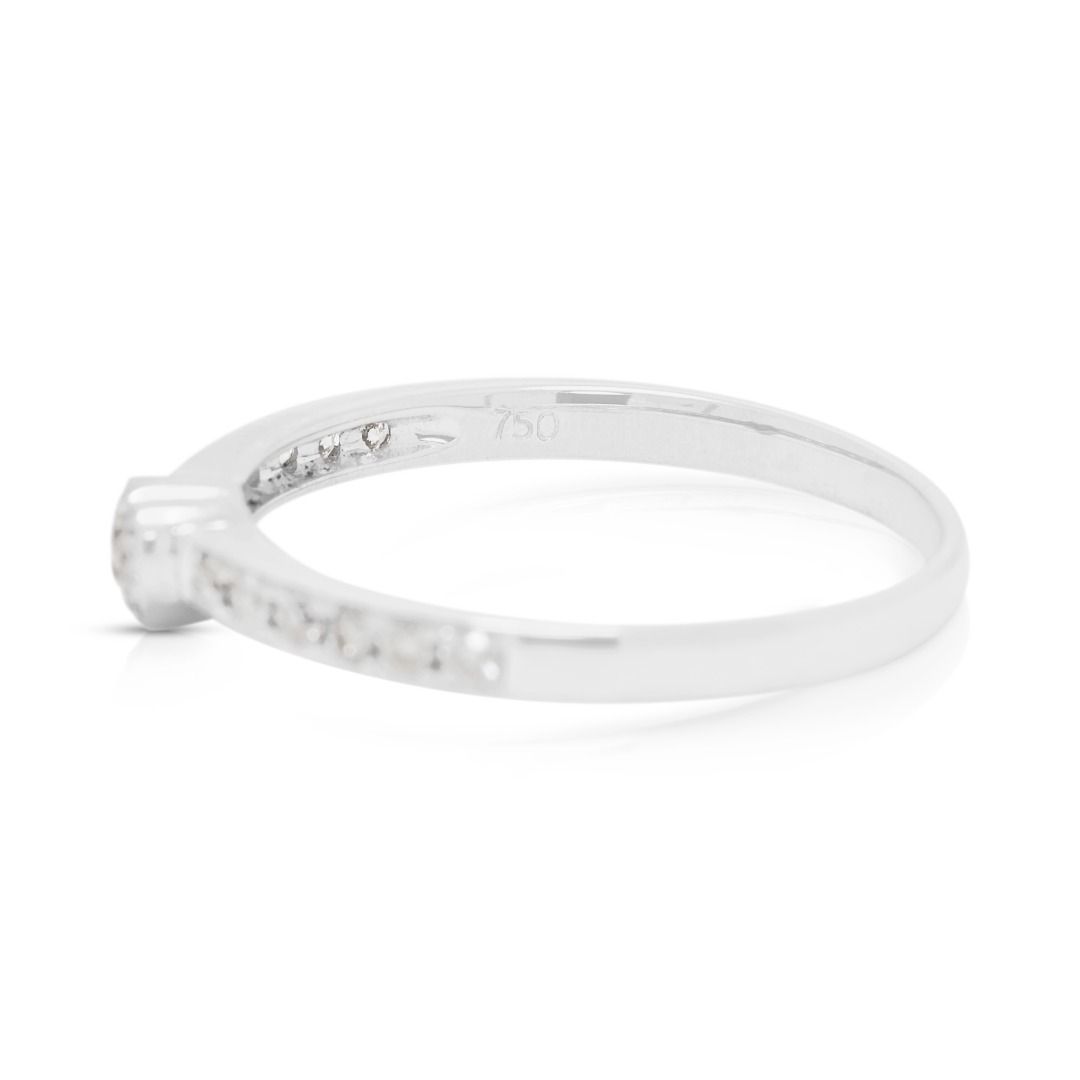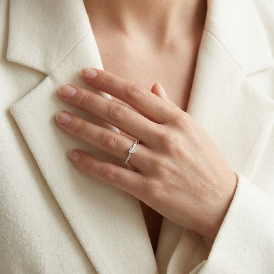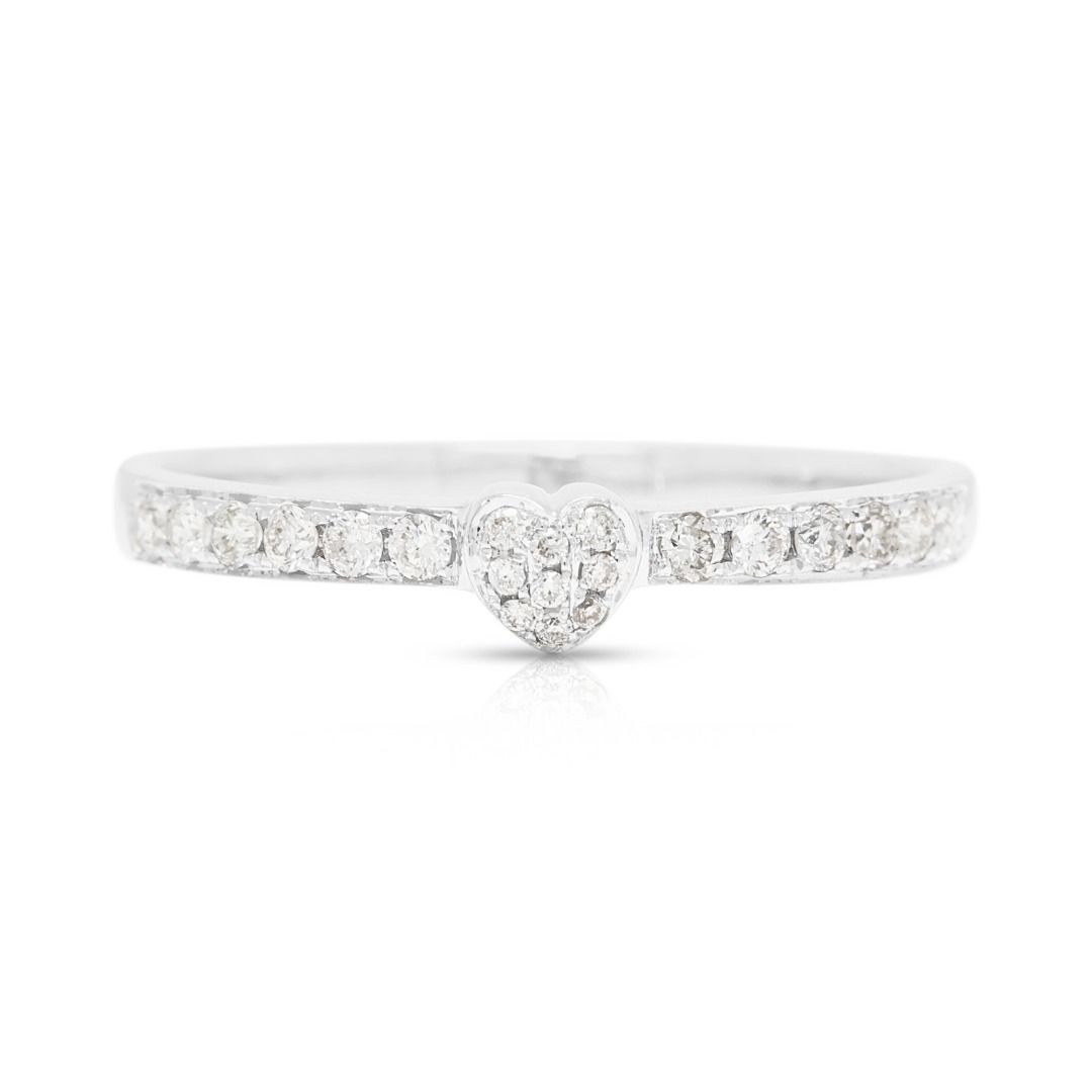 טבעת עדינה זו מעוצבת בזהב לבן 18 קראט, ומציגה במרכזה צורת לב מעוטרת ב-18 יהלומים עגולים בחיתוך בריליאנט (סה"כ 0.16 קראט, צבע H, ניקיון VS). במשקל תכשיט של 2.03 גרם ובמידה 55EU/16HK, היא נוצצת באלגנטיות ובקסם. פריט רומנטי המסמל אהבה ומסירות, מושלם כטבעת אירוסין, מתנת יום נישואין, או אוצר יומיומי.