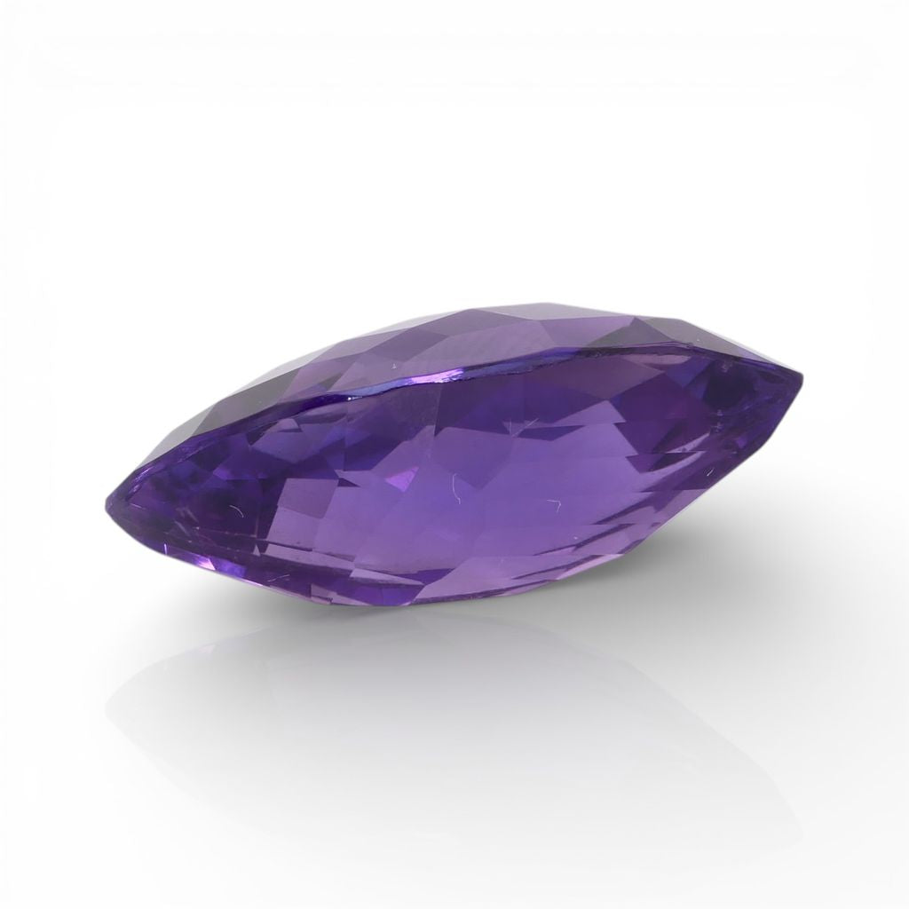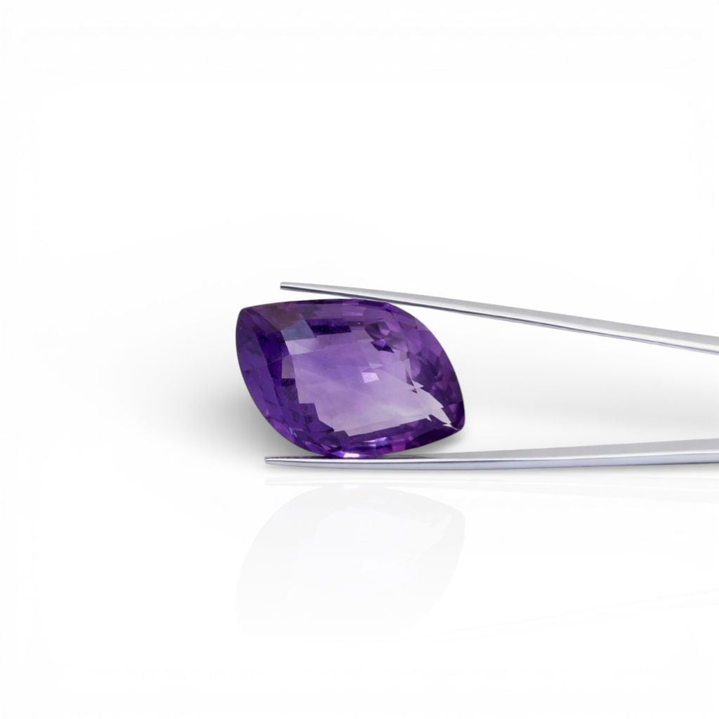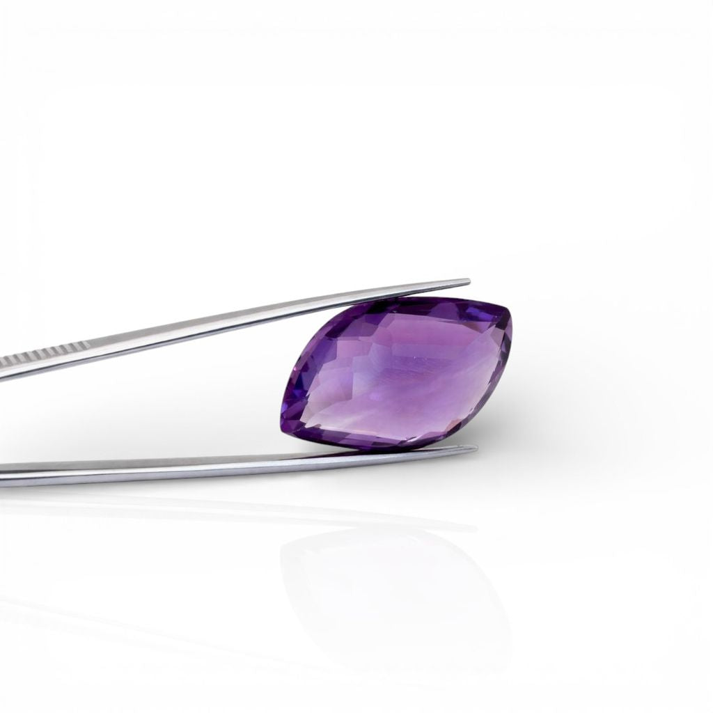 אמטיסט יוצאת דופן זו במשקל 41.52 קראט מציגה חיתוך ייחודי בצורת עלה, המדגיש את הברק הטבעי שלה ואת גוון הסגול העז.