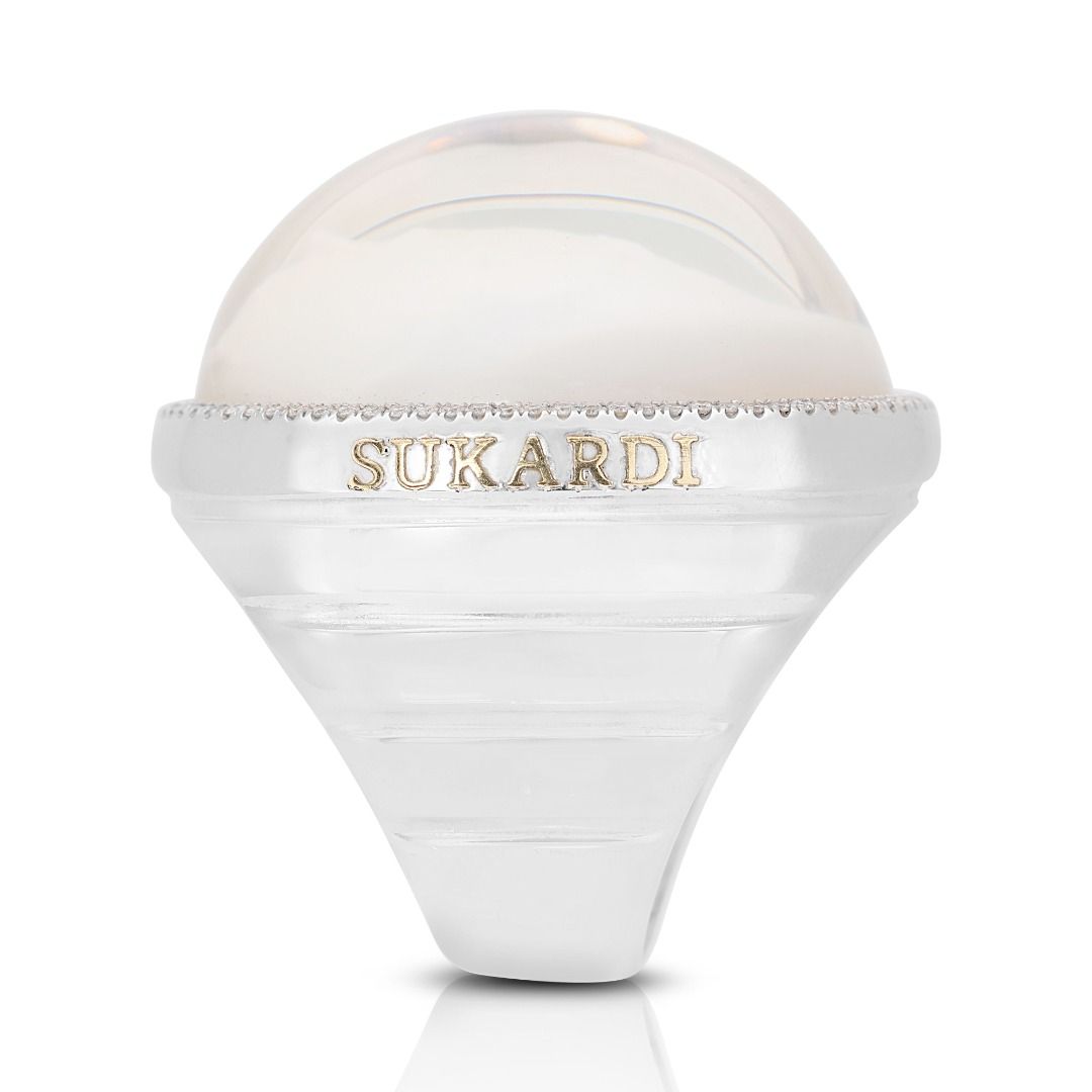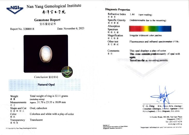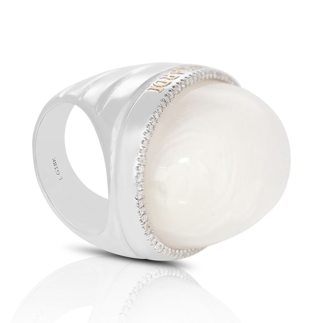 טבעת יוקרתית זו, עשויה זהב לבן 18K, משובצת אבן מרכזית מרהיבה ומערך נוצץ של אבני צד. המוקד הוא אבן אופל, בצורת אובל, המציגה גוון לבן קלאסי. אופלים ידועים במשחק הצבעים הייחודי שלהם, ההופך כל אבן לאוצר חד פעמי.