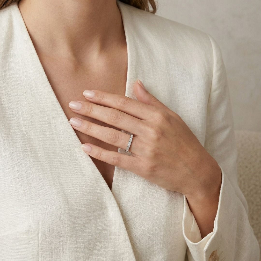 טבעת איטרניטי נצחית זו מעוצבת בזהב לבן 18K, משובצת ב-38 יהלומים עגולים בחיתוך בריליאנט (סה"כ 0.38ct, צבע G–H, ניקיון VS) המשובצים ללא תפר סביב החישוק. במשקל תכשיט של 2.26g ובמידה 47.5EU/9HK, היא מציעה ניצוץ מתמשך ואלגנטיות מעודנת. פריט יוקרתי המסמל אהבה ומחויבות נצחיות, מושלם כטבעת נישואין, טבעת יום נישואין, או תוספת יקרה לכל אוסף תכשיטים יוקרתי.