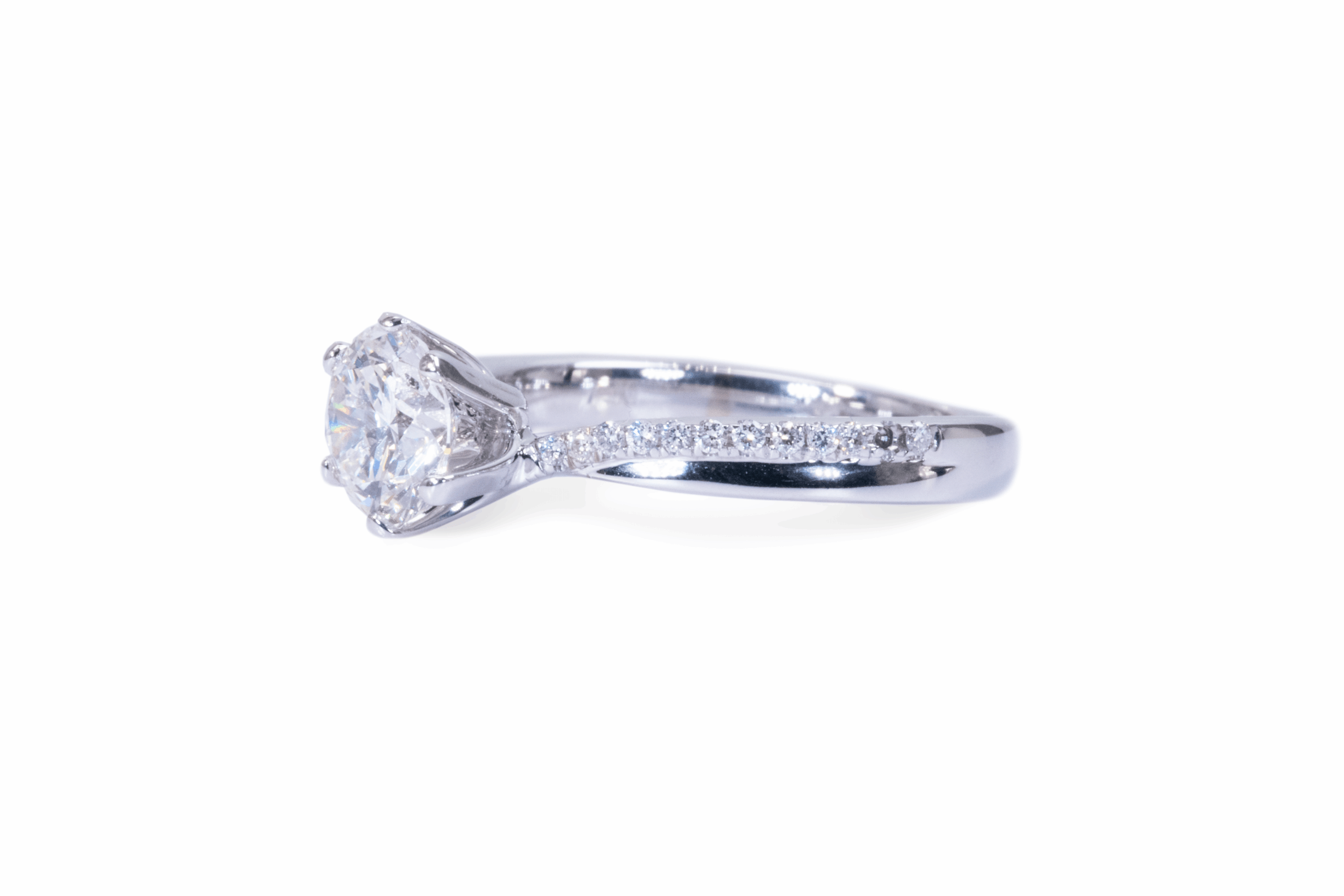 הטבעת מרשימה ונותנת מקום גם ליהלום המרכזי. צידי הטבעת משובצים ביהלומים קטנים – שורה כן ושורה לא וכך נוצר מראה עם נוכחות שאינו מאפיל על היהלום המרכזי.