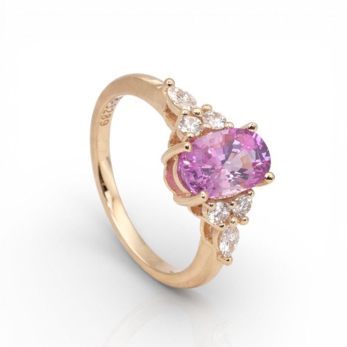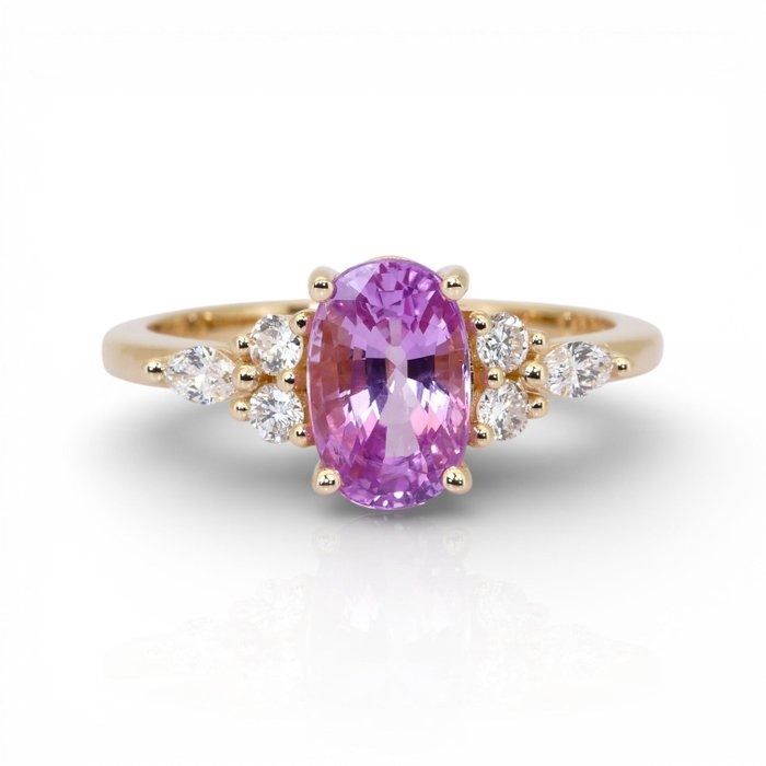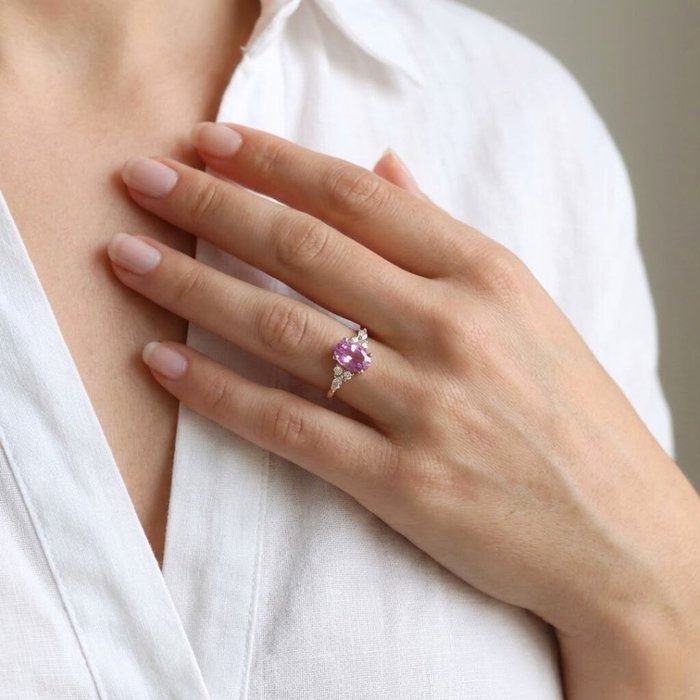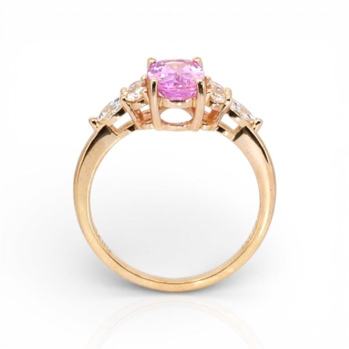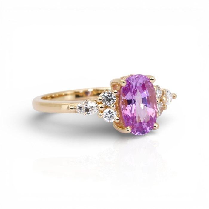 מקרינה חמימות ואלגנטיות, טבעת קסומה זו מציגה אבן ספיר ורודה בחיתוך אובל במשקל 1.83 קראט, זוהרת בגווני סומק עדינים אך מלאי חיים המסמלים אהבה ותשוקה. מעוטרת בשני יהלומים בחיתוך מרקיזה במשקל כולל 0.10 קראט וארבעה יהלומים טבעיים עגולים מבריקים במשקל כולל 0.20 קראט, השיבוץ מנצנץ להפליא מכל זווית. עשויה מזהב צהוב 18 קראט עשיר, הניגוד משפר את הגוון הרומנטי של הספיר תוך הוספת יוקרה נצחית. עם משקל כולל של 2.13 קראט ומלווה בתעודת GIA, פריט זה הוא אוצר מעודן של יופי מתמשך.