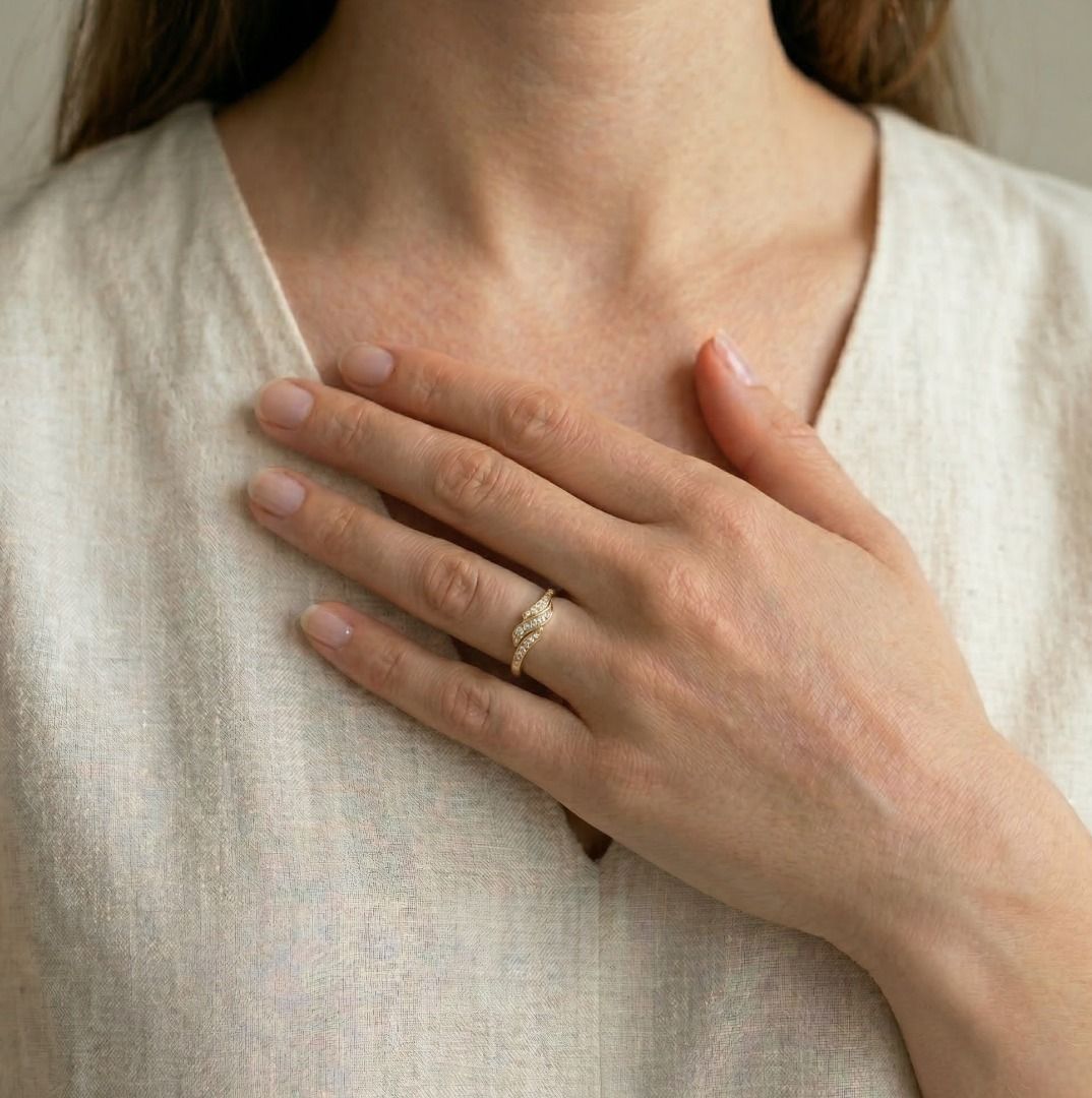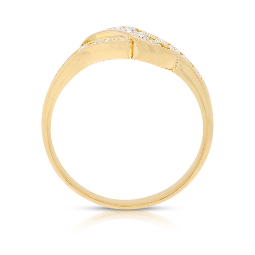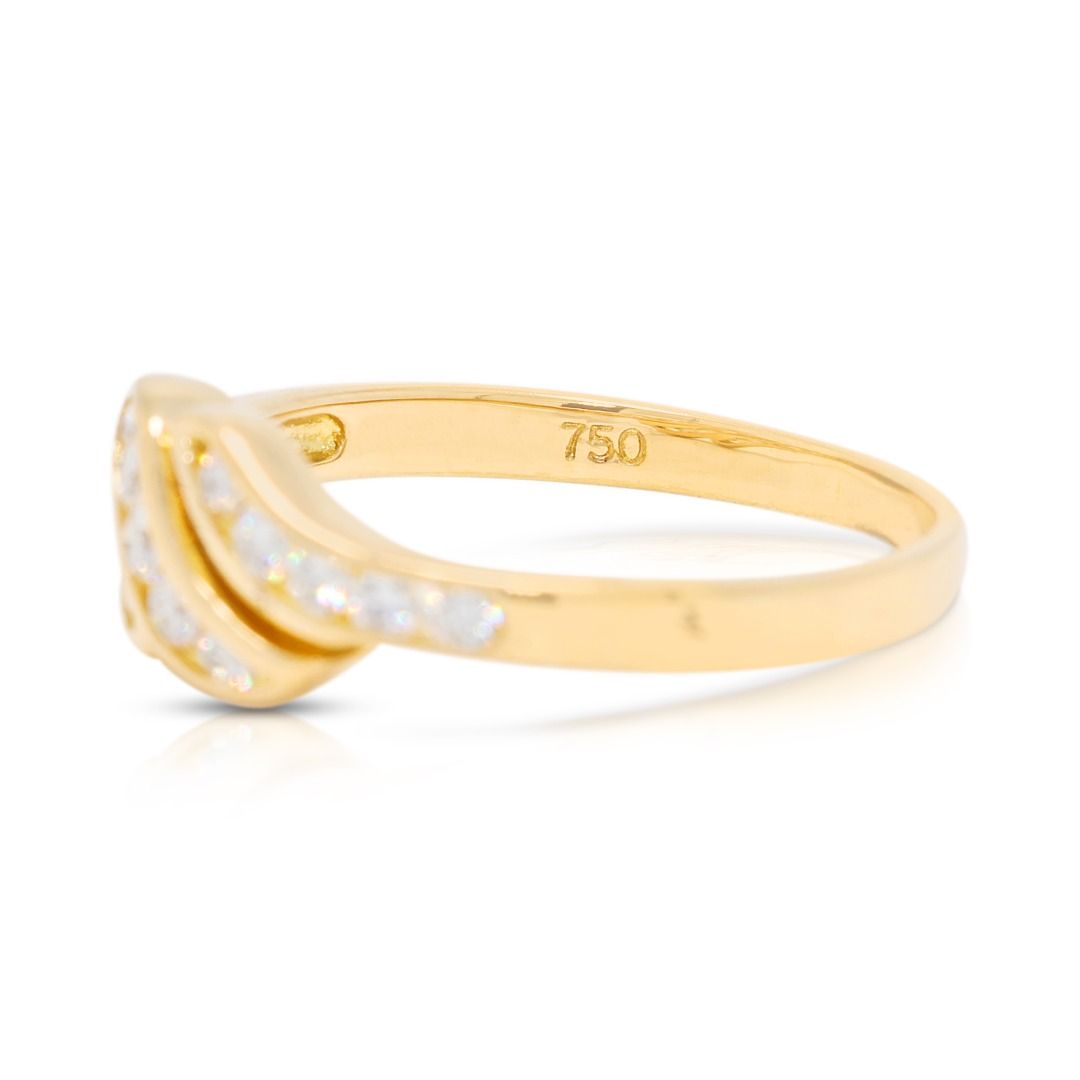 נגיעה זורמת של ברק—טבעת אלגנטית זו משובצת ב-15 יהלומים טבעיים בחיתוך עגול מבריק במשקל כולל של 0.18 קראט (צבע G-H, ניקיון VS), המשובצים לאורך רצועות מתפתלות דמויות גל. עשויה מזהב צהוב מלוטש 18K, משקלה 2.39 גרם ומתאימה למידה 48.5EU / 10HK.