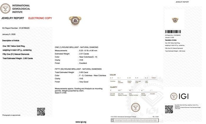 טבעת יהלומים עוצרת נשימה זו מציגה יהלום מרכזי מרהיב בחיתוך עגול מבריק במשקל 2.01 קרט, בחיתוך מומחה בסטנדרטים מצוינים לברק ונצנוץ מקסימליים. הוא משלים להפליא על ידי 50 יהלומי צד עגולים בסך כולל של 0.65 קרט, המשובצים בקפידה כדי להעצים את נוכחותה היוקרתית של הטבעת. מעוצבת בזהב צהוב עשיר 18 קראט, עיצוב מתוחכם זה מאזן אלגנטיות נצחית עם תחכום זוהר. יצירת מופת מתועדת IGI, מושלמת לציון הרגעים המשמעותיים ביותר בחיים.
