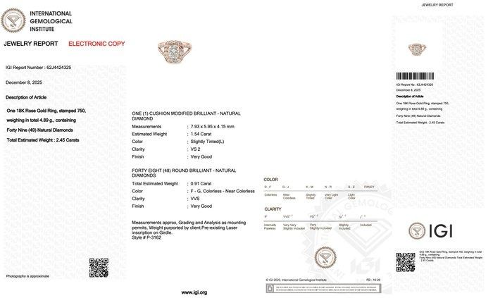 טבעת הילה אלגנטית זו, משובצת יהלום בחיתוך כרית במשקל 2.45 קרט, בזהב ורוד 18 קראט, היא הצהרה נצחית של יוקרה מעודנת ורומנטיקה מודרנית. במרכזה ניצב יהלום מרהיב בחיתוך כרית במשקל 1.54 קרט, המודגש להפליא על ידי שיבוץ זהב ורוד. סביב האבן המרכזית משובצים 48 יהלומים עגולים בחיתוך בריליאנט, במשקל כולל של 0.91 קרט, היוצרים הילה זוהרת וברק בסגנון פאווה הממקסם את הניצוץ מכל זווית. מתועדת על ידי IGI, יצירה זו אידיאלית עבור אלה המחפשים טבעת אירוסין יוקרתית משובצת יהלומים, טבעת הילה בחיתוך כרית, או טבעת יהלומים יוקרתית מזהב ורוד, המשלבת יופי קלאסי עם סגנון עכשווי.