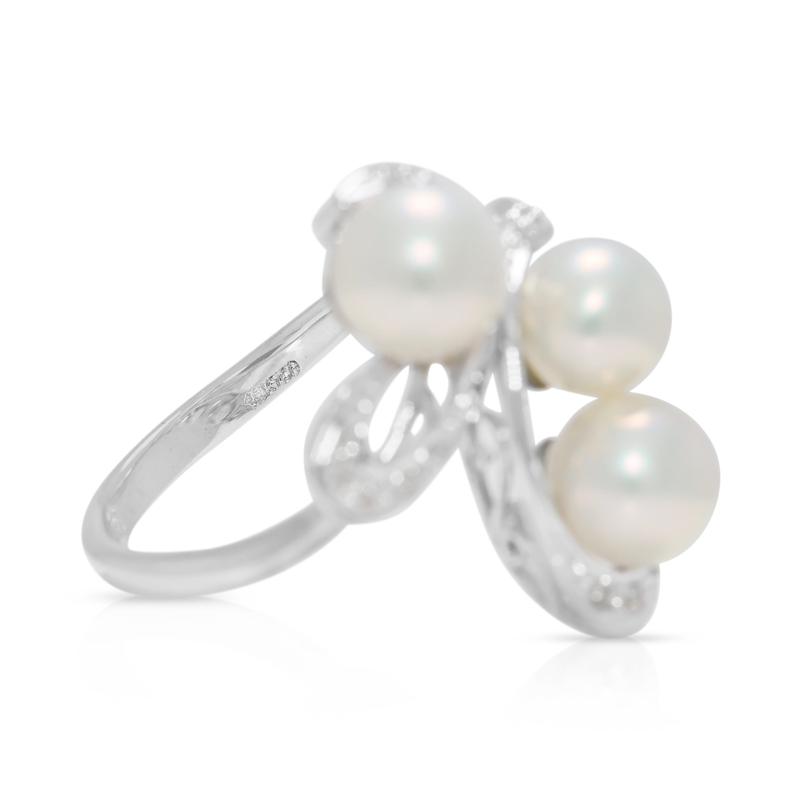 טבעת זהב לבן 18 קראט אלגנטית עם יהלום טבעי במשקל 0.05 קראט ופנינת אקויה