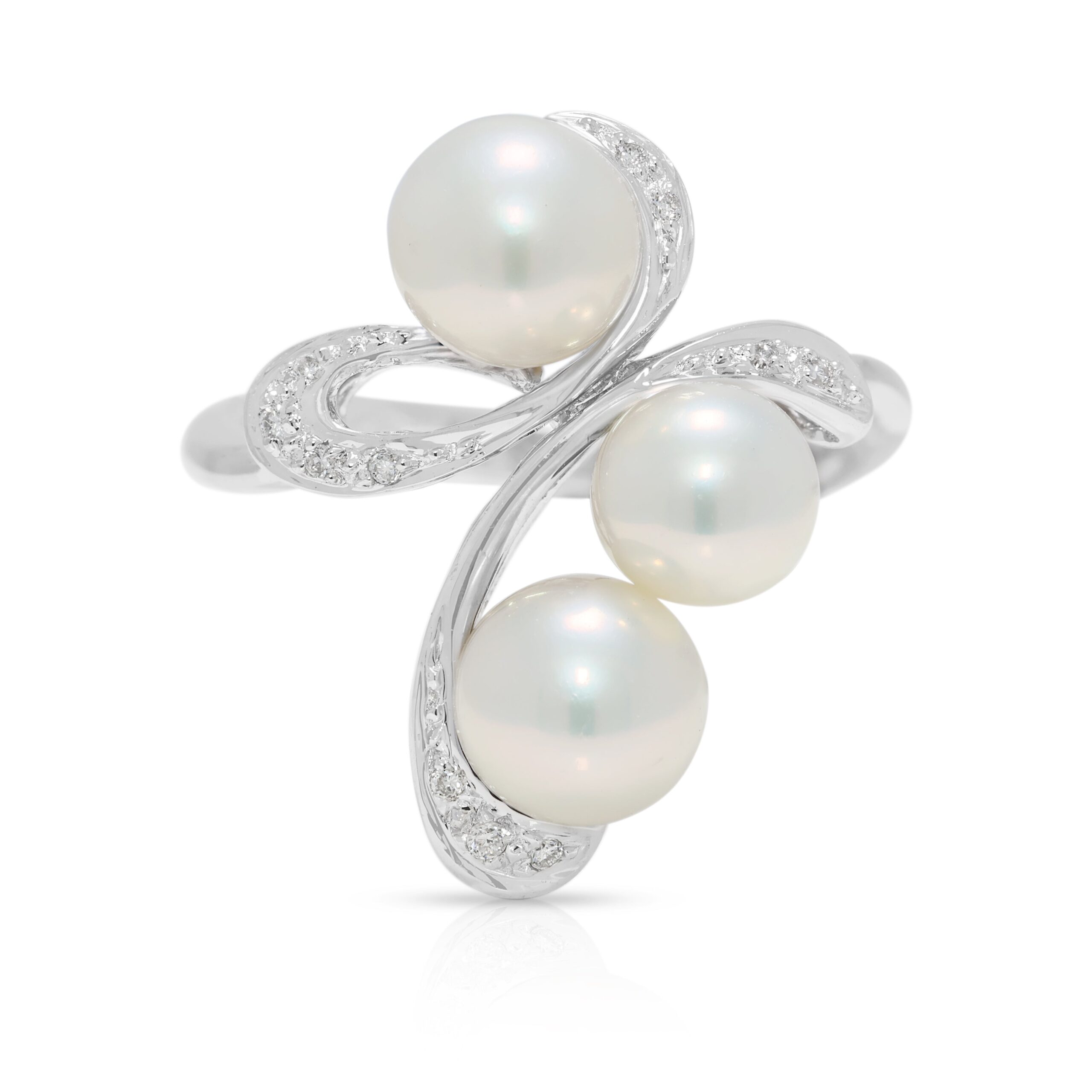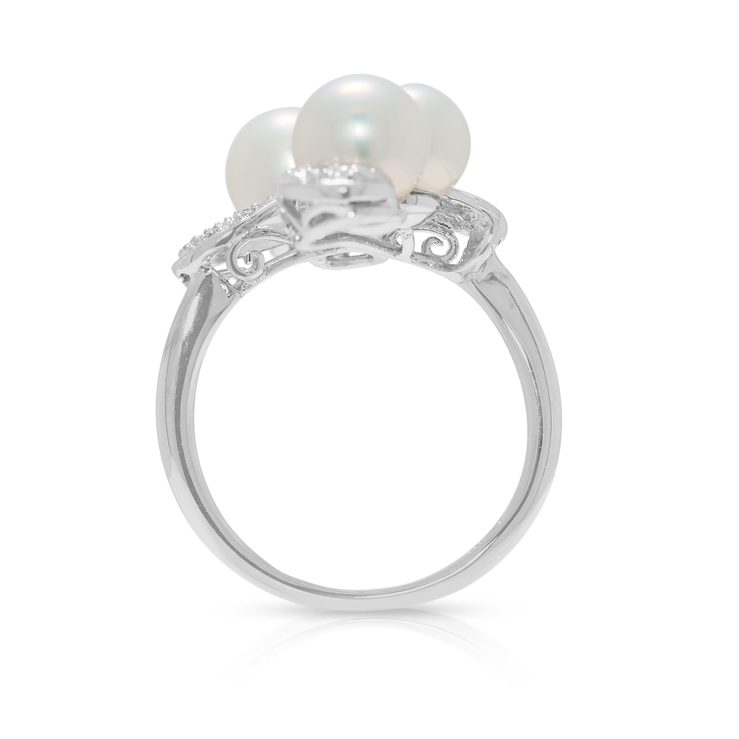 עטרו את ידכם באלגנטיות החיננית של טבעת זו, שנוצרה בקפידה מזהב לבן 18 קראט זוהר. יצירה כובשת זו מציגה עיצוב עדין וזורם, המבליט להפליא שלוש פניני אקויה זוהרות, שקוטר כל אחת נע בין 6.1 מ"מ ל-6.3 מ"מ, וזוהרות בגוון ורדרד-לבן רך. פנינים עגולות ומושלמות אלו שזורות באלגנטיות בסרט מנצנץ של אחד עשר יהלומים טבעיים עגולים ונוצצים בחיתוך בריליאנט, במשקל כולל מדויק של 0.05 קראט. כל יהלום מתהדר בצבע G-H מרשים ובניקיון VS-SI, ומוסיף ניצוץ עדין אך כובש המשלים את יופיין השלו של הפנינים. עם משקל תכשיט כולל ונוח של 5.13 גרם ובמידה 53.5 EU / 14.5 HK, טבעת זו היא עדות אמיתית לטעם מעודן ולתחכום נצחי, מושלמת להוספת נגיעה של זוהר מאופק לכל אירוע.