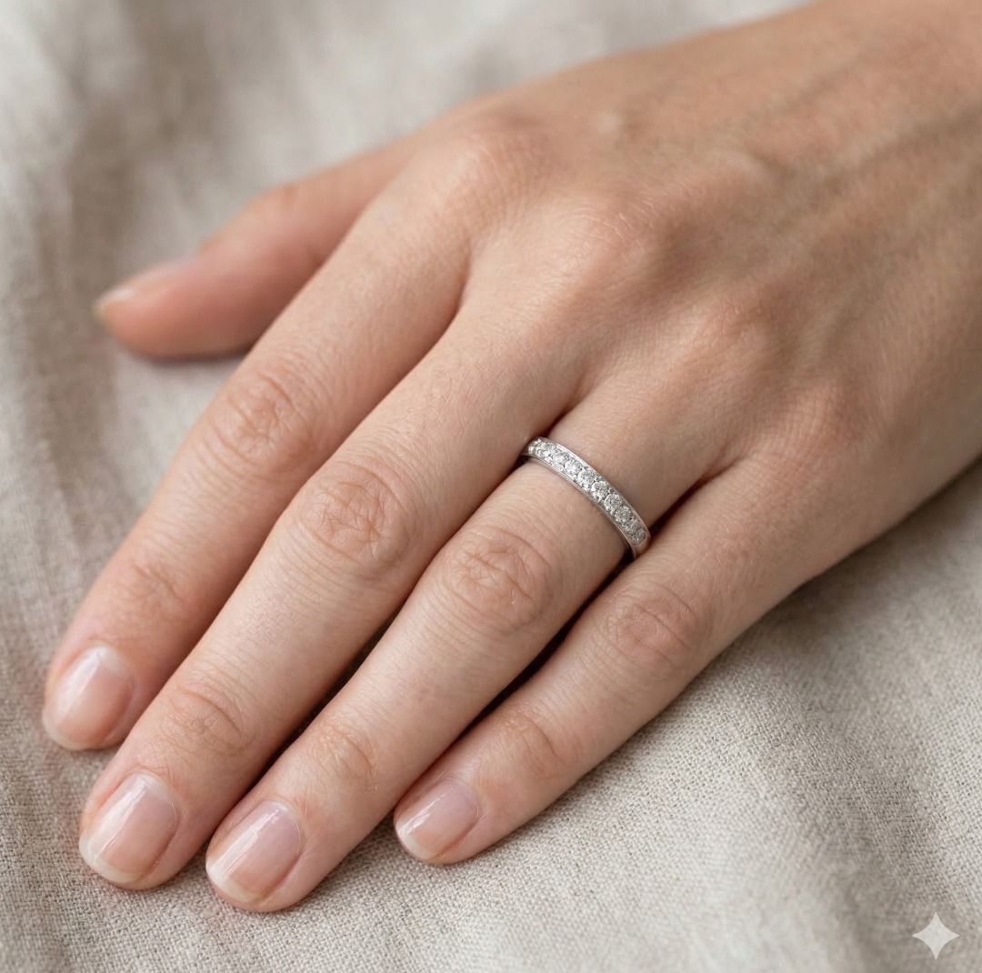 ברק אינסופי, אלגנטיות קלאסית. טבעת חצי אינסוף זו, מזהב לבן 18K, משובצת ב-10 יהלומים טבעיים בחיתוך עגול מבריק (סה"כ 0.30 קרט), בצבע G–H וניקיון VS, המשובצים ברצועה חלקה ורציפה המסמלת אהבה נצחית. עם משקל כולל של 0.30 קרט, משקל תכשיט של 3.25 גרם, ומידה EU56 / HK17, היא עוצבה עבור אספנים המשתוקקים לברק מעודן, אומנות עמידה, וצללית המקרינה תחכום נצחי.