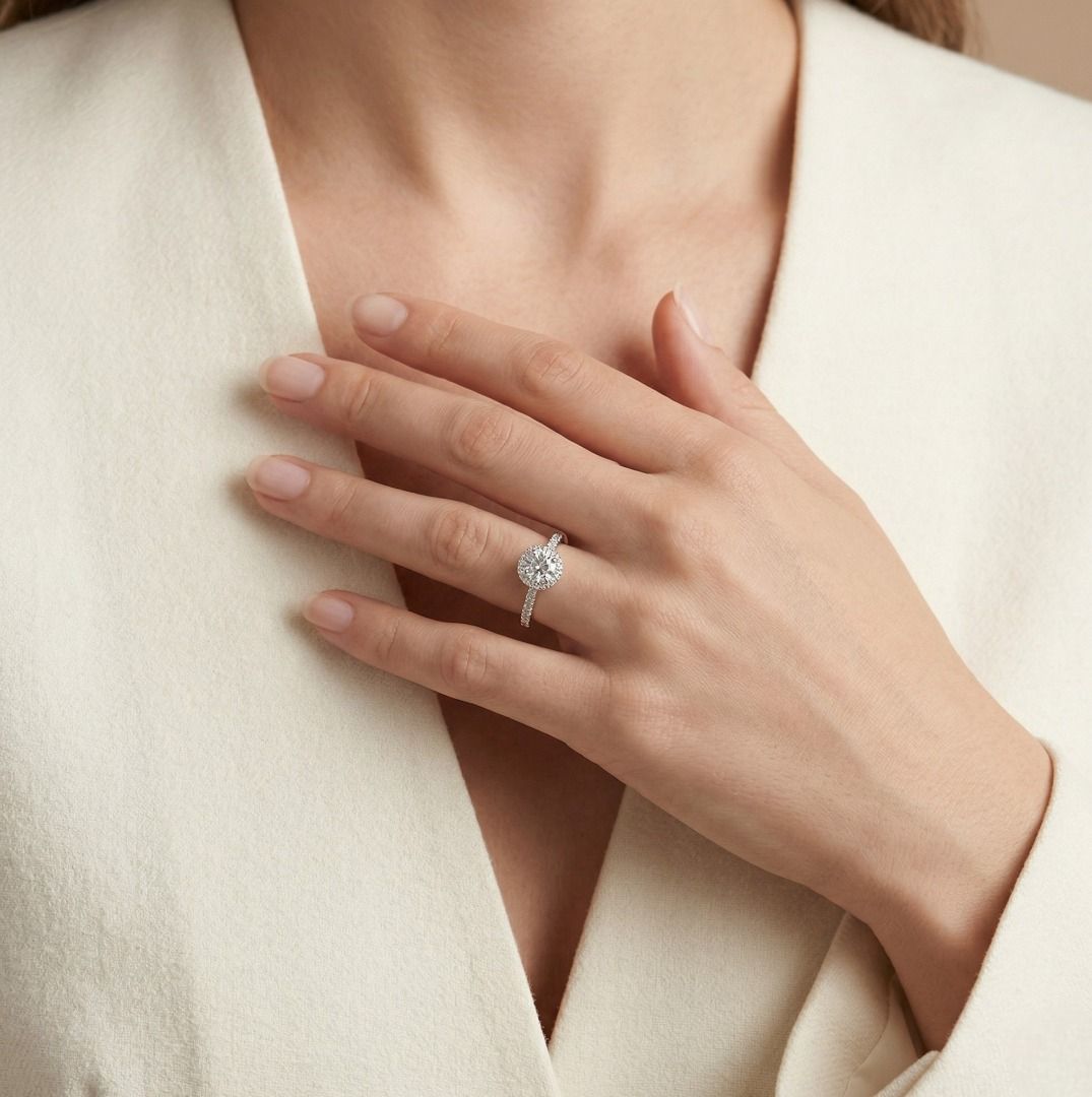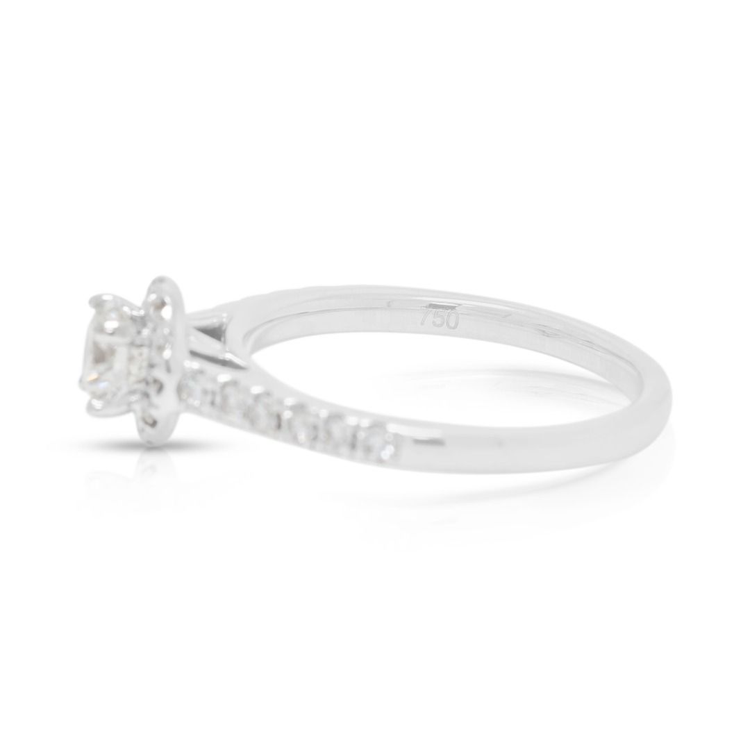 טבעת אלגנטית זו של Meyson Jewelry מעוצבת בזהב לבן 18K, ומציגה יהלום עגול מבריק ומהמם במשקל 0.41ct (צבע G, ניקיון VVSI) במרכזה. מוקפת בהילה ופס פאווה של 24 יהלומים עגולים מבריקים (סה"כ 0.30ct, צבע F–G, ניקיון VS), היא מגיעה למשקל כולל של 0.71ct. עם משקל תכשיט של 3.41g ומידה 51EU/12HK, היא מקרינה זוהר ואומנות מעודנת. מתועדת על ידי GIA, יצירה יוקרתית זו מבטיחה אותנטיות ואלגנטיות נצחית, מושלמת לאירוסין או לאוספי תכשיטים יוקרתיים.