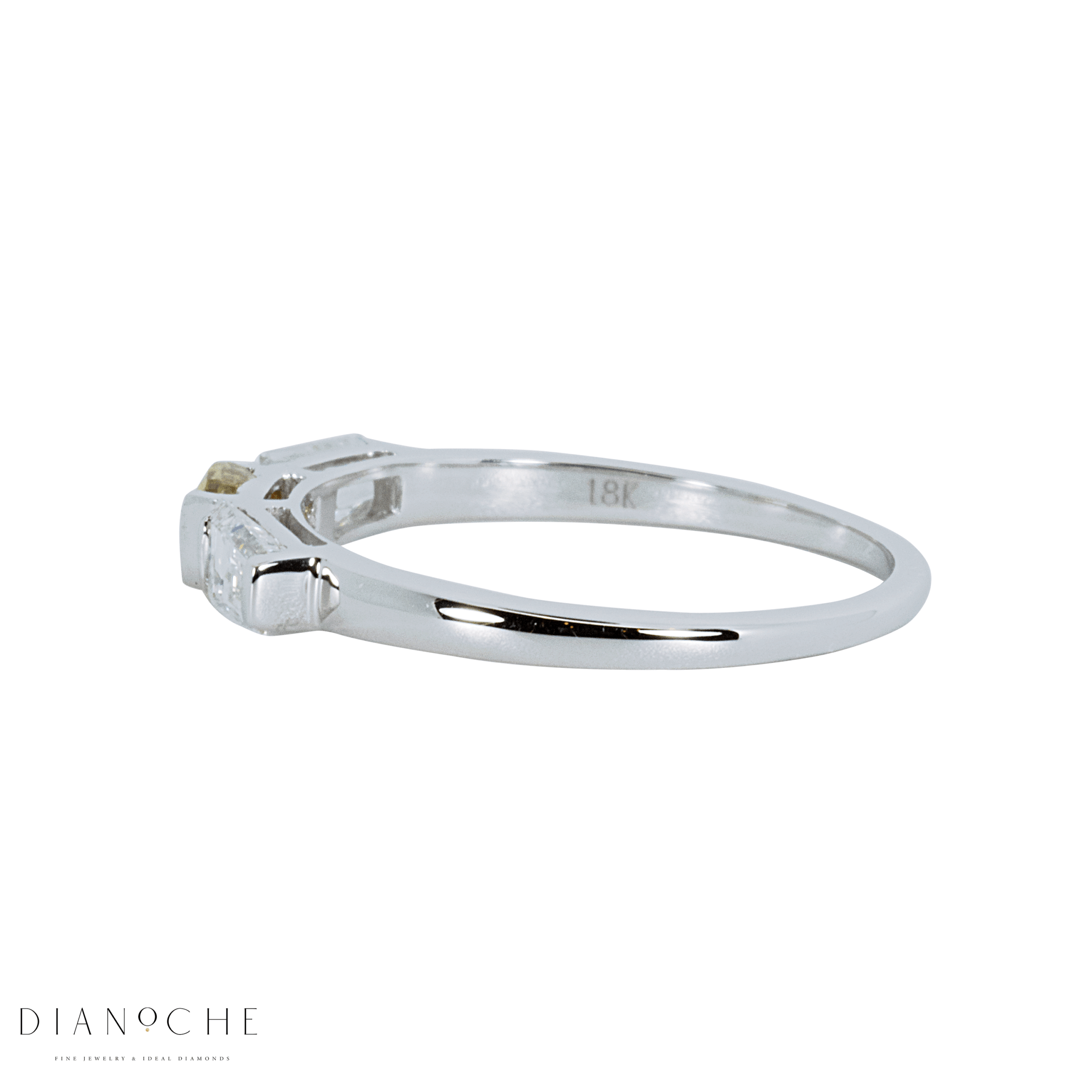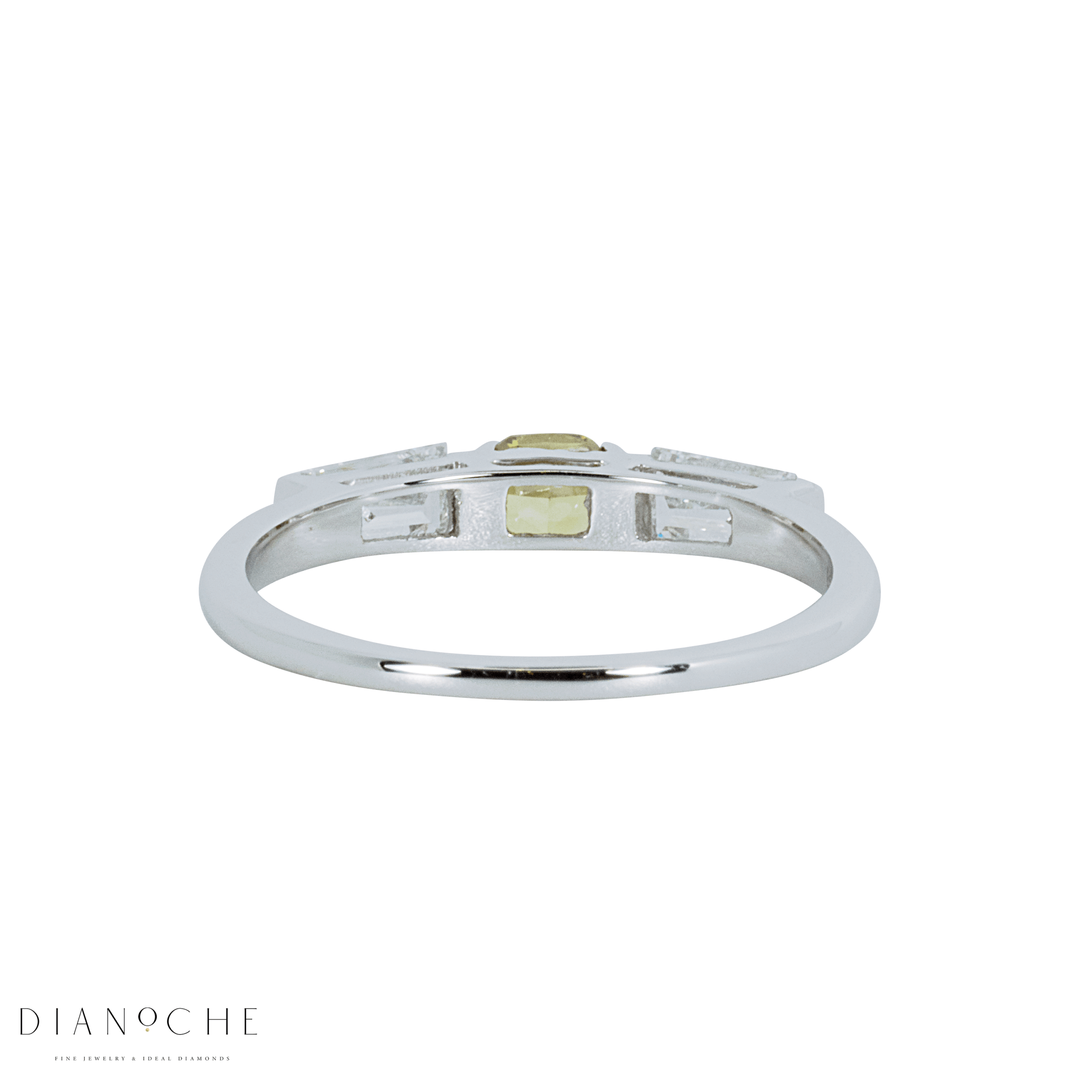 טבעת יהלומים בעיצוב שורה מיוחד משובצת יהלום מרכזי טבעי חום ירקרק ויהלומי צד בליטוש טייפרים. זהו מראה מאוד עדין אבל מיוחד ללא אבן אחת בולטת ויתאים ללא מעט נשים שלא מתחברות לצורות הסטנדרטיות של טבעות יהלומים.