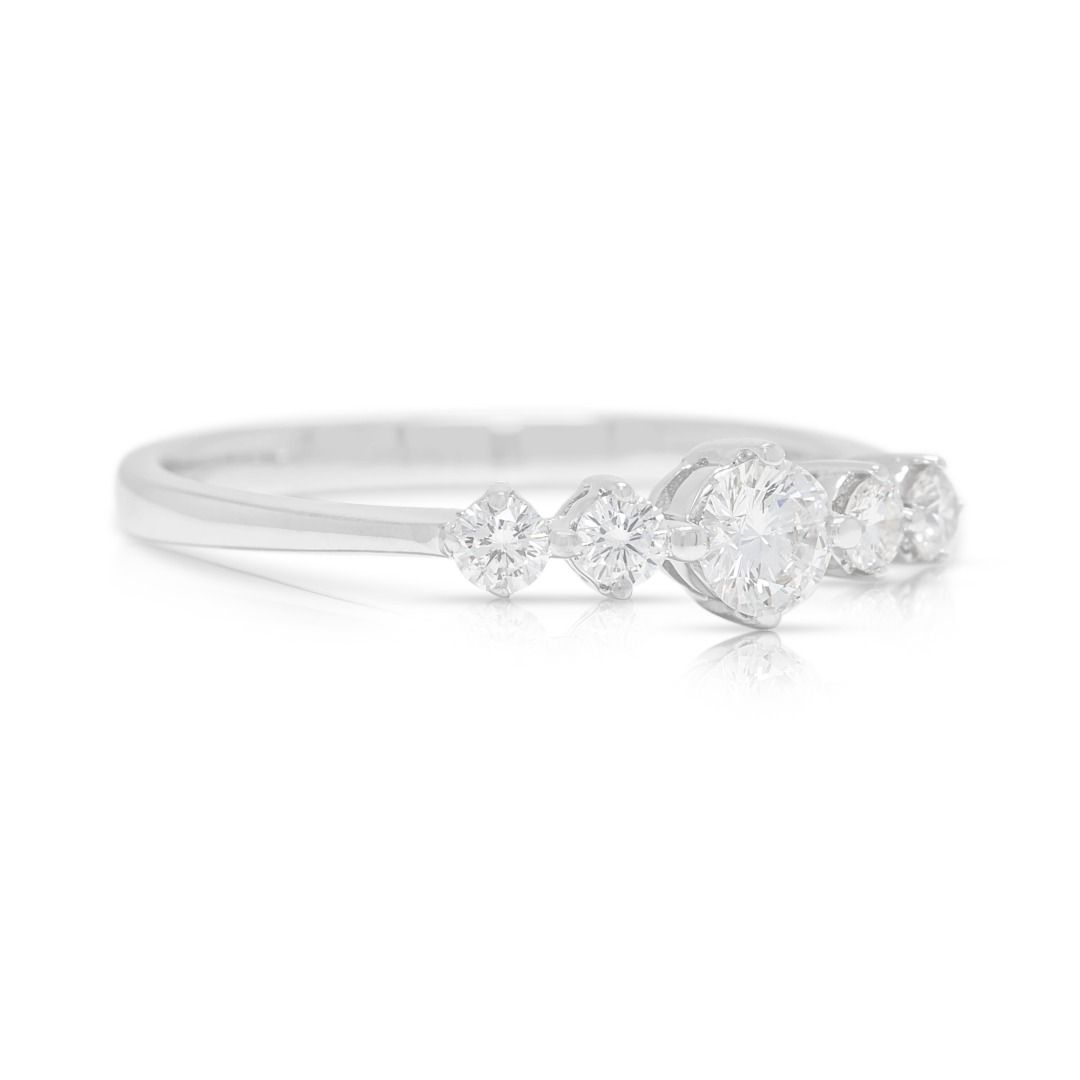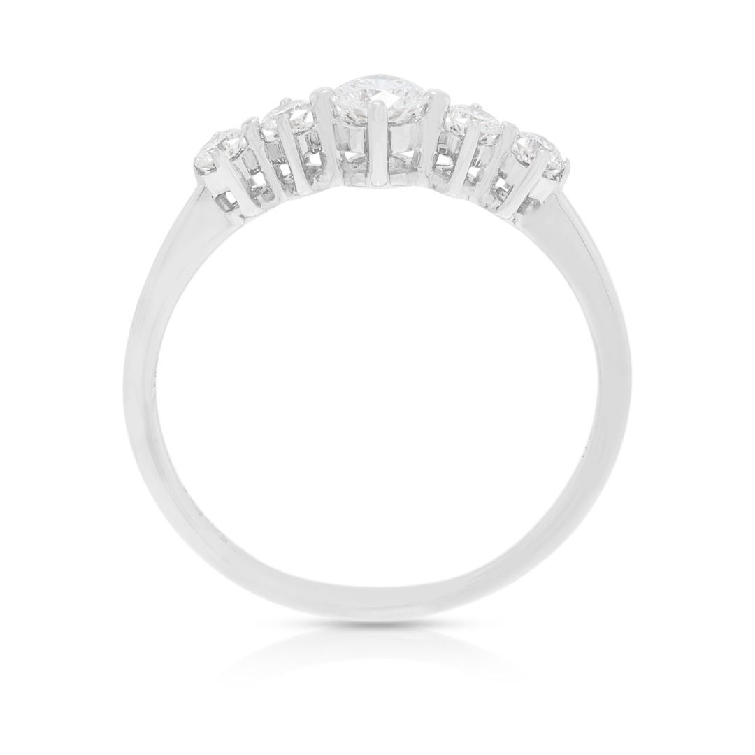 עוצבה בזהב לבן 18 קראט, טבעת זו משובצת בחמישה יהלומים עגולים בחיתוך בריליאנט (סה"כ 0.28 קראט, צבע G–H, ניקיון VS) המסודרים בעיצוב שורה מעודן. היהלום המרכזי גדול במעט, ויוצר צללית מאוזנת עם ברק נוסף. במשקל תכשיט של 1.84 גרם ובמידה 49.5EU/11HK, היא מציעה נוחות קלה וניצוץ נצחי. יצירה חיננית המשלבת פשטות מודרנית עם אלגנטיות קלאסית.