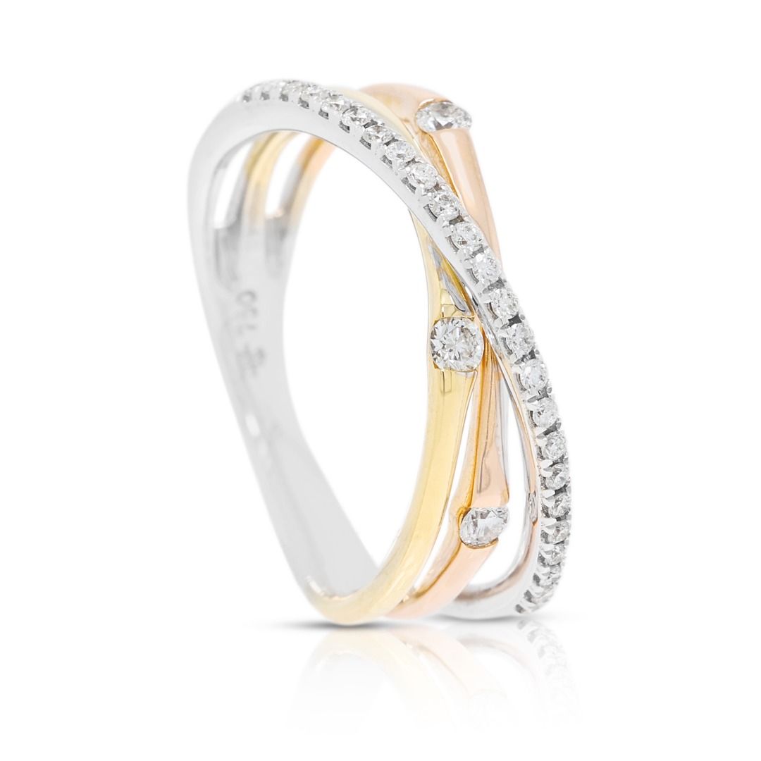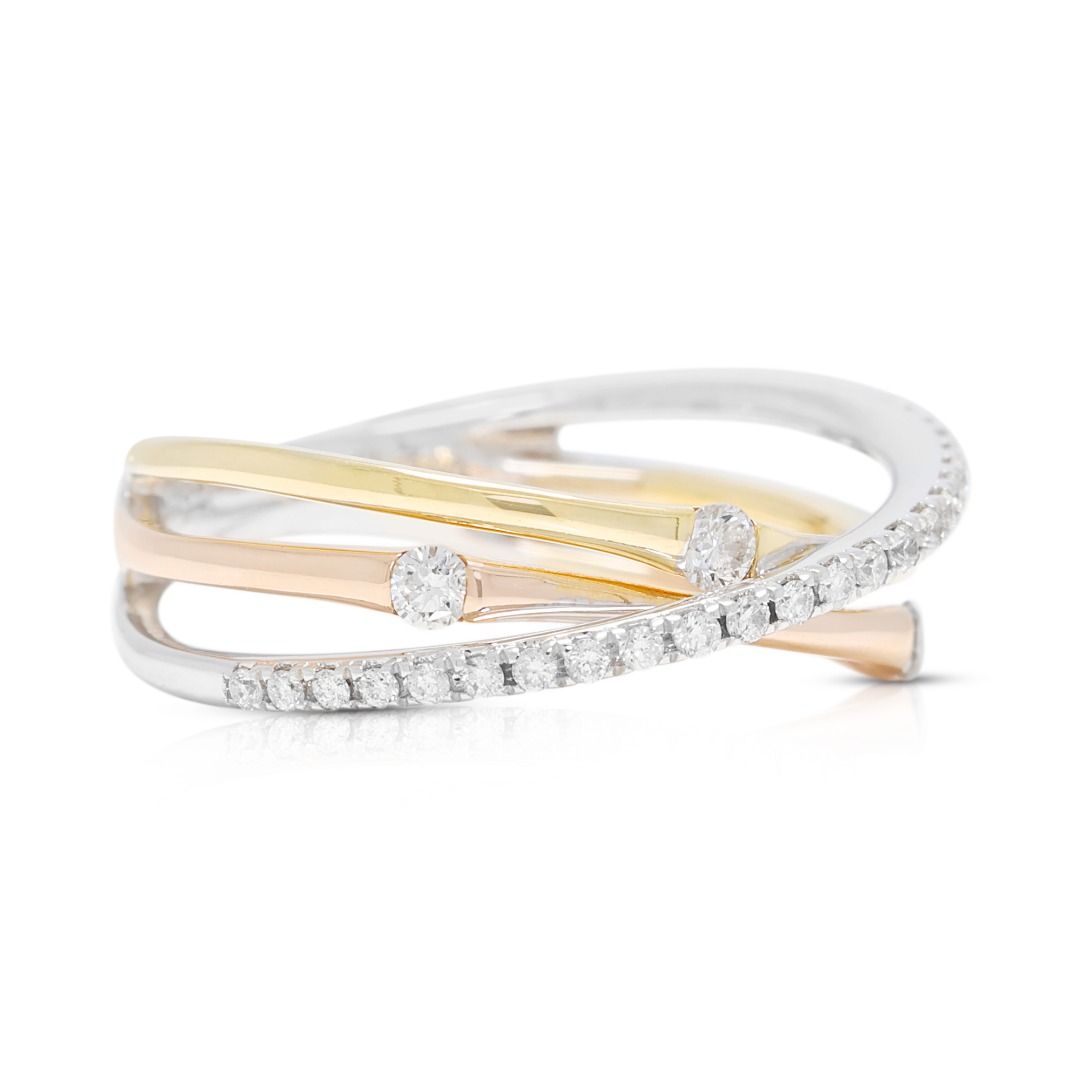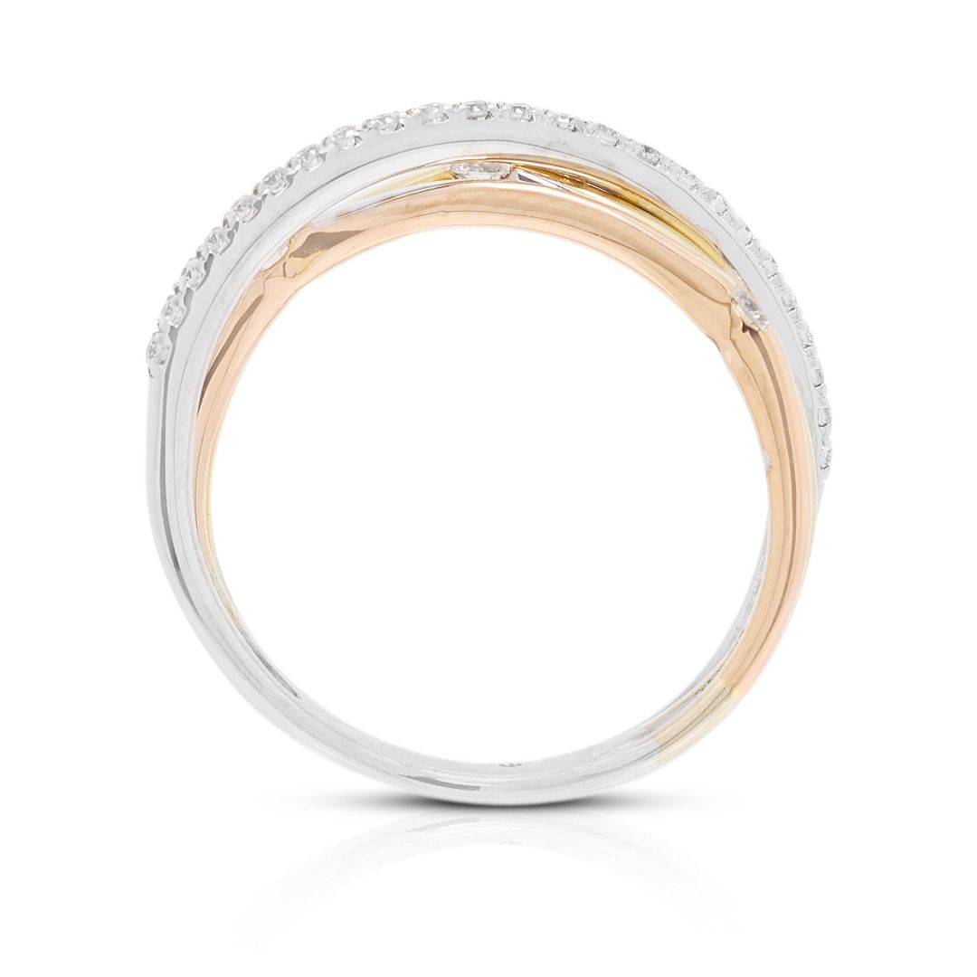 טבעת מסוגננת זו מעוצבת בזהב דו-גוני 18 קראט, משובצת ב-27 יהלומים עגולים בחיתוך בריליאנט (סה"כ 0.16 קראט, צבע G–H, ניקיון VS) המשובצים לאורך החישוק לברק זוהר. במשקל תכשיט של 2.73 גרם ובמידה 47EU/9HK, היא משלבת עיצוב מודרני עם אלגנטיות נצחית. פריט רב-גוני המדגיש אומנות וזוהר, מושלם כטבעת נישואין, טבעת יום נישואין, או הצהרה יומיומית של יוקרה.