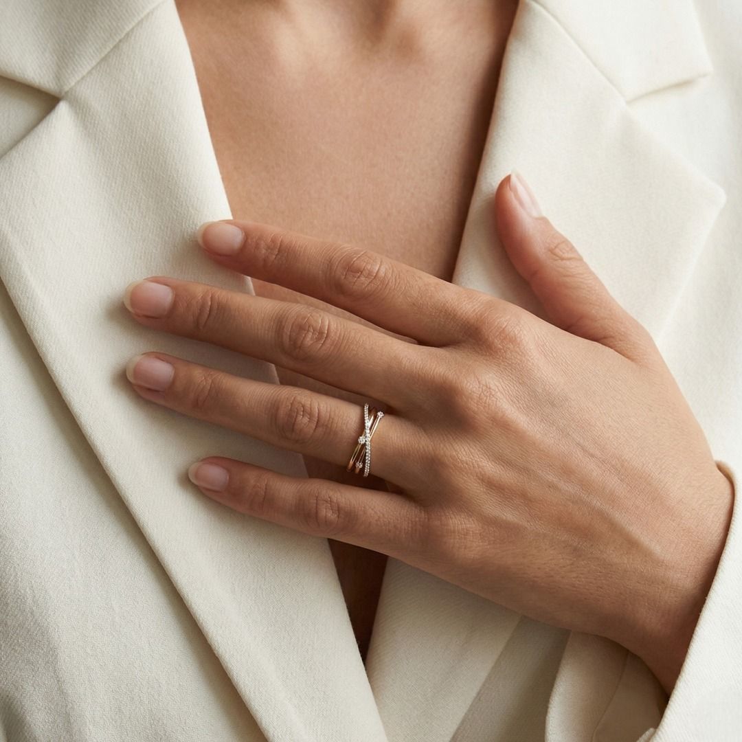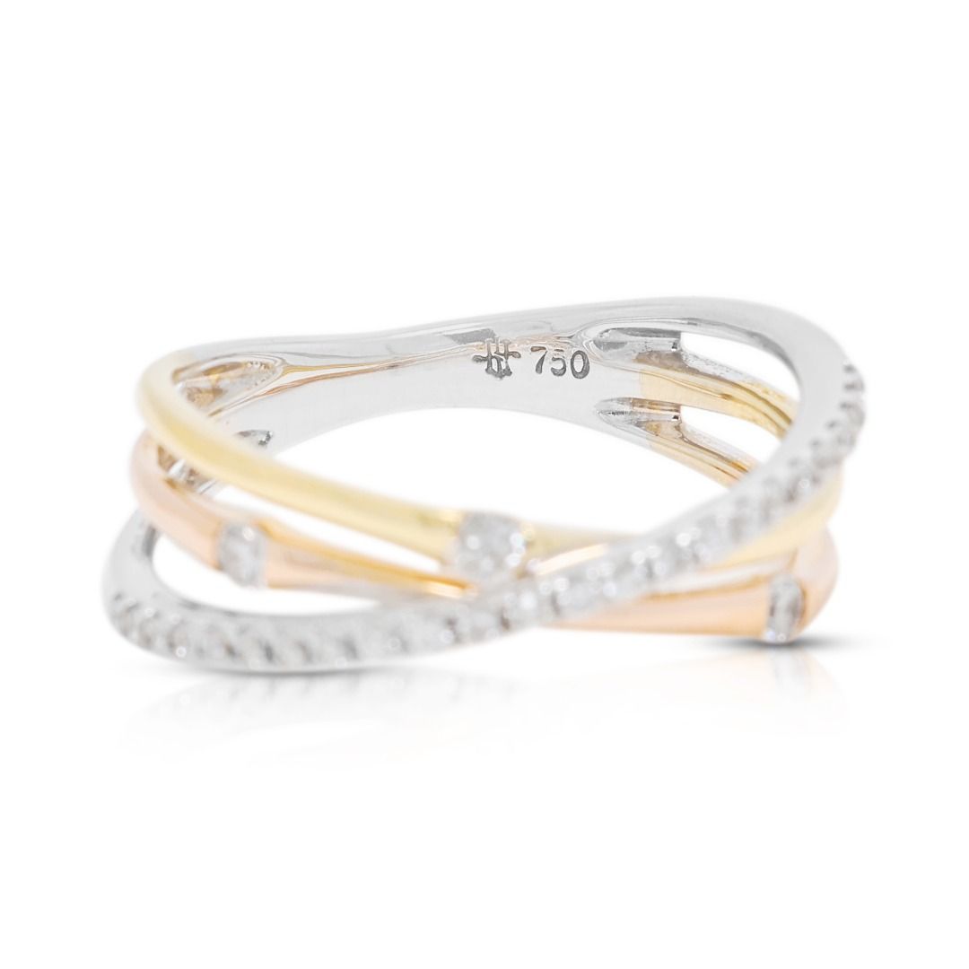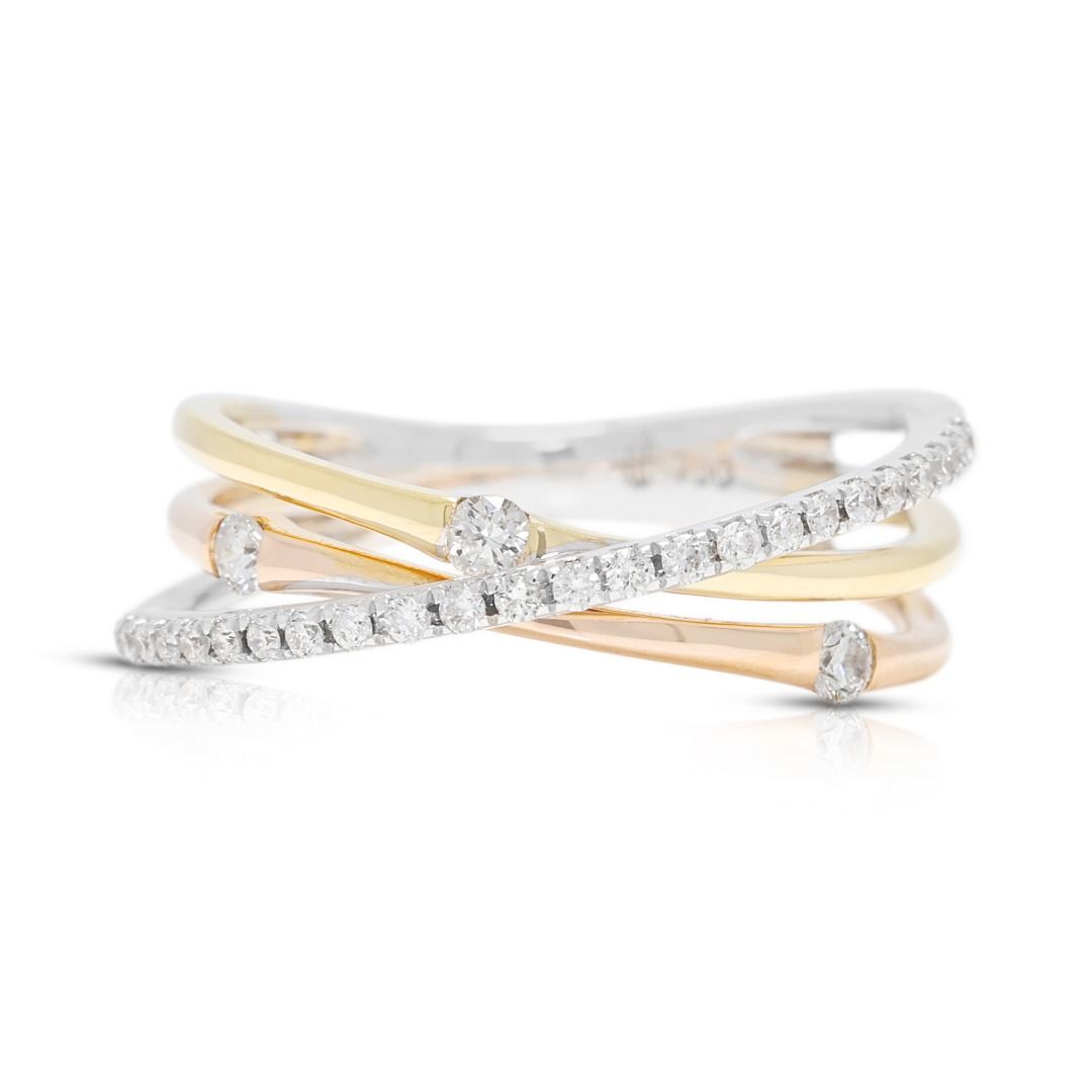 טבעת מסוגננת זו מעוצבת בזהב דו-גוני 18 קראט, משובצת ב-27 יהלומים עגולים בחיתוך בריליאנט (סה"כ 0.16 קראט, צבע G–H, ניקיון VS) המשובצים לאורך החישוק לברק זוהר. במשקל תכשיט של 2.73 גרם ובמידה 47EU/9HK, היא משלבת עיצוב מודרני עם אלגנטיות נצחית. פריט רב-גוני המדגיש אומנות וזוהר, מושלם כטבעת נישואין, טבעת יום נישואין, או הצהרה יומיומית של יוקרה.