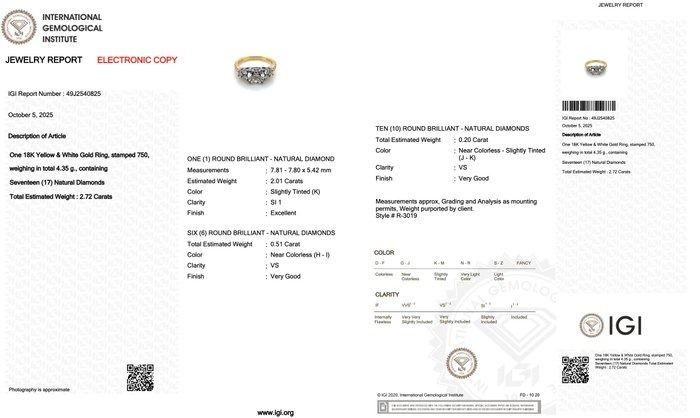 טבעת יהלומים נוצצת בשיבוץ יהלומים במשקל 2.72 קראט, בזהב 18 קראט צהוב ולבן – מתועדת IGI