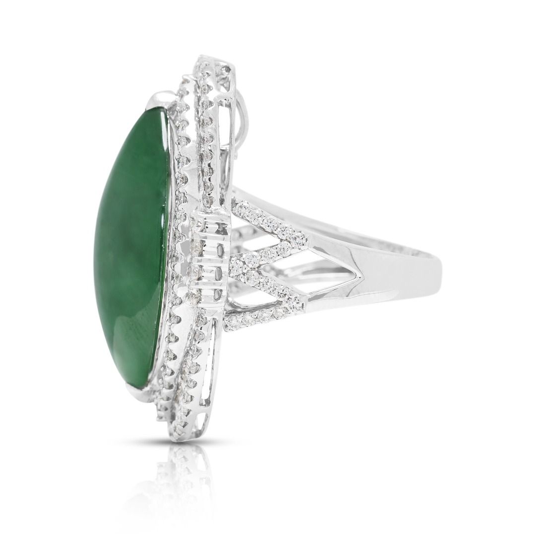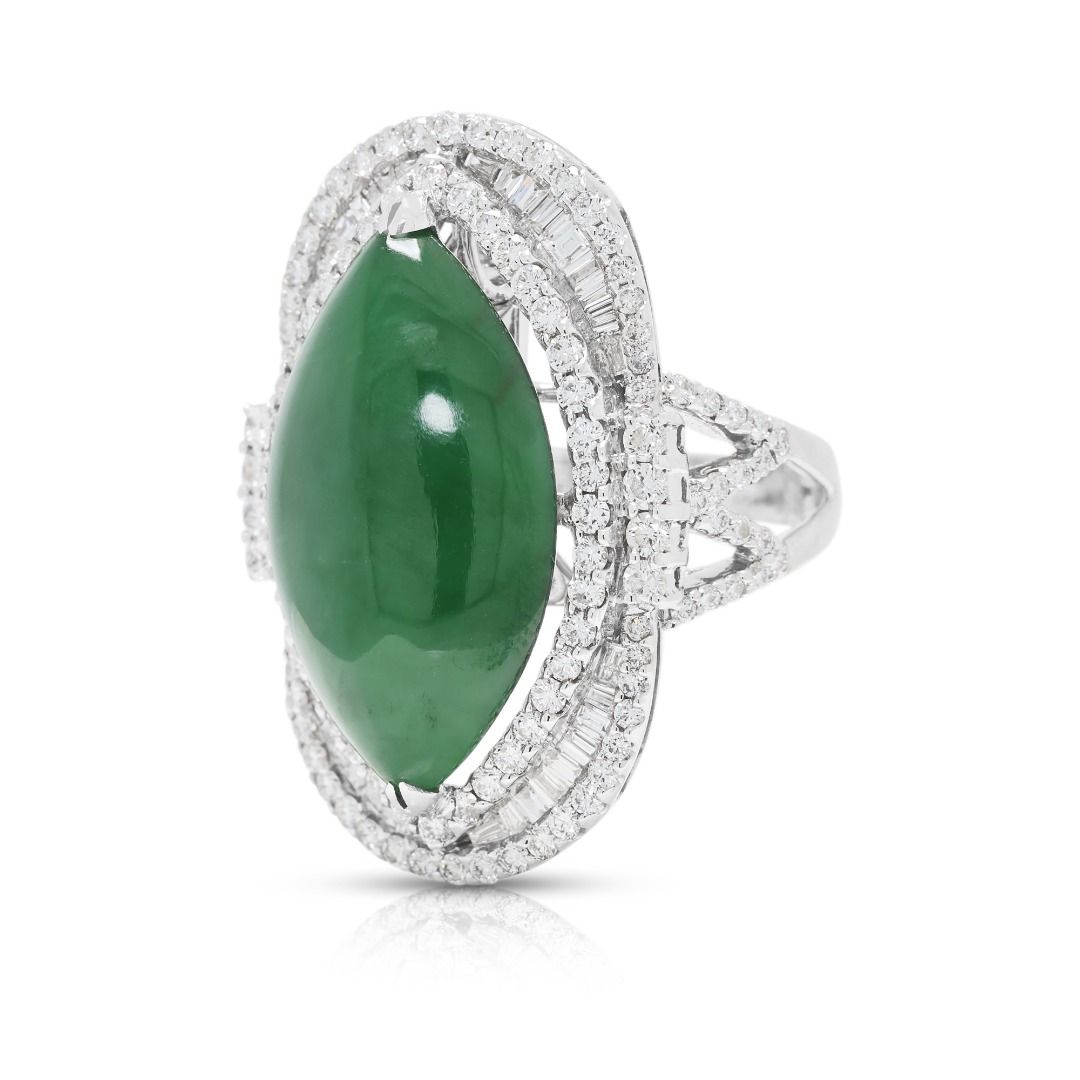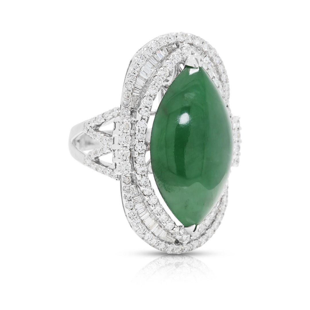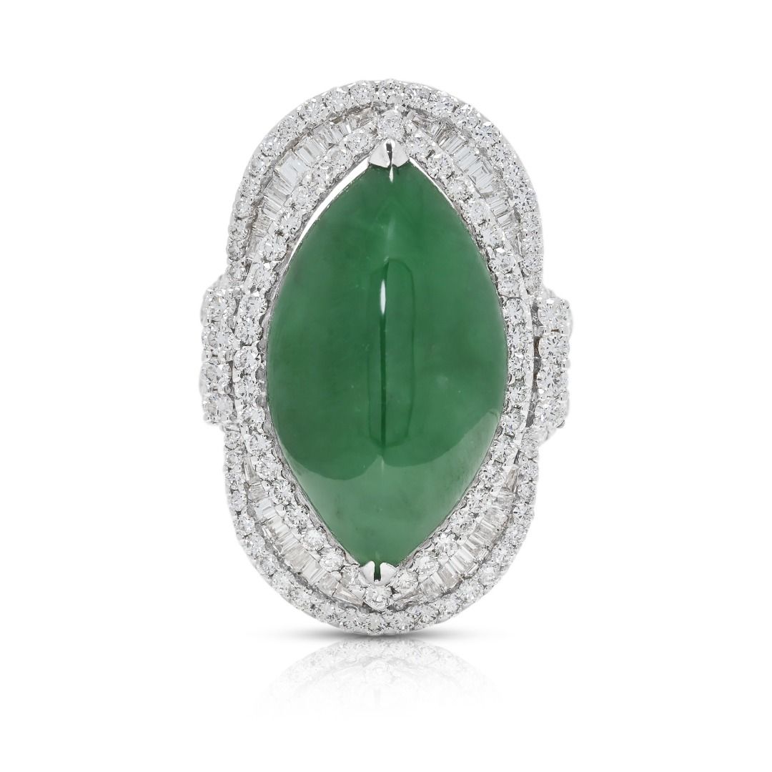 טבעת יוקרתית זו עשויה מזהב לבן 18 קראט, ומציגה ירקן פיי צוי בחיתוך מרקיזה מרהיב (24.82mm x 14.57mm x 6.15mm) בגוון ירוק עז. מוקף ב-131 יהלומים עגולים בחיתוך בריליאנט (סה"כ 1.37 קרט, צבע F–G, ניקיון VS) בשיבוץ פאווה הילה כפולה, הוא משיג ברק מעודן. במשקל תכשיט של 16.3 גרם ובמידה 53EU/14HK, הפריט מתועד על ידי NGI ו-HKJS, מה שמבטיח אותנטיות ואיכות. יצירה יוקרתית המשלבת אמנות ויוקרה, מושלמת לאספני תכשיטים יוקרתיים ייחודיים.
