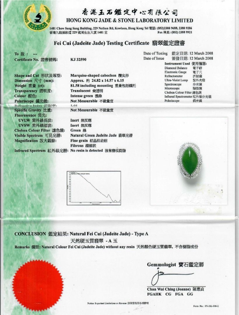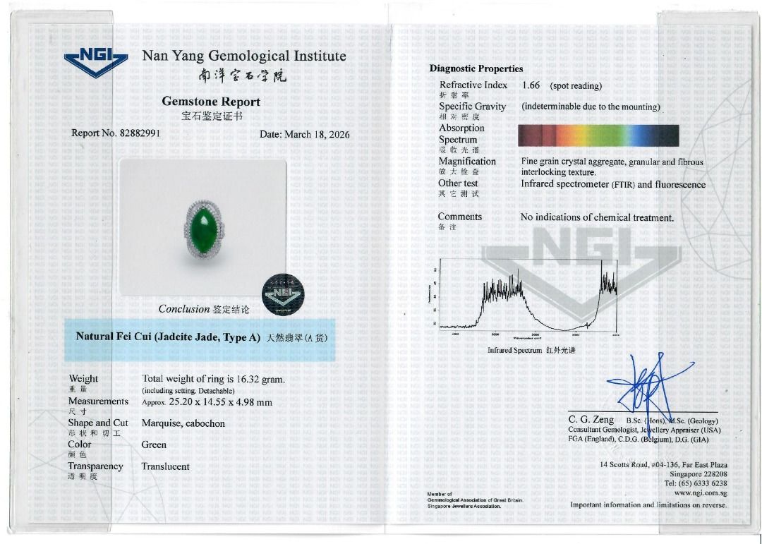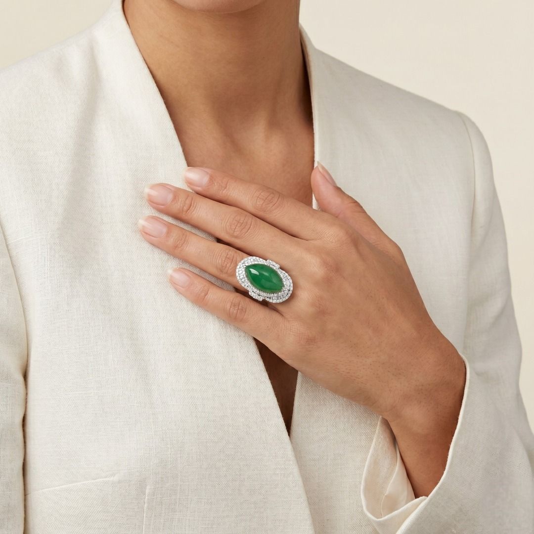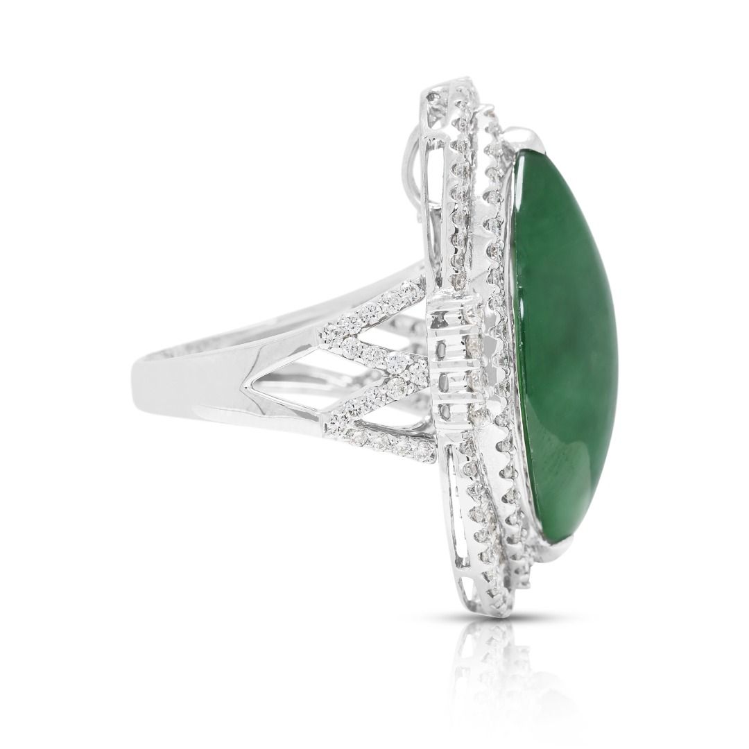 טבעת יוקרתית זו עשויה מזהב לבן 18 קראט, ומציגה ירקן פיי צוי בחיתוך מרקיזה מרהיב (24.82mm x 14.57mm x 6.15mm) בגוון ירוק עז. מוקף ב-131 יהלומים עגולים בחיתוך בריליאנט (סה"כ 1.37 קרט, צבע F–G, ניקיון VS) בשיבוץ פאווה הילה כפולה, הוא משיג ברק מעודן. במשקל תכשיט של 16.3 גרם ובמידה 53EU/14HK, הפריט מתועד על ידי NGI ו-HKJS, מה שמבטיח אותנטיות ואיכות. יצירה יוקרתית המשלבת אמנות ויוקרה, מושלמת לאספני תכשיטים יוקרתיים ייחודיים.