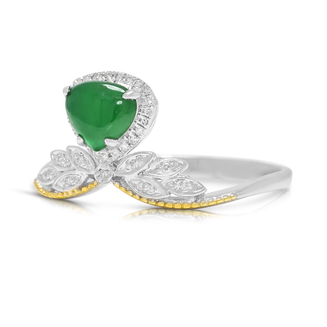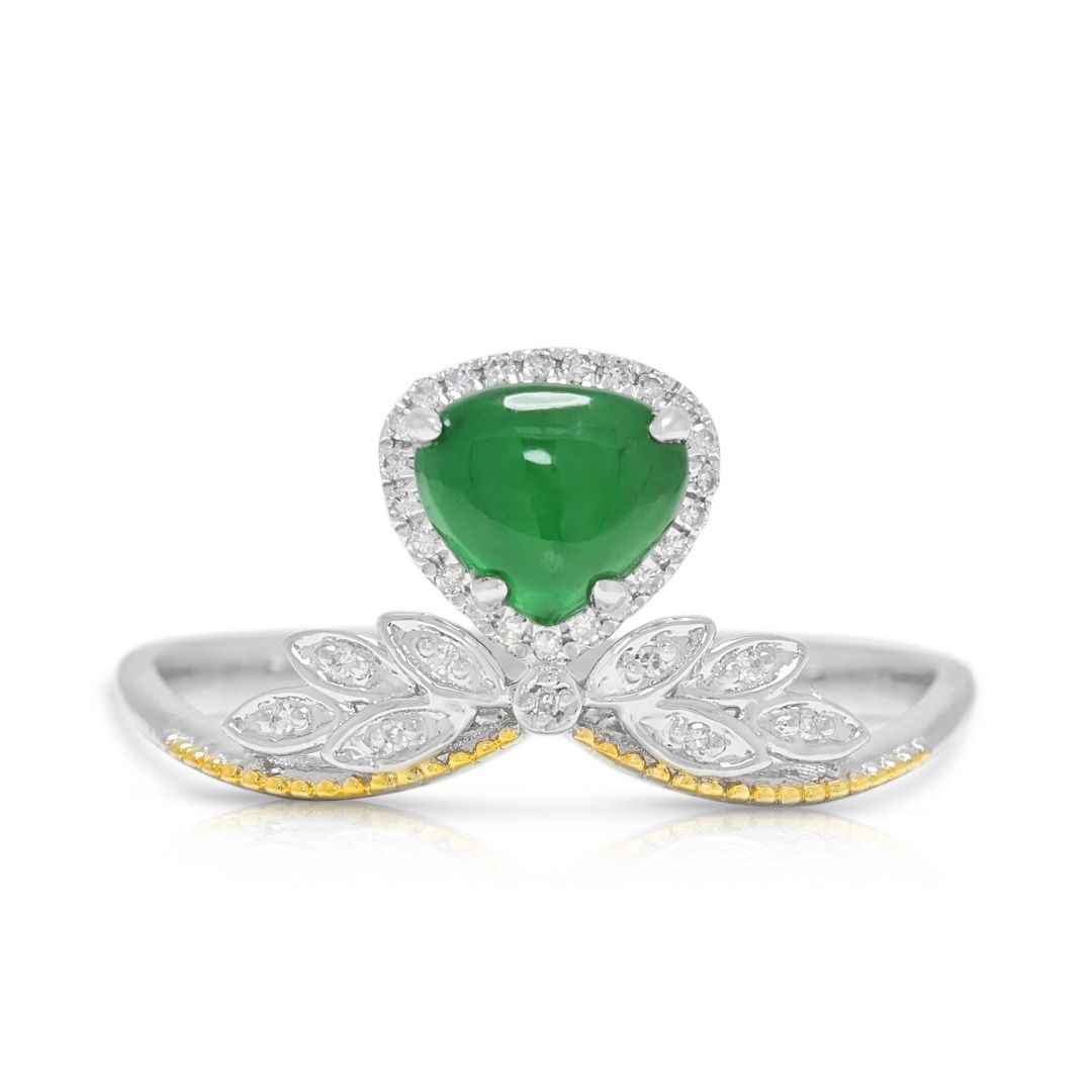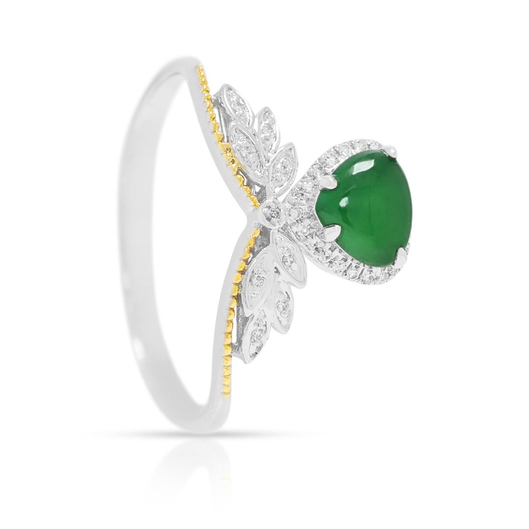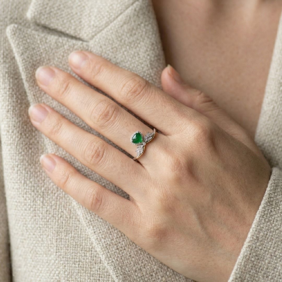 טבעת המשלבת מסורת עם עידון מודרני. עשויה מזהב דו-גוני 18 קראט, היא מציגה במרכזה אבן ג'ייד קבושון ירוקה בוהקת, מעוטרת ב-31 יהלומים עגולים בחיתוך בריליאנט (סה"כ 0.15 קראט, צבע H, ניקיון SI) המסודרים בהילה חיננית ובפרטי עיצוב בהשראת עלים. עם משקל יהלומים כולל של 0.15 קראט, משקל תכשיט של 1.83 גרם, ובמידה 56EU / 17HK, יצירה זו מגלמת אמנות, סמליות ותחכום נצחי.