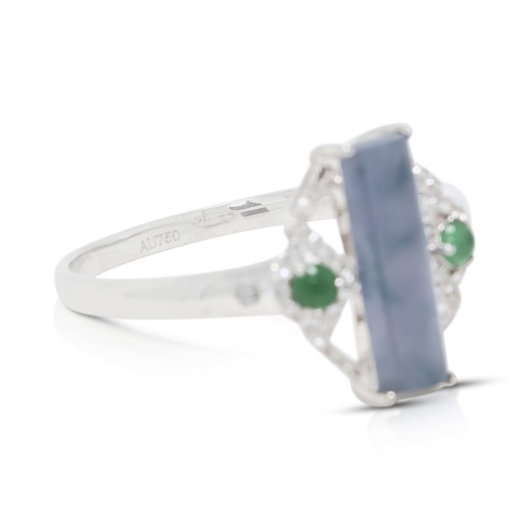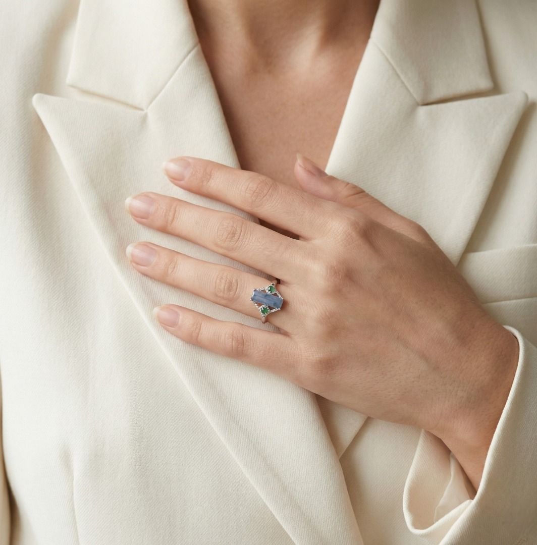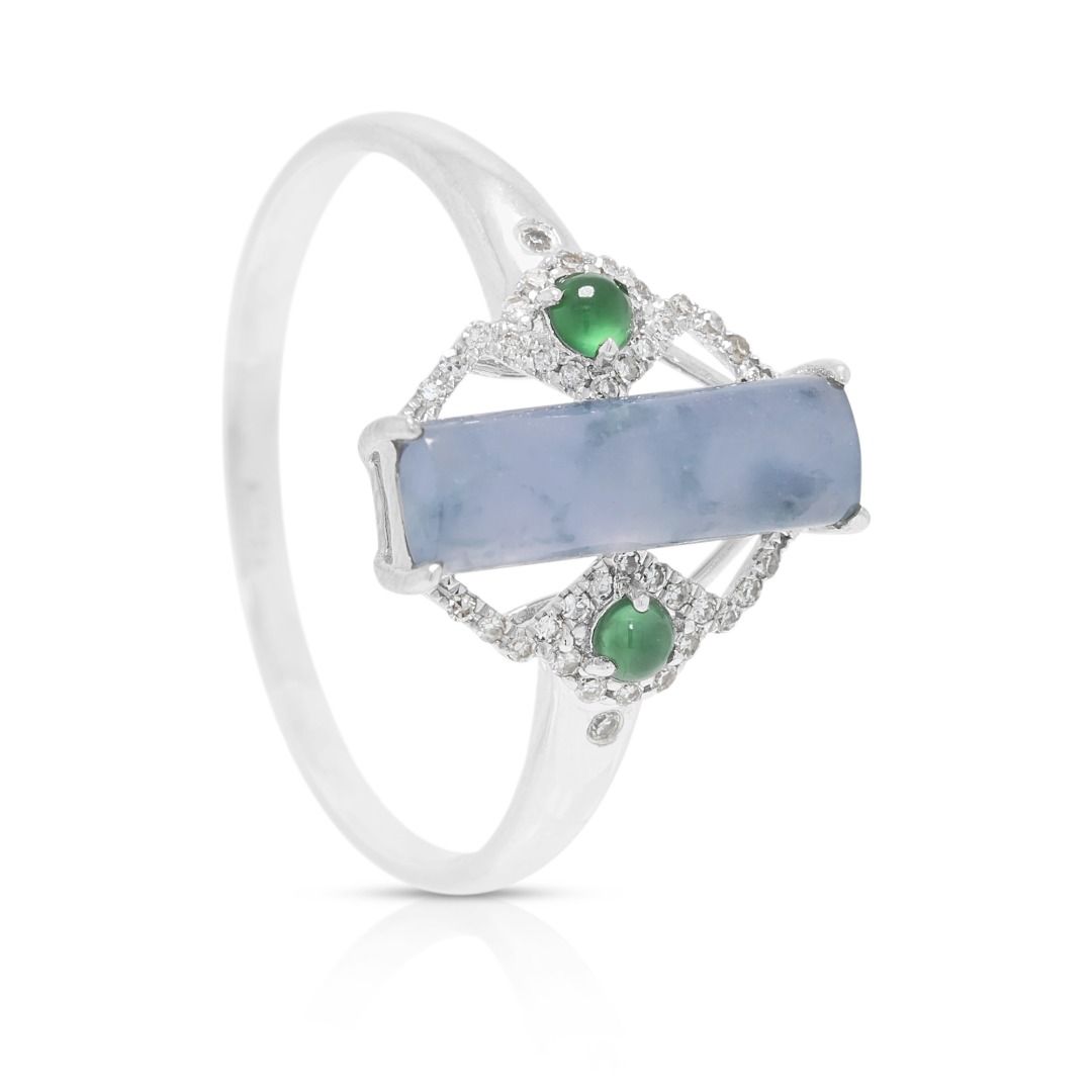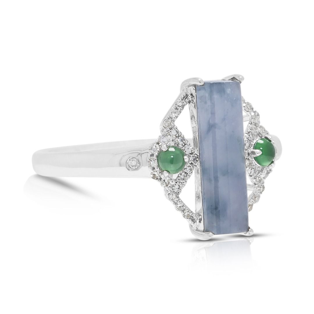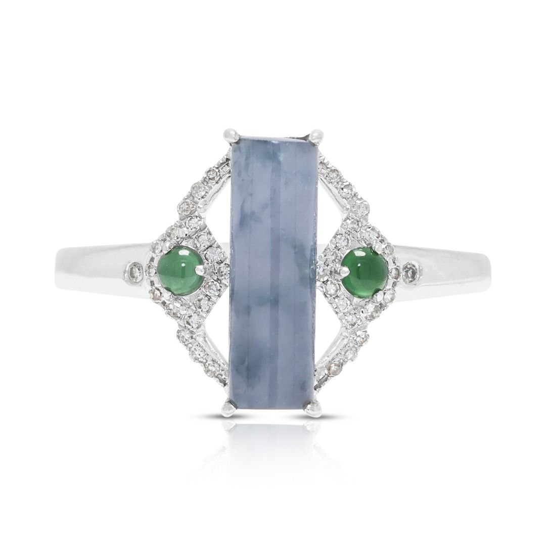 טבעת זו מציגה אבן ג'ייד מרכזית מרהיבה בחיתוך באגט, בגוון לבנדר כחלחל, בשילוב עם שתי אבני ג'ייד ירוקות בחיתוך קבושון, ליצירת ניגוד צבעים עשיר. משובצת בזהב לבן 18 קראט, העיצוב משופר על ידי 36 יהלומים עגולים בחיתוך בריליאנט (סה"כ 0.11 קרט, צבע H, ניקיון SI). במשקל תכשיט של 2.42 גרם ובמידה 56EU/17HK, היא משלבת גיאומטריה מודרנית עם אמנות נצחית. יצירה ייחודית החוגגת צבע, אומנות ואלגנטיות.