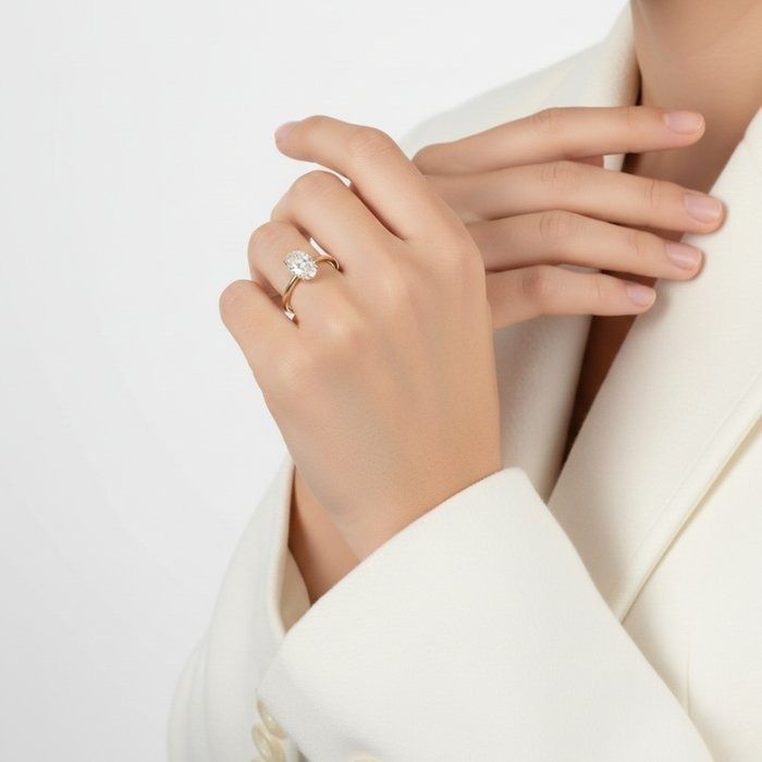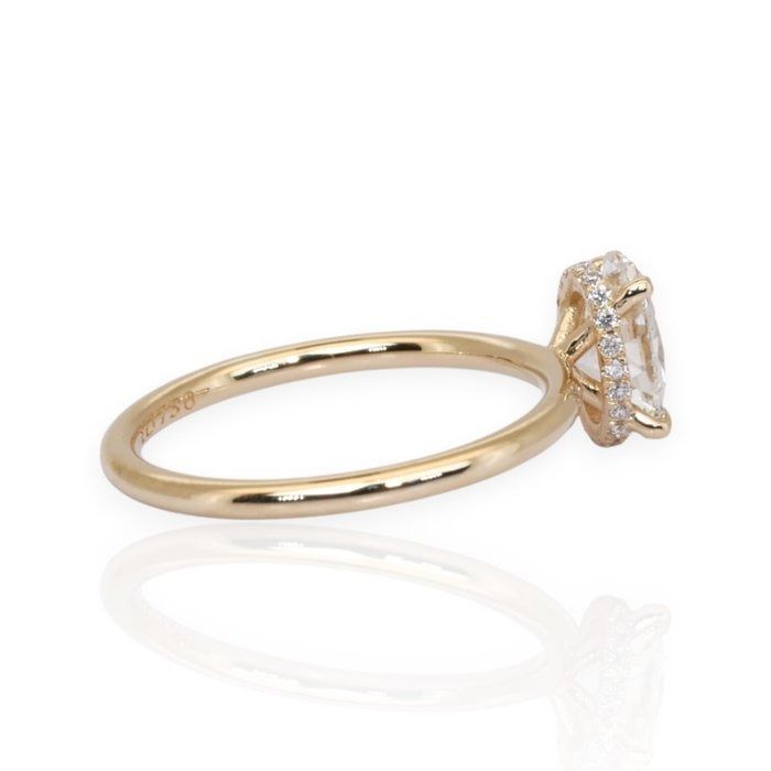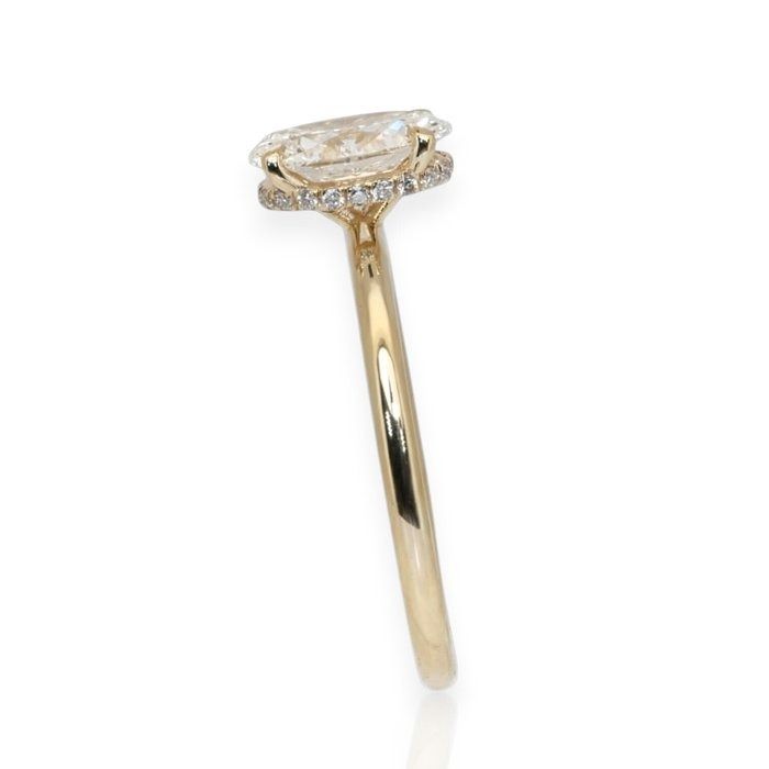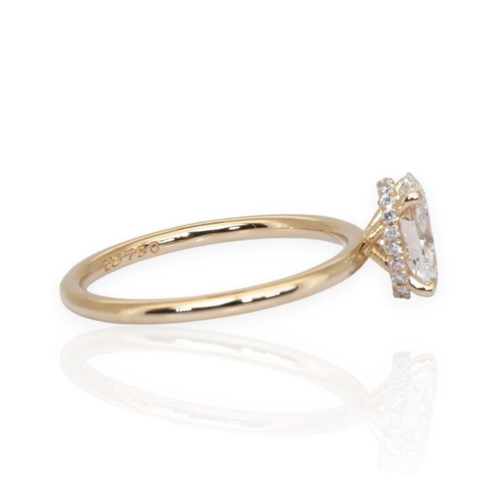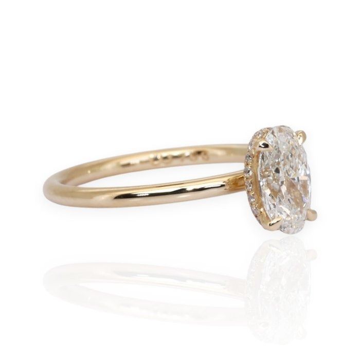 עטרי את ידך בטבעת זהב צהוב 18 קראט זו, בעלת אלגנטיות טבעית, המשובצת במרכזה ביהלום מרהיב בחיתוך אובלי במשקל 1.00 קראט, הקורן חום בצבעו וניקיונו. סביב האבן המרכזית, 20 יהלומים עגולים מבריקים במשקל כולל של 0.10 קראט יוצרים הילה רכה וזוהרת המעצימה את יופייה הנצחי של הטבעת. יצירה זו היא האיזון המושלם בין קסם קלאסי לעידון מודרני. GIA מתועדת לאיכות וברק מובטחים.
