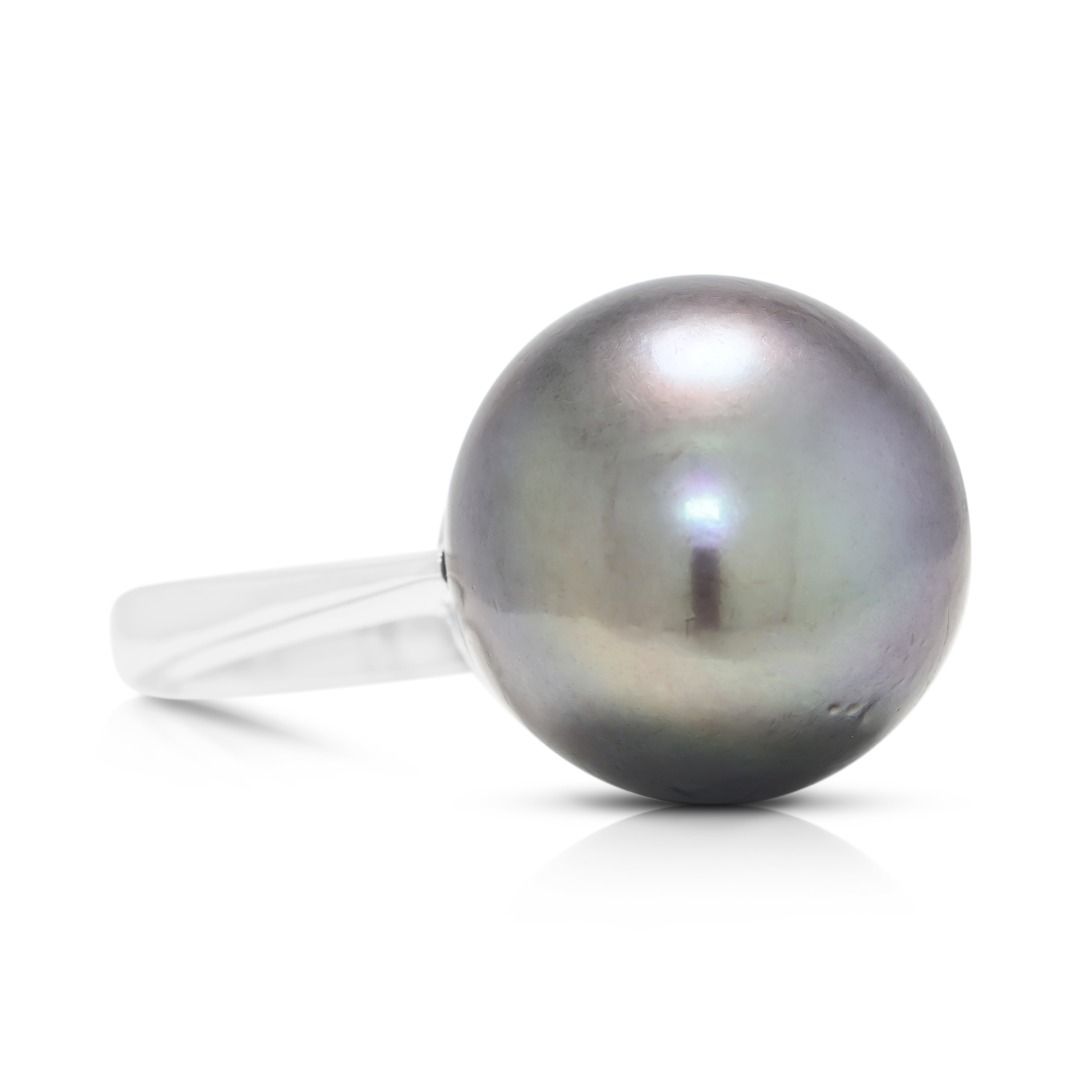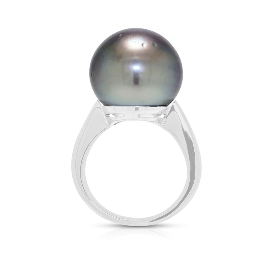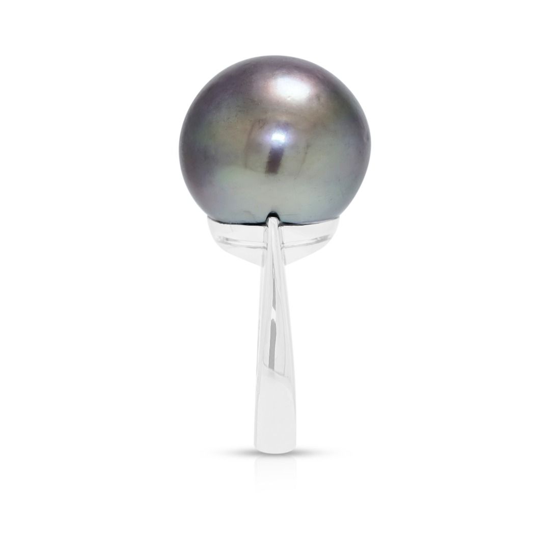 טבעת סוליטר זו מציגה פנינת ים דרומי שחורה גדולה במיוחד, בקוטר 14.5 מ"מ, בעלת ברק מסתורי וגוון קסום. הפנינה בעלת הגוון הכהה יושבת במרכז על טבעת עדינה ומלוטשת מזהב לבן 18 קראט. משקלה 8.47 גרם. טבעת זו במידה 47.5EU מיועדת לאישה המעריכה אלגנטיות עם נגיעה של מסתורין.