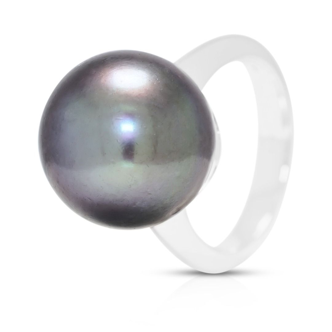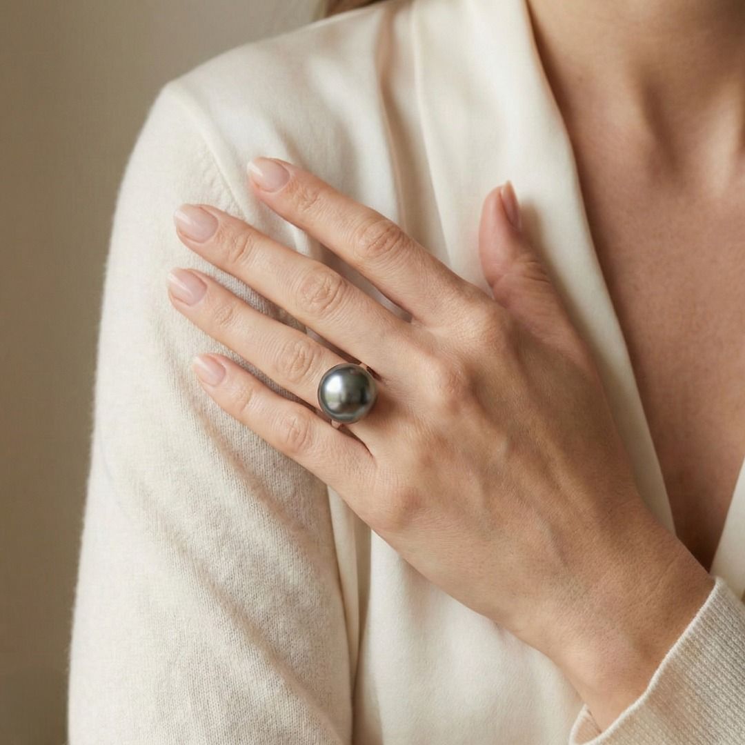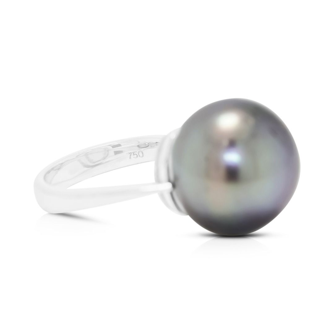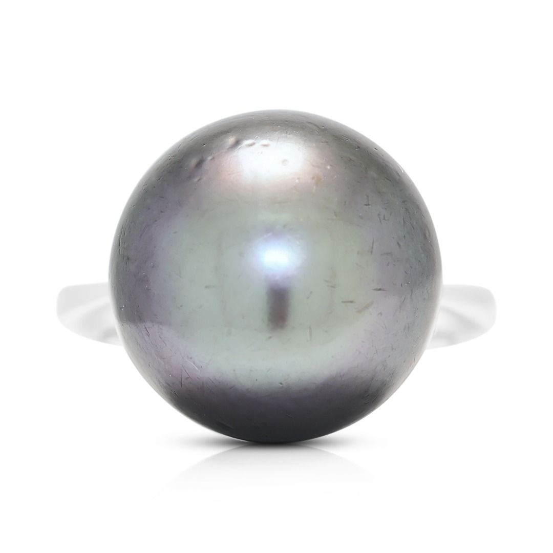 טבעת סוליטר זו מציגה פנינת ים דרומי שחורה גדולה במיוחד, בקוטר 14.5 מ"מ, בעלת ברק מסתורי וגוון קסום. הפנינה בעלת הגוון הכהה יושבת במרכז על טבעת עדינה ומלוטשת מזהב לבן 18 קראט. משקלה 8.47 גרם. טבעת זו במידה 47.5EU מיועדת לאישה המעריכה אלגנטיות עם נגיעה של מסתורין.