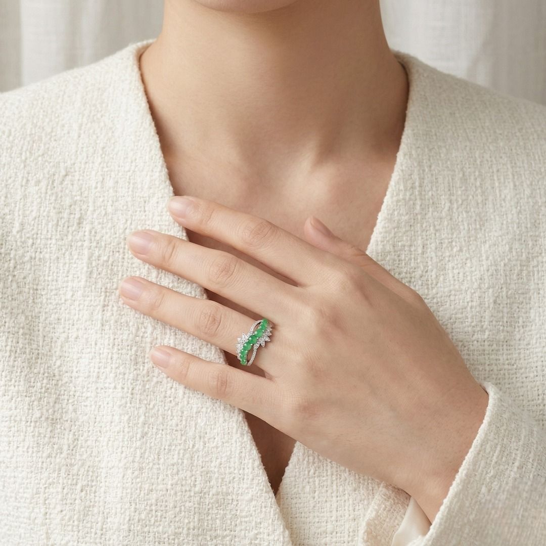 טבעת זו בעלת חישוק מפוצל עשויה מזהב לבן 18 קראט, משובצת בתשע אבני ג'ייד ירוקות בחיתוך קבושון המסודרות בצורת גל חינני. מעוטרת ב-48 יהלומים עגולים בחיתוך בריליאנט (סה"כ 0.24 קראט, צבע H, ניקיון SI), היא משיגה איזון עדין של צבע וברק. עם משקל תכשיט של 3.15 גרם ומידה 56EU/17HK, היא מגלמת אומנות ואלגנטיות נצחית. פריט מורשת החוגג את הסמליות התרבותית של הג'ייד ואת האמנות המעודנת.