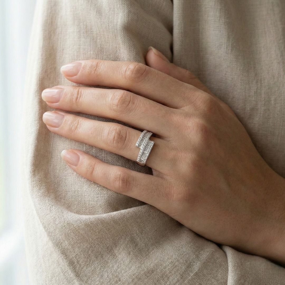 טבעת מעודנת זו בסגנון עוטף מציגה 58 יהלומים עגולים בחיתוך בריליאנט (0.29ct) ו-36 יהלומים חרוטיים (0.25ct), כולם בצבע H-I וניקיון SI. עשויה מזהב לבן מלוטש 18K, עיצוב שלוש השורות יוצר משחק מרהיב של ברק ומבנה. במשקל 3.86g ובמידה 50EU/12HK, פריט זה שלא נענד מציע אלגנטיות מודרנית עם טוויסט פיסולי – מושלם לאוהבי תחכום נועז.