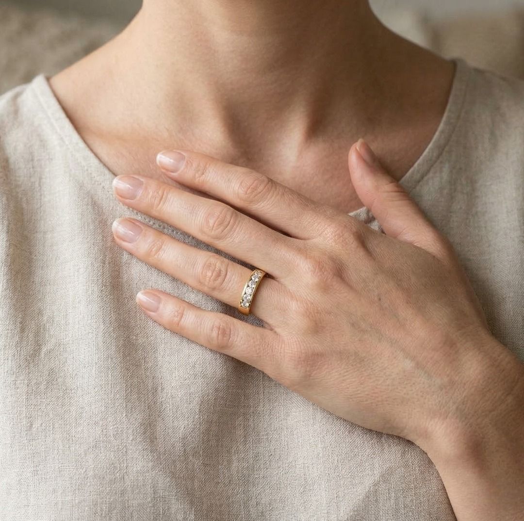 הציתי את סגנונך עם טבעת נועזת במיוחד זו מזהב צהוב 18K, המעניקה יוקרה טהורה ומשכנעת בכל נצנוץ. שורה יצירתית של שישה יהלומים טבעיים מבריקים משובצת בערוץ (channel-set) בצורה חלקה ליצירת זוהר יוקרתי ואחיד במשקל כולל של 0.52 קראט. במשקל מוצק של 2.98 גרם, פריט חיוני זה מזהב רך הוא הבחירה האולטימטיבית לאישה שרוצה שהאלגנטיות היומיומית שלה תהיה נועזת, חדה ובלתי נשכחת כמו אחר צהריים שטוף שמש.