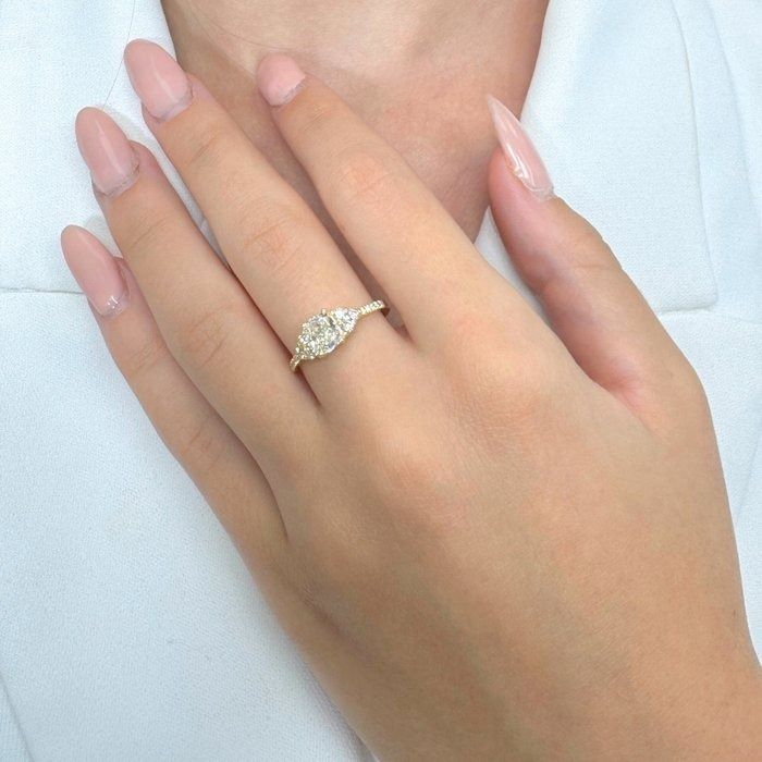 טבעת זו מזהב צהוב 18 קראט, המקרינה קסם קלאסי עם נגיעת חמימות, מציגה במרכזה יהלום מרהיב בחיתוך כרית במשקל 1.01 קרט. שישה עשר יהלומי צד עגולים בחיתוך בריליאנט במשקל כולל של 0.30 קרט עוטפים את אבן המרכז בניגודיות מסנוורת, ומעלים את אלגנטיות הטבעת. מתועדת IGI ובמשקל 2.46 גרם, טבעת זו היא שילוב חינני של תחכום וניצוץ.