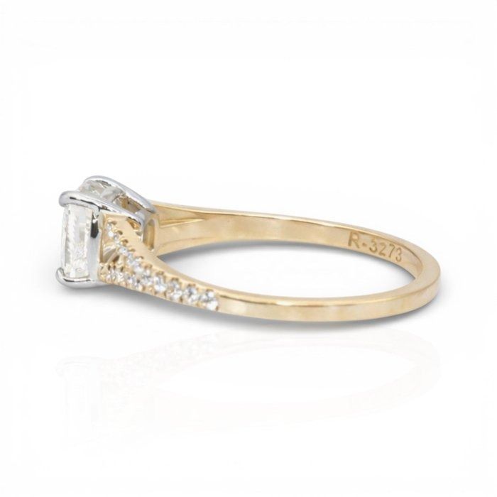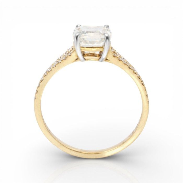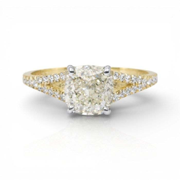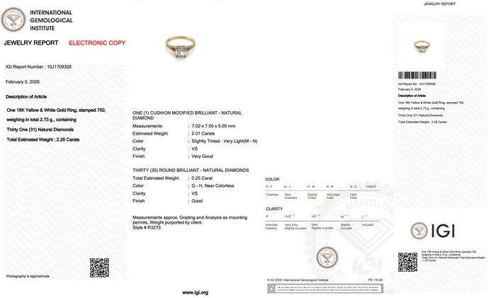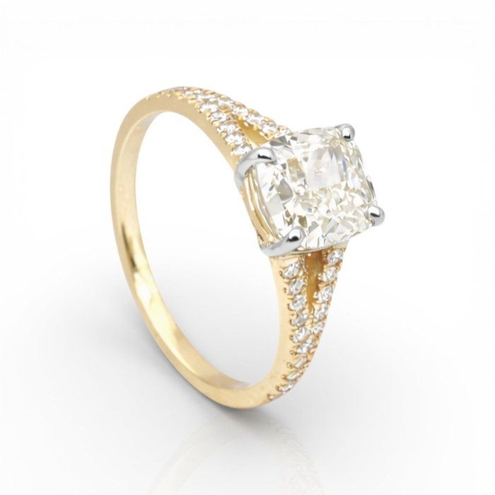 טבעת מרהיבה זו מציגה יהלום טבעי בחיתוך קושן במשקל 2.01 קראט משובץ בעיצוב מעודן מזהב צהוב ולבן 18 קראט, מאזנת בצורה מושלמת חמימות ואלגנטיות. סביבו, 30 יהלומים טבעיים עגולים מבריקים כיהלומי צד במשקל כולל 0.25 קראט, מוסיפים שיבוץ פאווה מרהיב המגביר את הברק. במשקל כולל של 2.73 גרם, פריט מתועד IGI זה הוא אמירה מתוחכמת לאוהבי יהלומים עשירים באופי ועיצוב נצחי.