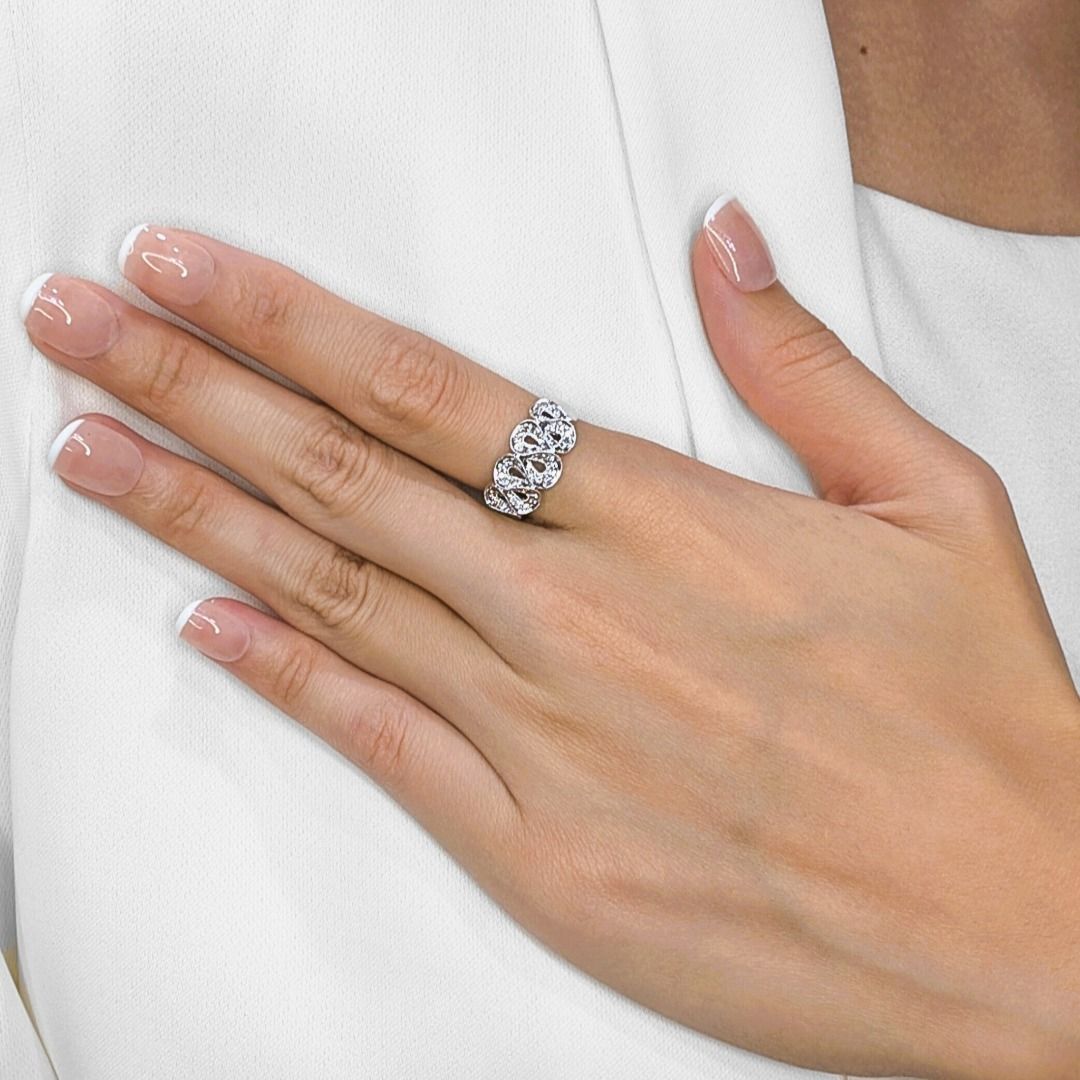 טבעת חדשה ומרהיבה זו משדרת תחכום חינני עם עיצוב הפילגרין האמנותי שלה בזהב לבן 18K מלוטש. מעוטרת ב-49 יהלומים עגולים בחיתוך בריליאנט, במשקל כולל של 0.19 קראט, בצבע F-G ובניקיון VS-SI, היצירה מנצנצת בזוהר עדין בכל קימור. במידות 7.5 מ"מ על 18 מ"מ, דוגמת העבודה הפתוחה שלה יוצרת מראה בולט שמרגיש גם אוורירי וגם יוקרתי, בעוד שמשקלה 5.89 גרם מעניק לה נוכחות מוצקה ועמידה. מעוצבת במידה 53.5EU/14HK, טבעת זו היא שילוב שיקי של אלגנטיות נצחית וקסם מודרני – מושלמת כאביזר בולט או כחותמת יומיומית מעודנת.