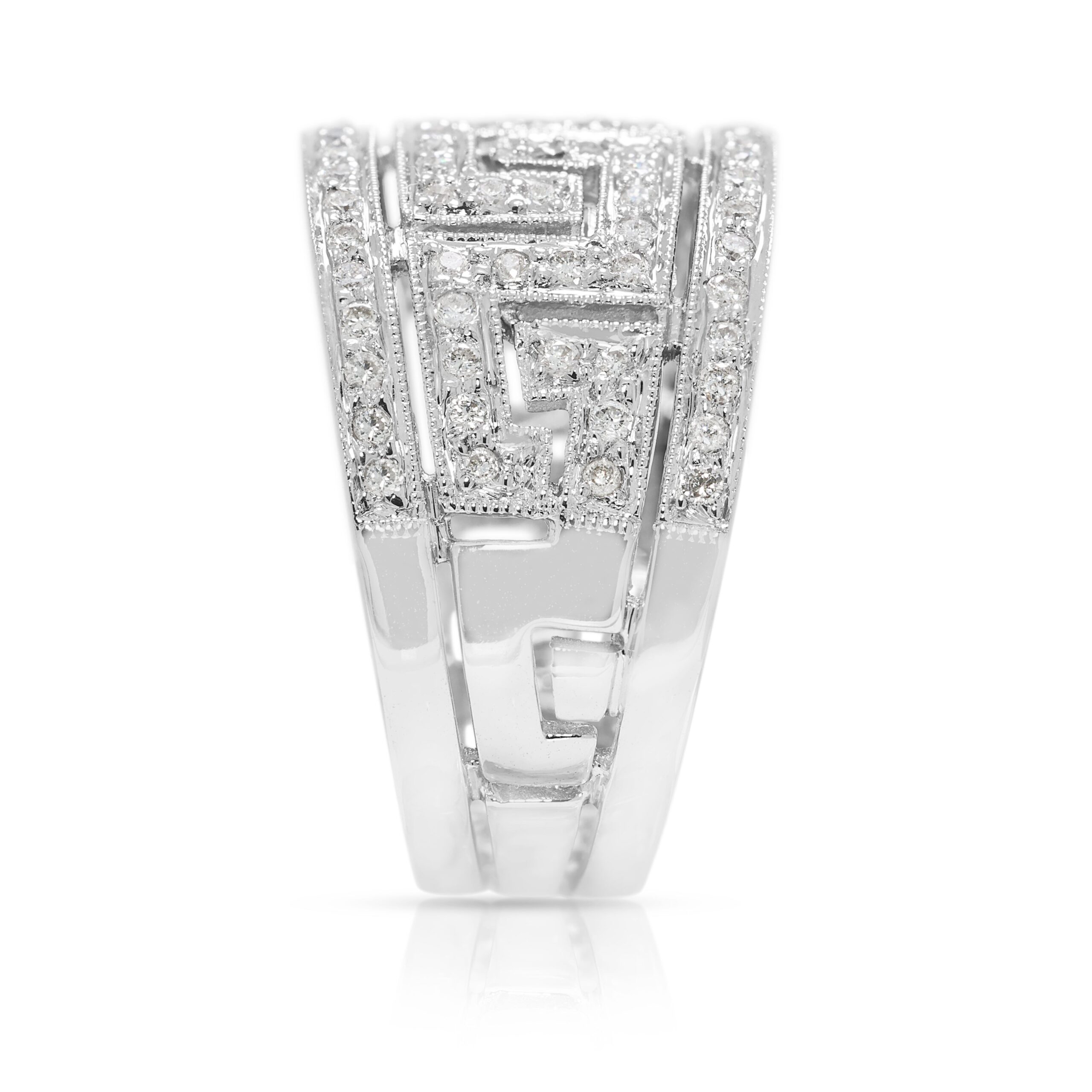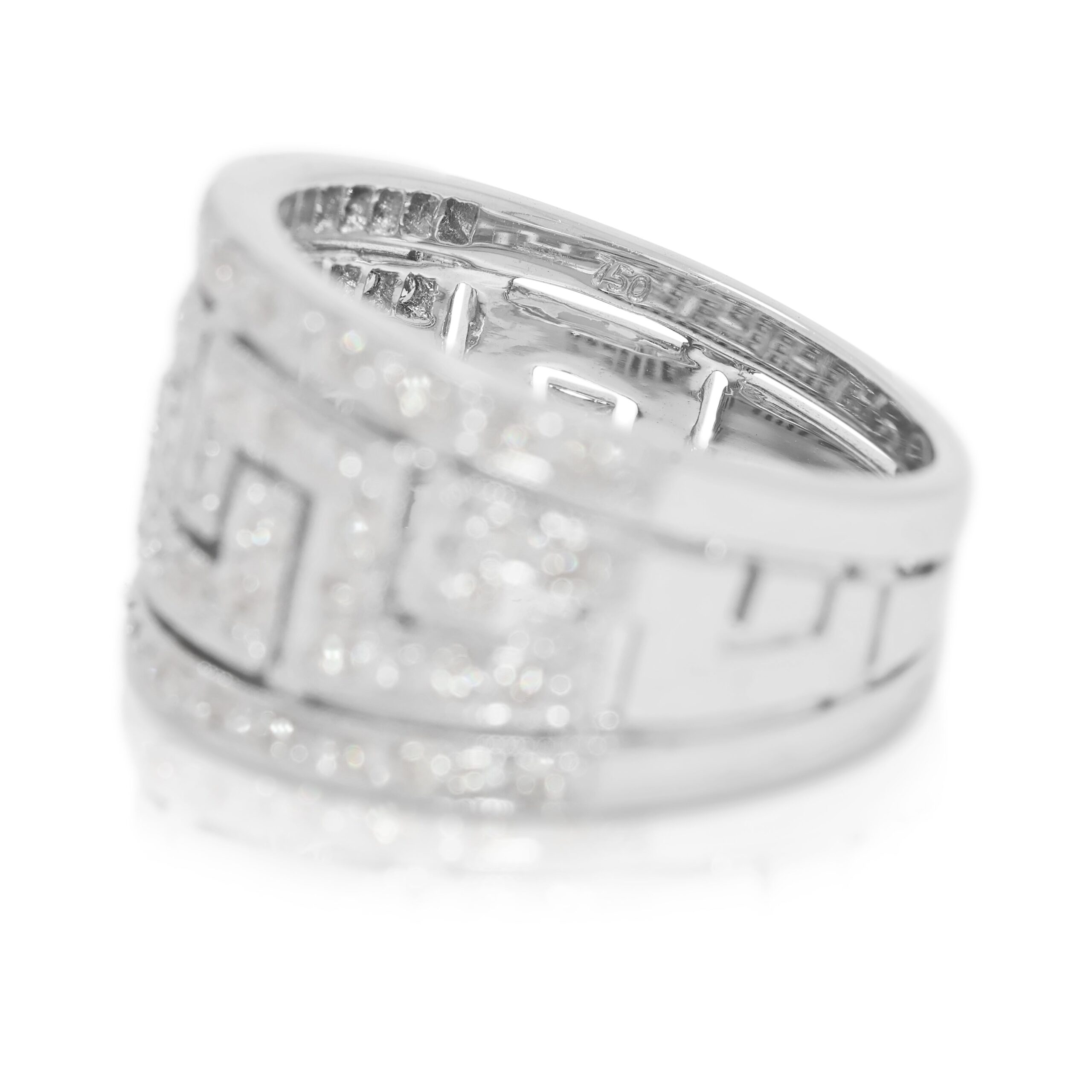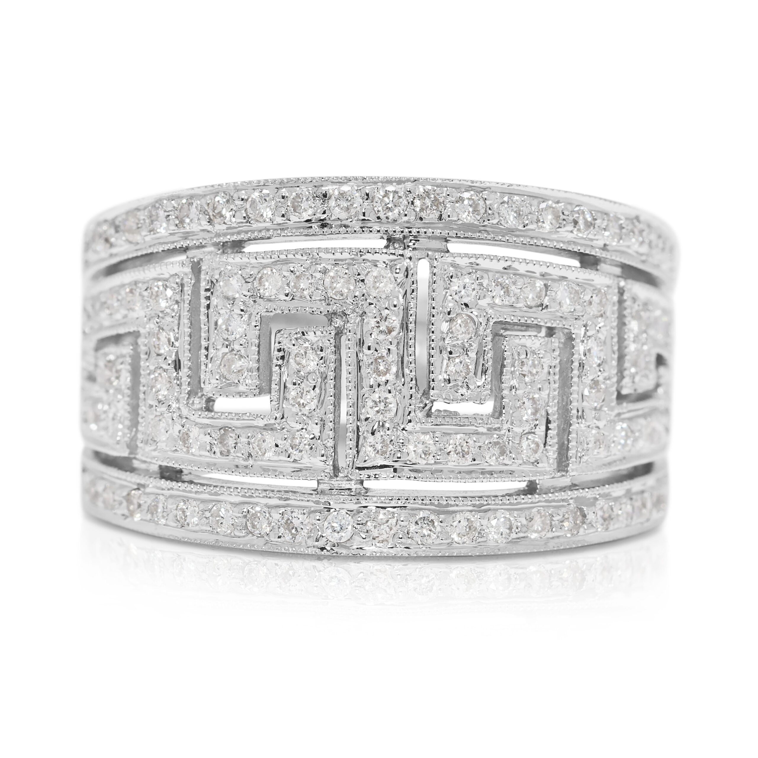 בעיצוב נועז אך מעודן, טבעת זו עשויה מזהב לבן מלוטש 18 קראט ומשובצת ב-93 יהלומים טבעיים בחיתוך עגול מבריק, במשקל כולל של 0.43 קראט. כל יהלום, בדירוג צבע G–H וניקיון VS–SI, מסודר בקפידה כדי להבליט את הדוגמה המורכבת של הטבעת ואת הברק המתמשך שלה. במשקל משמעותי של 7.14 גרם, היא מציעה נוכחות יוקרתית על היד תוך שמירה על נוחות ללבישה יומיומית. במידה 51EU / 13HK, עיצוב הפס הרחב הופך אותה לפריט הצהרתי – מושלמת כטבעת אופנתית או כתוספת ייחודית לאוסף תכשיטים יוקרתי.