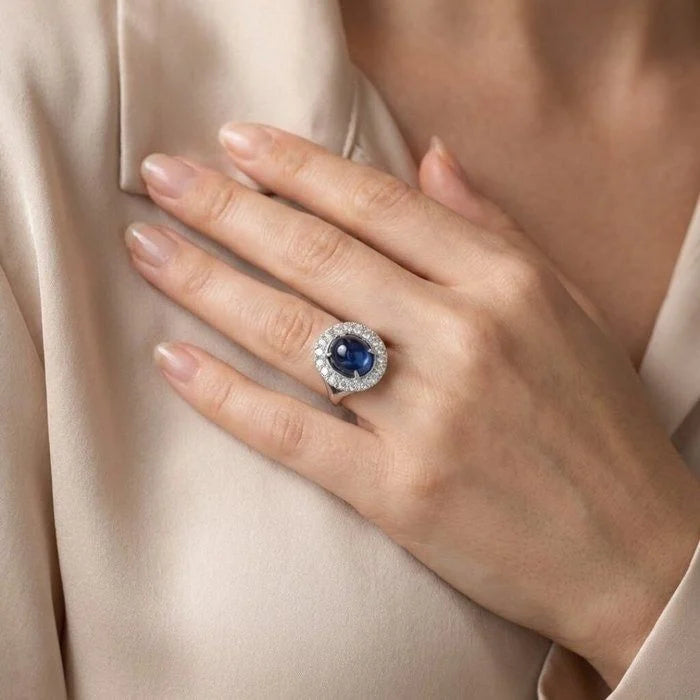 יצירת מופת אמיתית של צבע והדר, טבעת יוצאת דופן זו מציגה ספיר כחול אובלי מהפנט במשקל 6.47ct, המקרין גוון כחול עשיר. גודלו המרשים של הספיר ועומק צבעו הכובש הופכים אותו למרכז בלתי נשכח.