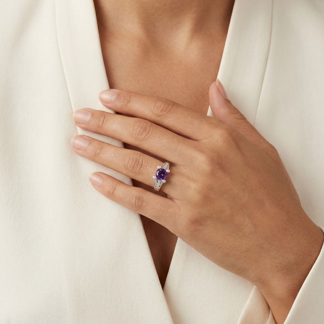 טבעת זו לוכדת אלגנטיות עם אמטיסט סגול עגול ובוהק בחיתוך בריליאנט במשקל 2 קראט, המשובץ בזהב לבן 14 קראט. עיצוב השוק המפוצל מנצנץ עם 10 יהלומים עגולים בחיתוך בריליאנט (במשקל כולל של 0.10 קראט, צבע H, ניקיון SI), המוסיפים ברק עדין לאבן המרכזית. עם משקל כולל של 2.10 קראט, משקל תכשיט של 4.14 גרם, ומידה 57EU/18HK, היא מאזנת צבע עז עם קסם חינני. פריט קסום המקרין רומנטיקה ויופי נצחי.