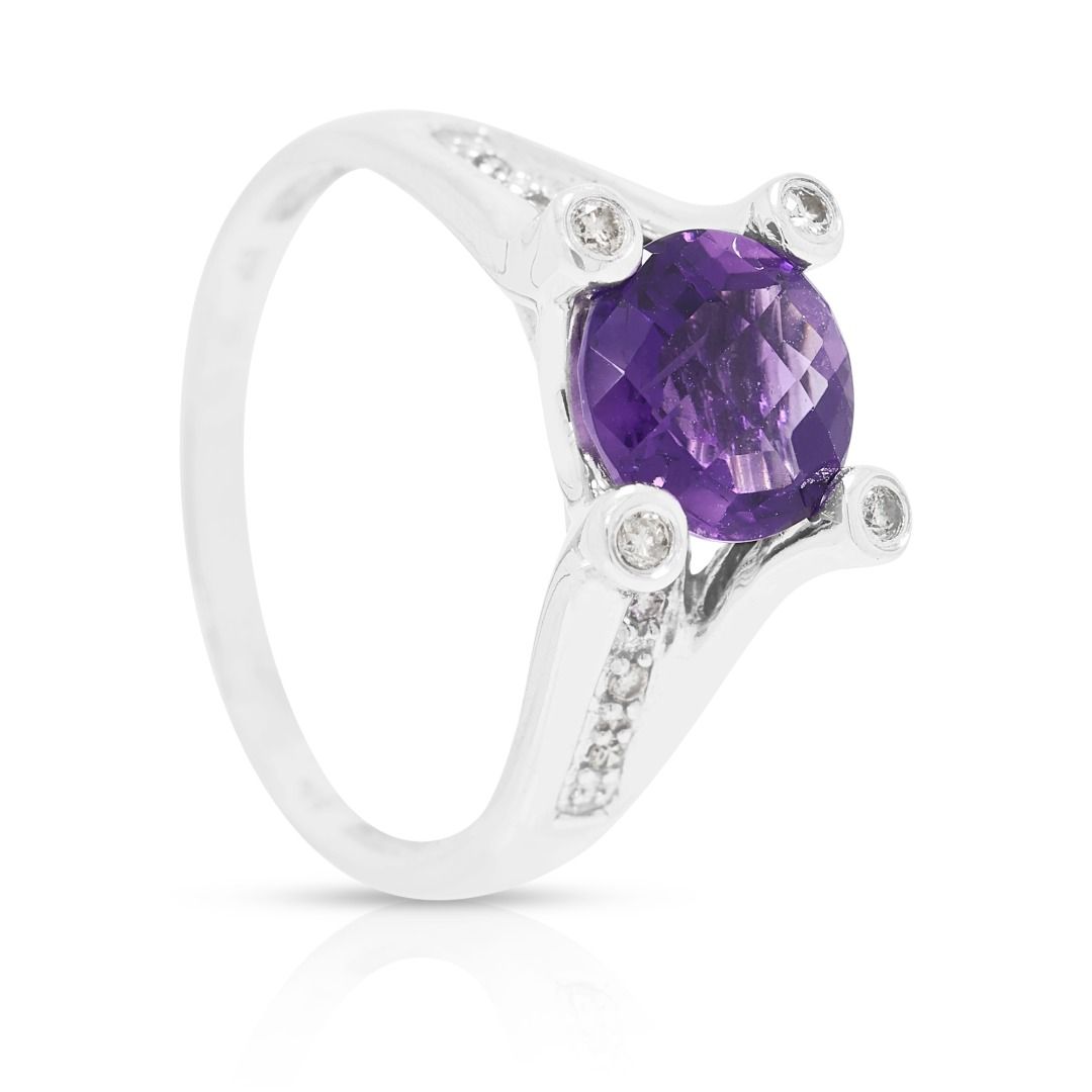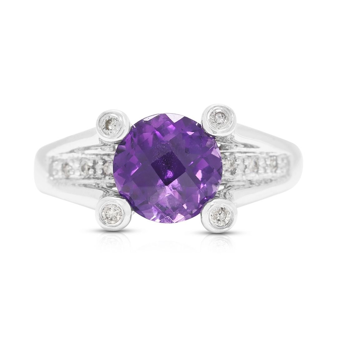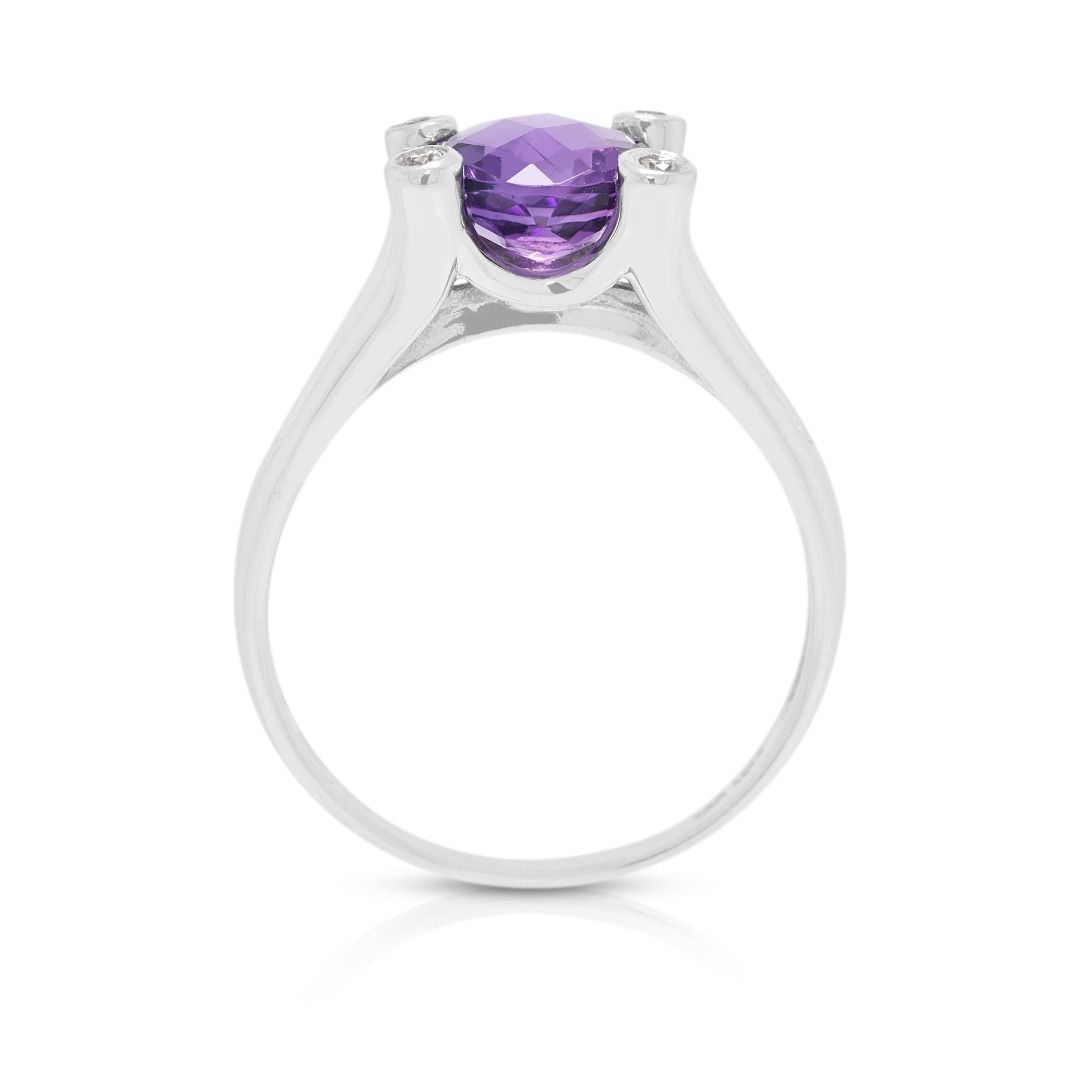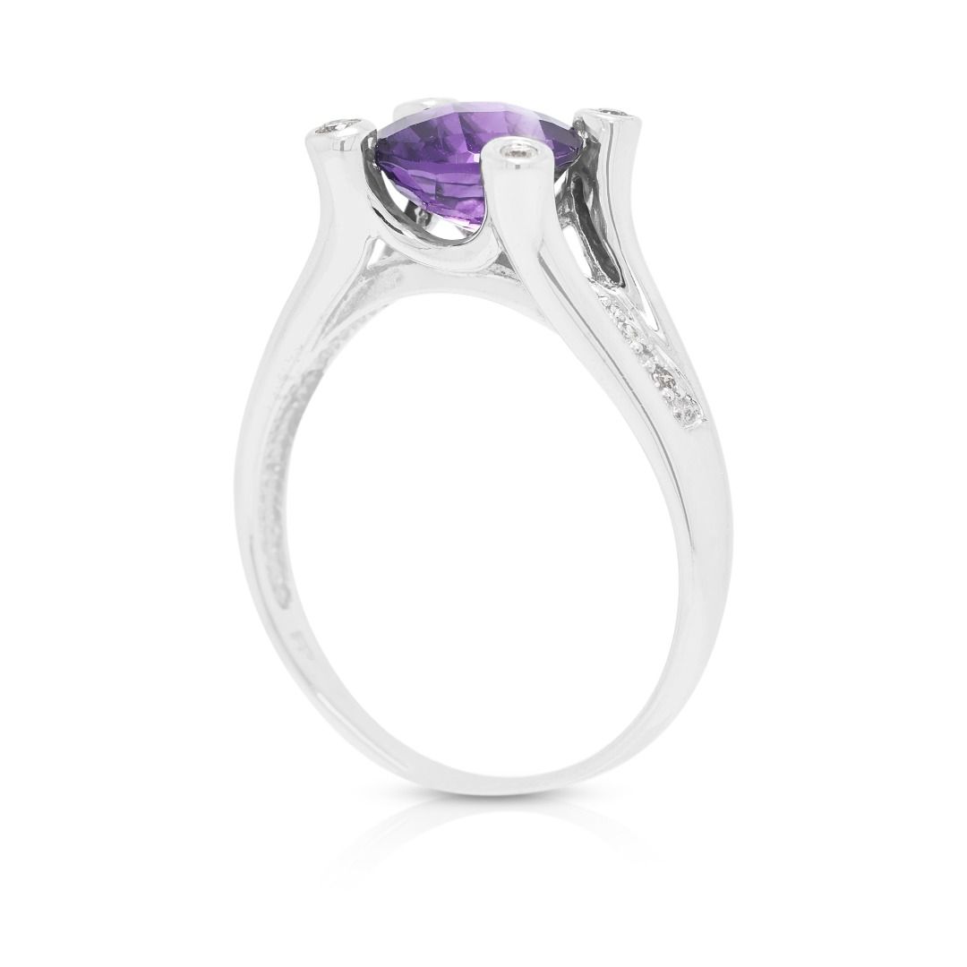 טבעת קסומה עם אמטיסט ויהלומים במשקל 2.10 קראט, בזהב לבן 14 קראט, בעיצוב שוק מפוצל.