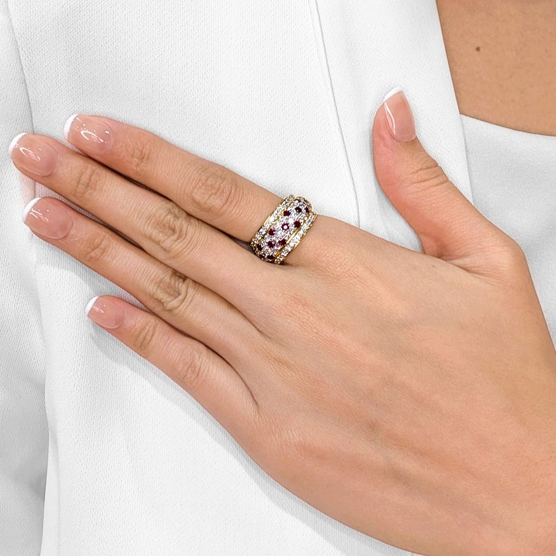 טבעת רובי ויהלומים בעלת שלוש שורות במשקל 1.36 קרט בזהב צהוב 18K