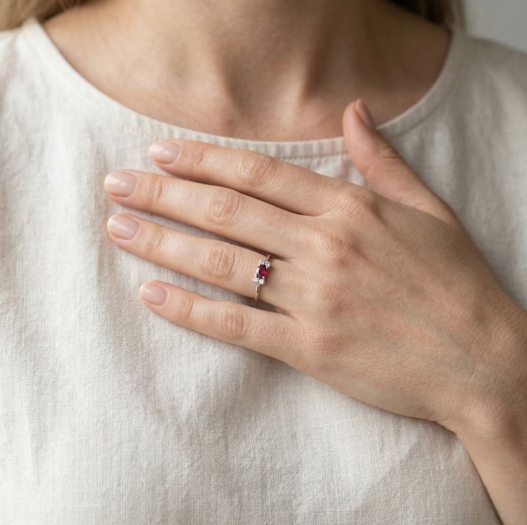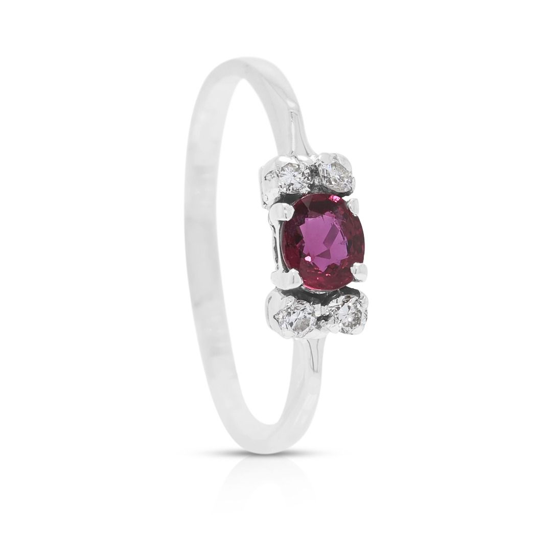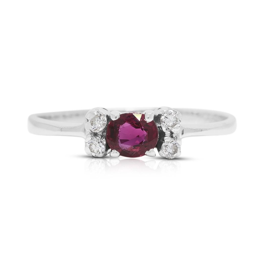 נגיעה של אלגנטיות על-זמנית—טבעת מעודנת זו משובצת ברובי אובלי יחיד במשקל כולל של 0.17ct בגוונים אדומים עשירים, מודגש על ידי 4 יהלומים טבעיים בחיתוך עגול מבריק במשקל כולל של 0.06ct (צבע I, ניקיון SI). יחד, הברק מגיע ל-0.23ct. עוצבה בזהב לבן 18K מלוטש, משקלה 2.02g והיא מתאימה למידה 54EU / 15HK.