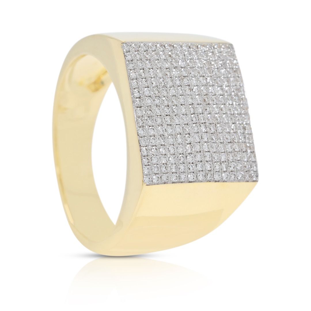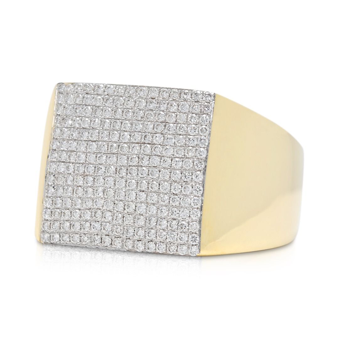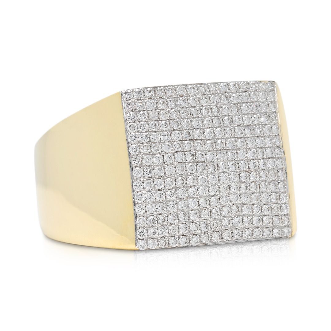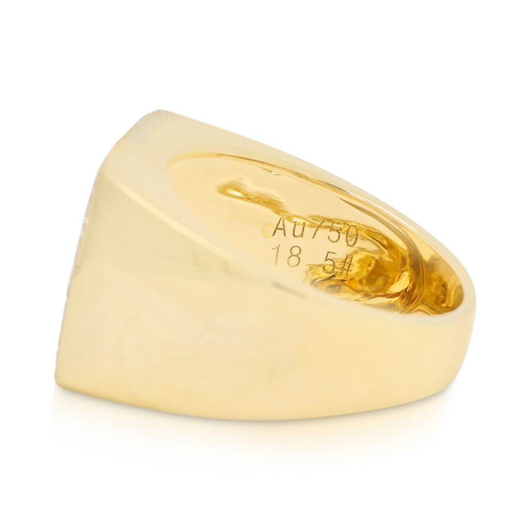 טבעת נועזת זו עשויה מזהב צהוב 18K, משובצת ב-210 יהלומים עגולים בחיתוך בריליאנט מרשים (סה"כ 0.67 קראט, צבע G–H, ניקיון VS) המשובצים בשיבוץ פאווה מרהיב. במשקל תכשיט של 9.49 גרם ובמידה 58EU/18.5HK, היא מציעה נוכחות משמעותית וברק מעודן. פריט הצהרה יוקרתי המשלב דיוק גיאומטרי עם אלגנטיות נצחית, מושלם לאספני עיצוב יוקרתי.