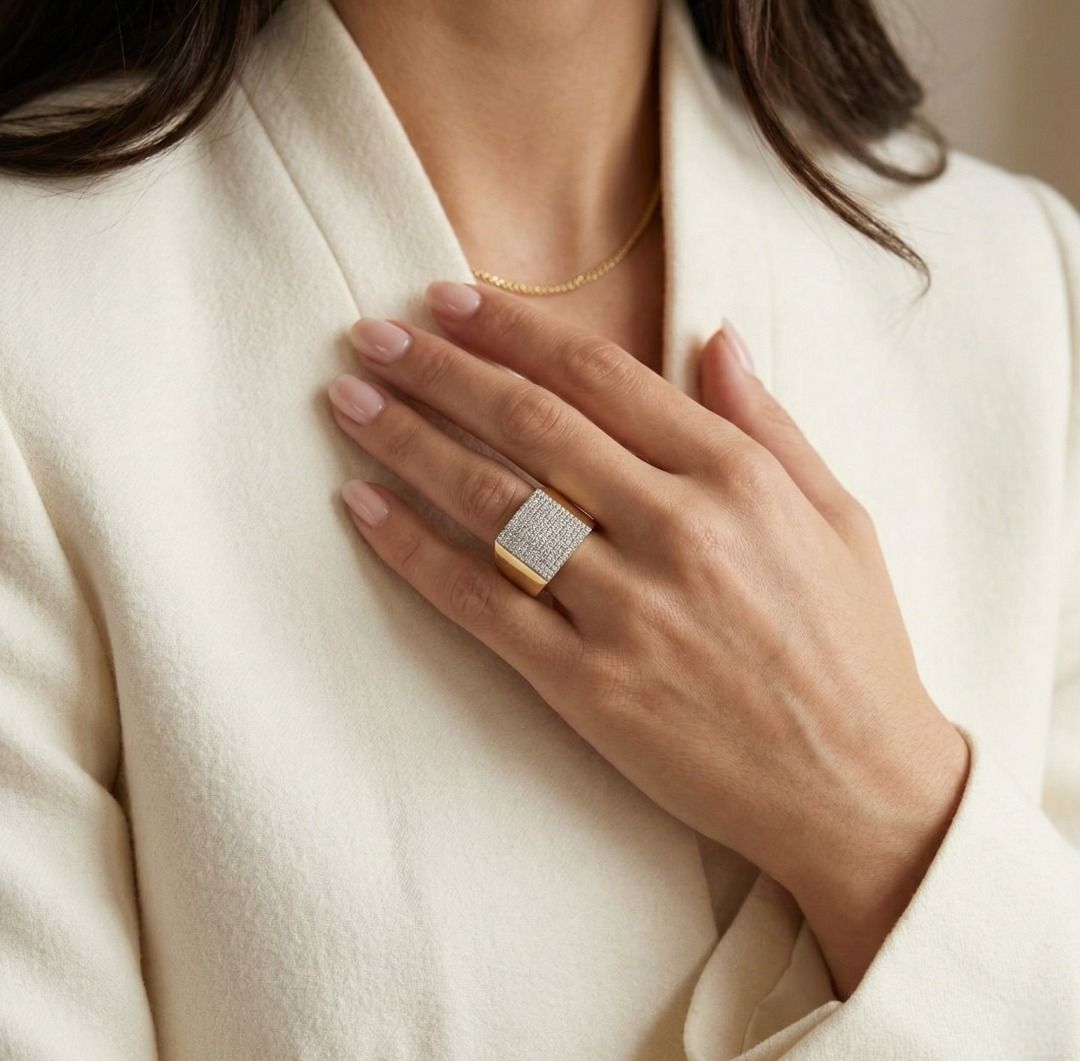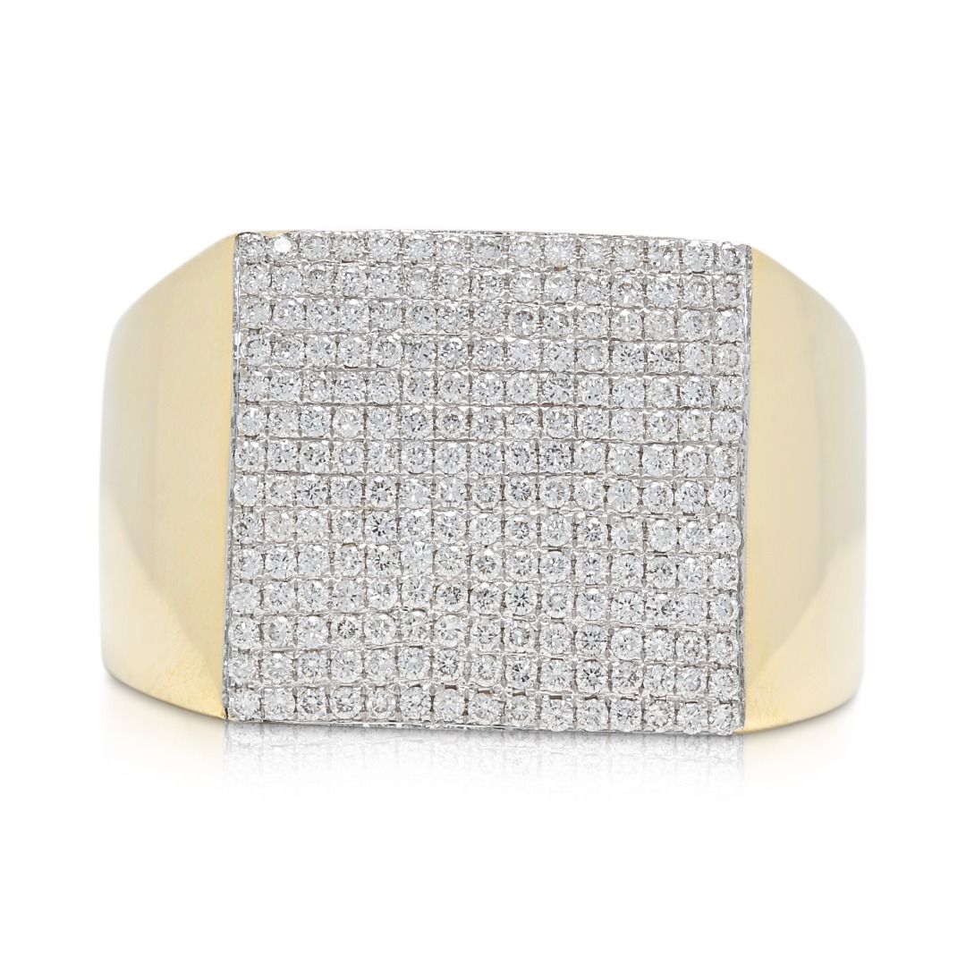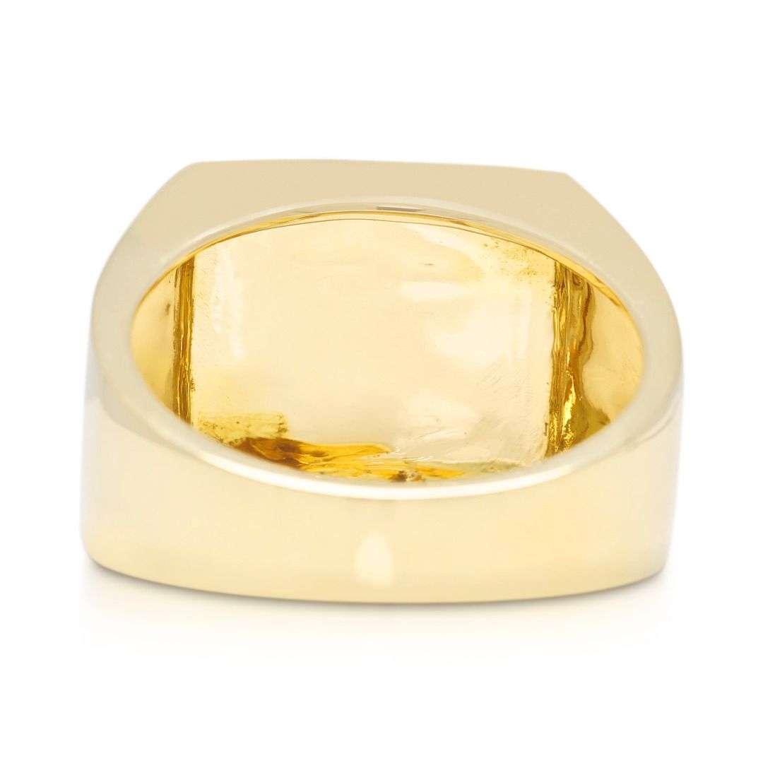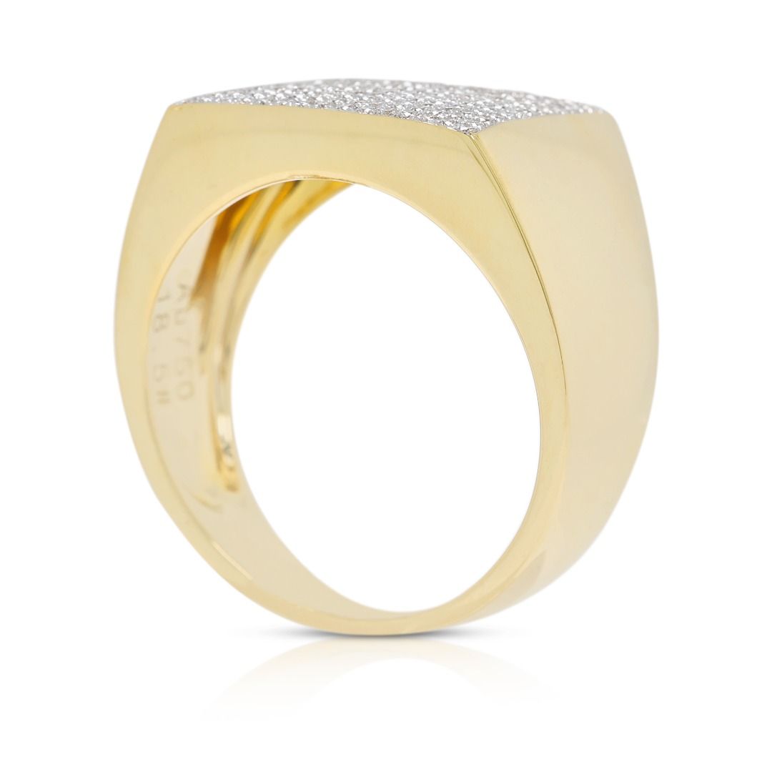 טבעת נועזת זו עשויה מזהב צהוב 18K, משובצת ב-210 יהלומים עגולים בחיתוך בריליאנט מרשים (סה"כ 0.67 קראט, צבע G–H, ניקיון VS) המשובצים בשיבוץ פאווה מרהיב. במשקל תכשיט של 9.49 גרם ובמידה 58EU/18.5HK, היא מציעה נוכחות משמעותית וברק מעודן. פריט הצהרה יוקרתי המשלב דיוק גיאומטרי עם אלגנטיות נצחית, מושלם לאספני עיצוב יוקרתי.