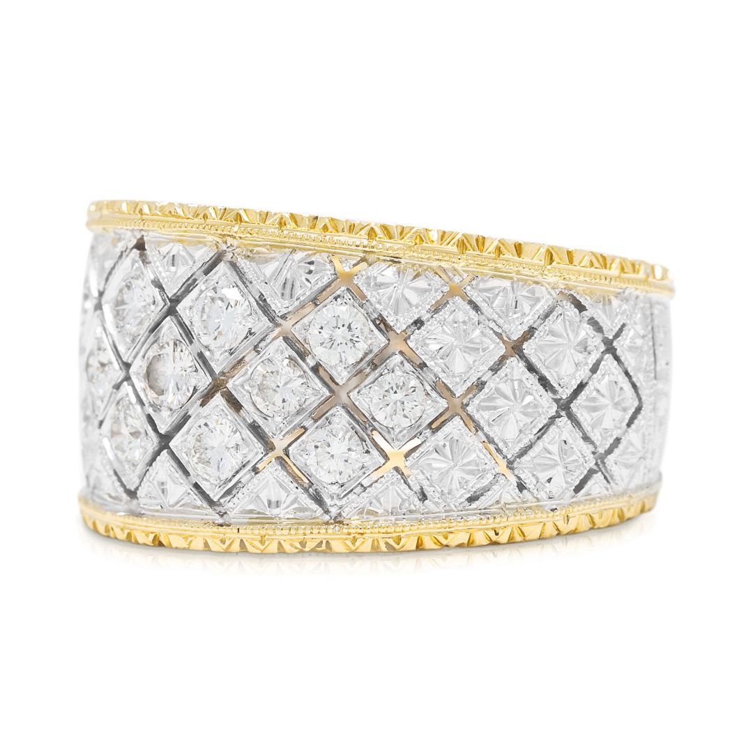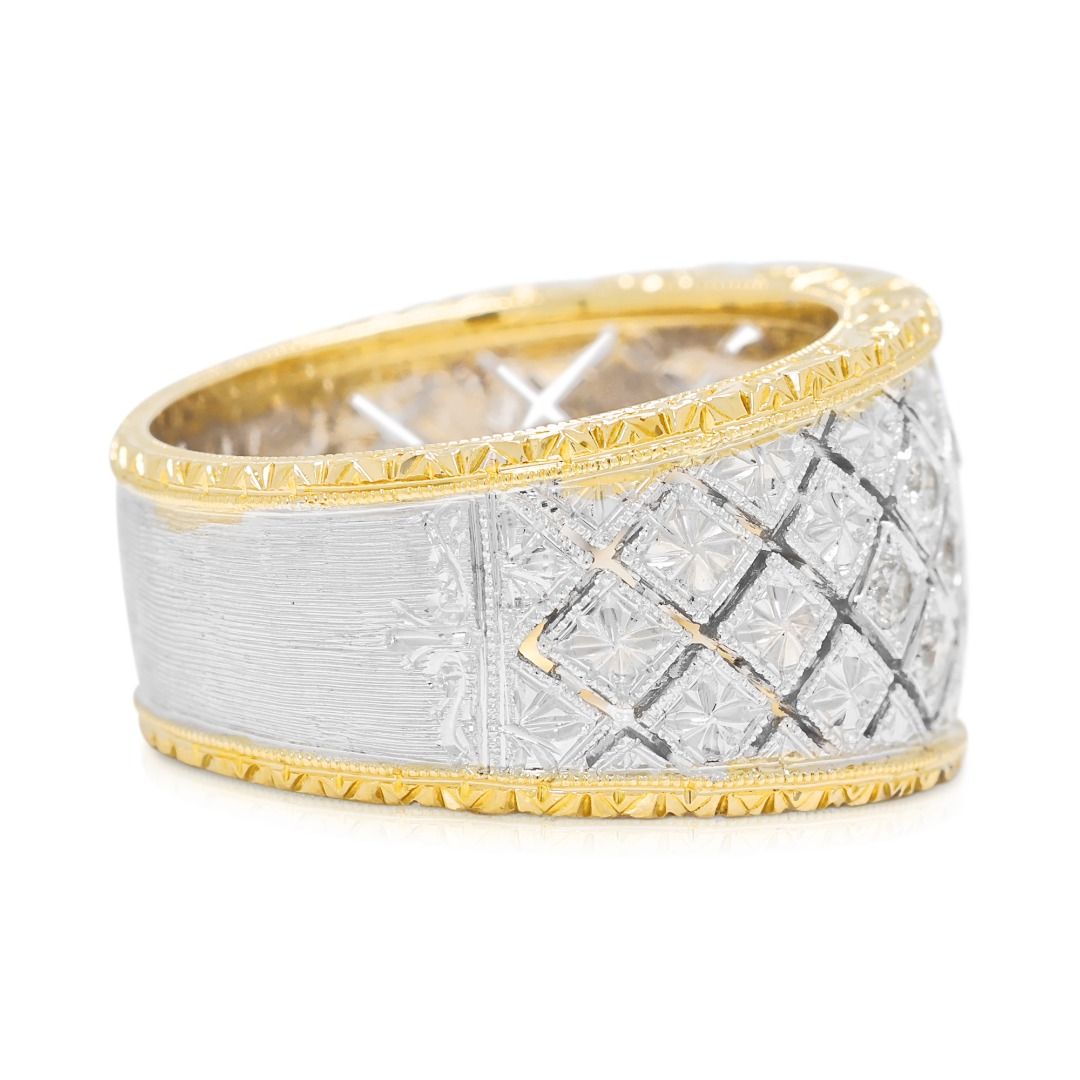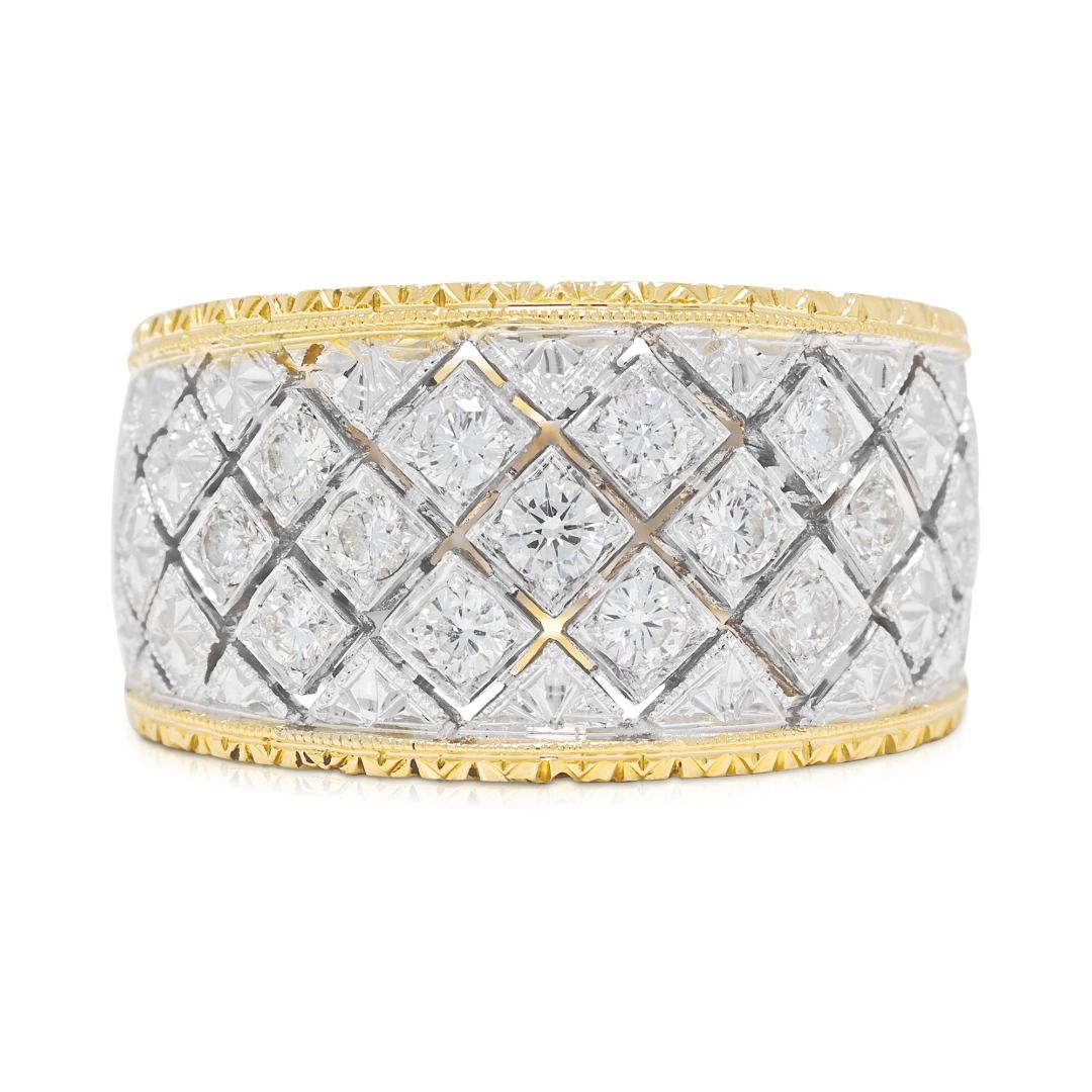 טבעת אלגנטית זו עשויה מזהב דו-גוני 18 קראט, משובצת ב-13 יהלומים עגולים בחיתוך בריליאנט (סה"כ 0.32 קראט, צבע H, ניקיון VS) המשובצים בעיצוב רשת מעודן. במשקל תכשיט של 8.84 גרם ובמידה 55EU/16HK, היא מציעה נוכחות וברק כאחד. פריט יוקרתי המשלב אומנות מודרנית עם אלגנטיות נצחית, מושלם לאספני תכשיטי יוקרה ייחודיים.