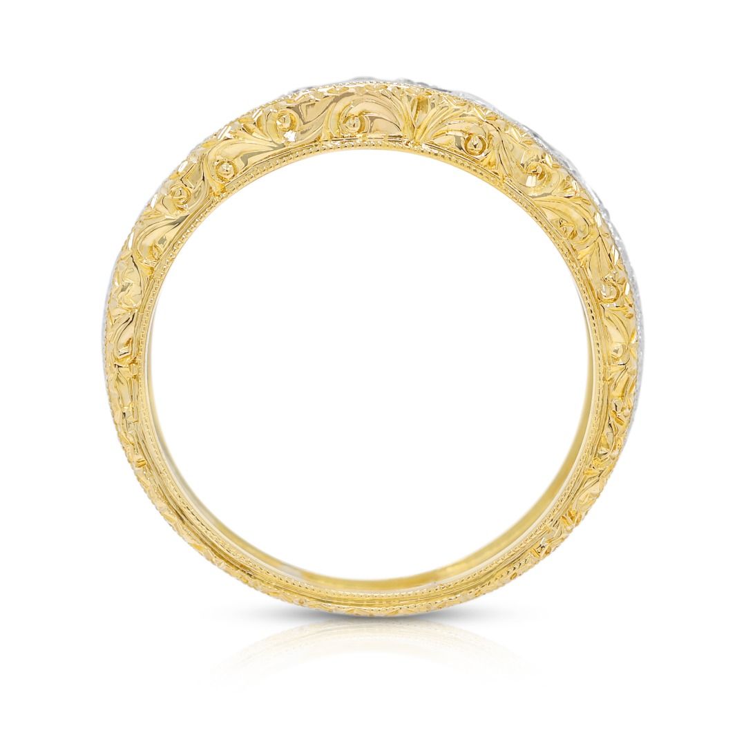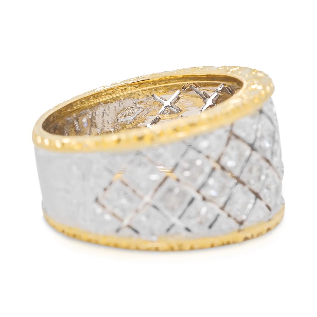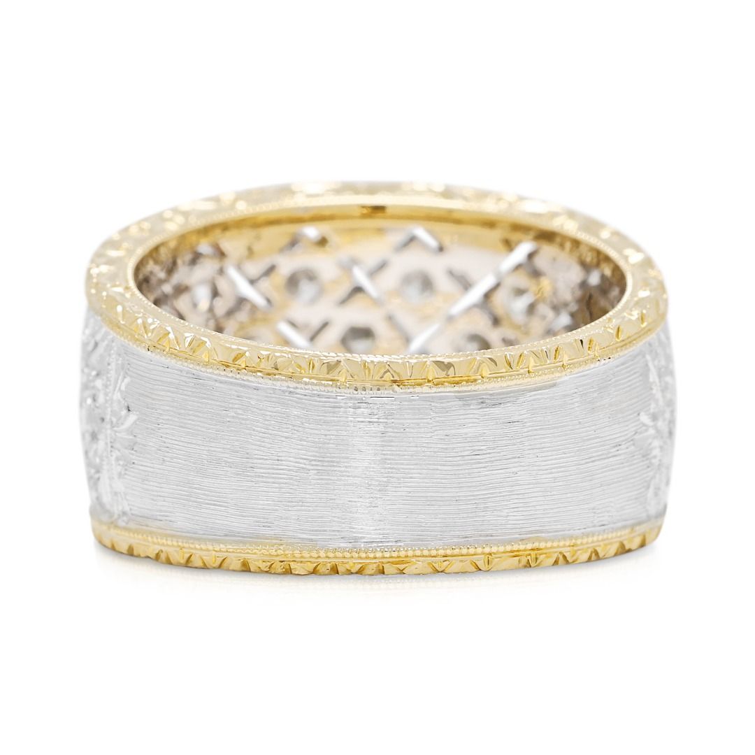 טבעת אלגנטית זו עשויה מזהב דו-גוני 18 קראט, משובצת ב-13 יהלומים עגולים בחיתוך בריליאנט (סה"כ 0.32 קראט, צבע H, ניקיון VS) המשובצים בעיצוב רשת מעודן. במשקל תכשיט של 8.84 גרם ובמידה 55EU/16HK, היא מציעה נוכחות וברק כאחד. פריט יוקרתי המשלב אומנות מודרנית עם אלגנטיות נצחית, מושלם לאספני תכשיטי יוקרה ייחודיים.