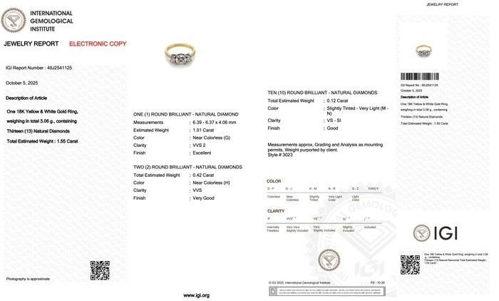 טבעת יהלומים דו-גונית קסומה זו משלבת זהב 18K צהוב ולבן ליצירת הרמוניה מרהיבה של חום וזוהר. במרכזה זוהר יהלום עגול מבריק במשקל 1.01ct, המציע ניצוץ עוצר נשימה וטוהר. שני יהלומי צד זוהרים במשקל כולל של 0.42ct מגבירים את הברק, בעוד 10 יהלומי אקסנט במשקל כולל של 0.12ct מוסיפים ניגודיות עדינה ועומק. יצירה זו, מתועדת IGI, משדרת אלגנטיות, תחכום ויופי נצחי.