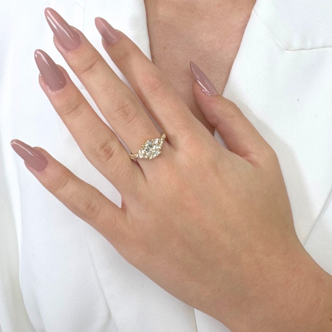 הצהרה אמיתית של תחכום, טבעת מרהיבה זו מזהב צהוב 18 קראט מציגה יהלום אובלי מרהיב במשקל 1.12 קראט, המקרין ברק נצחי עם ליטושו המעולה. משלימים באופן מושלם את היהלום המרכזי שני יהלומי חצי ירח במשקל כולל של 0.51 קראט ועשרה יהלומים עגולים נוצצים במשקל כולל של 0.13 קראט, היוצרים מסגרת עוצרת נשימה של אור ואלגנטיות. טבעת זו מעודנת ושובת לב כאחד, מה שהופך אותה לבחירה מושלמת לאירוסין או לאספני יוקרה. מלווה בתעודת IGI, המבטיחה אותנטיות ואיכות.