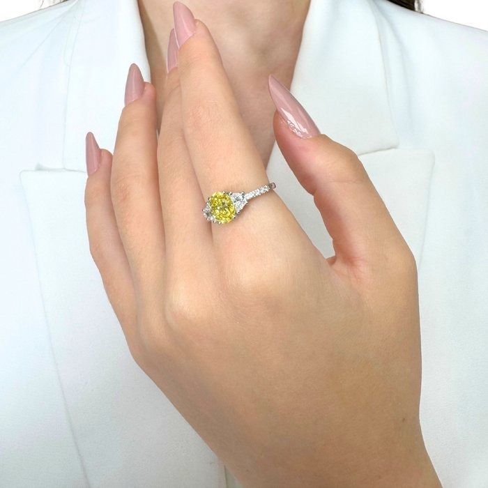 שילוב מרהיב של צבע נדיר ועיצוב אלגנטי, טבעת זו מזהב לבן 18 קראט מציגה יהלום סגלגל צהוב פנסי ויויד עוצר נשימה במשקל 1.03 קרט. ממוסגרת גם בשני יהלומי חצי ירח במשקל כולל של 0.36 קרט, ומודגשת על ידי 10 יהלומים עגולים בחיתוך בריליאנט במשקל 0.08 קרט, טבעת זו מציעה סך הכל 1.47 קרט של נצנוץ הרמוני. טבעת זו היא שילוב זוהר של נדירות, יופי וקסם נצחי!