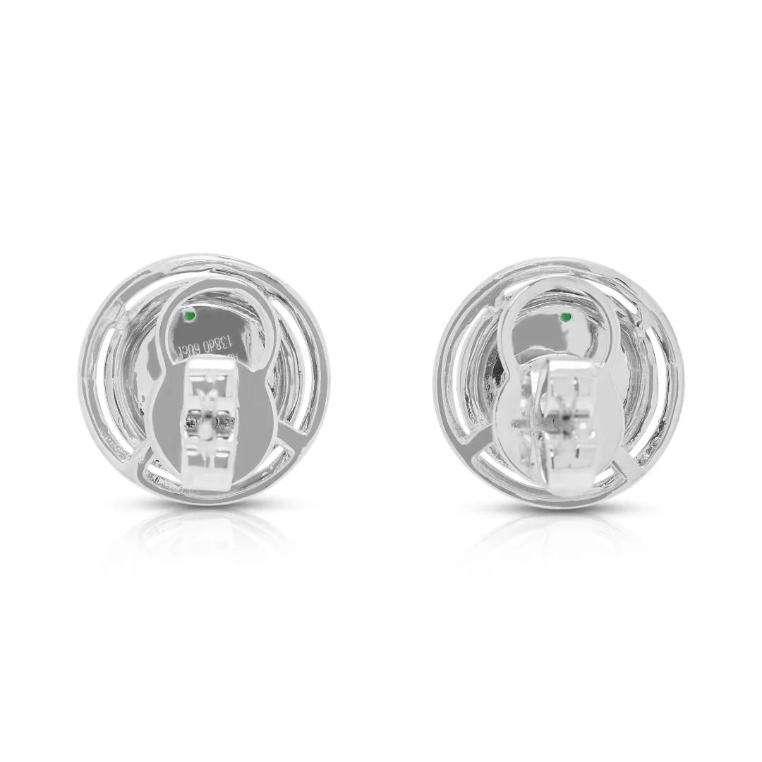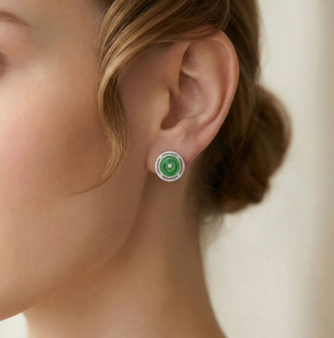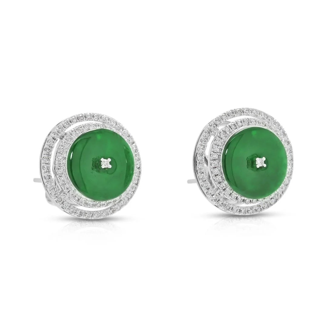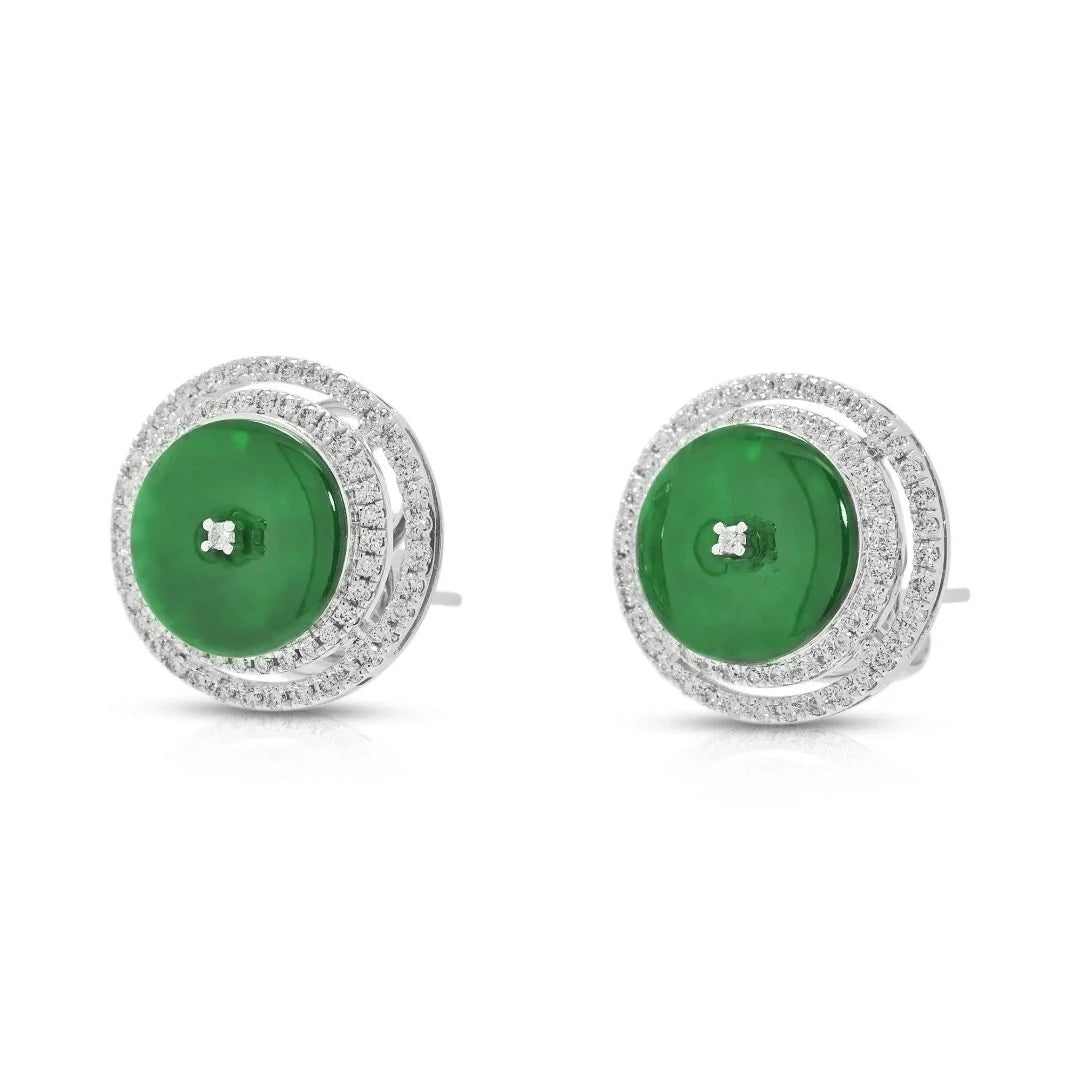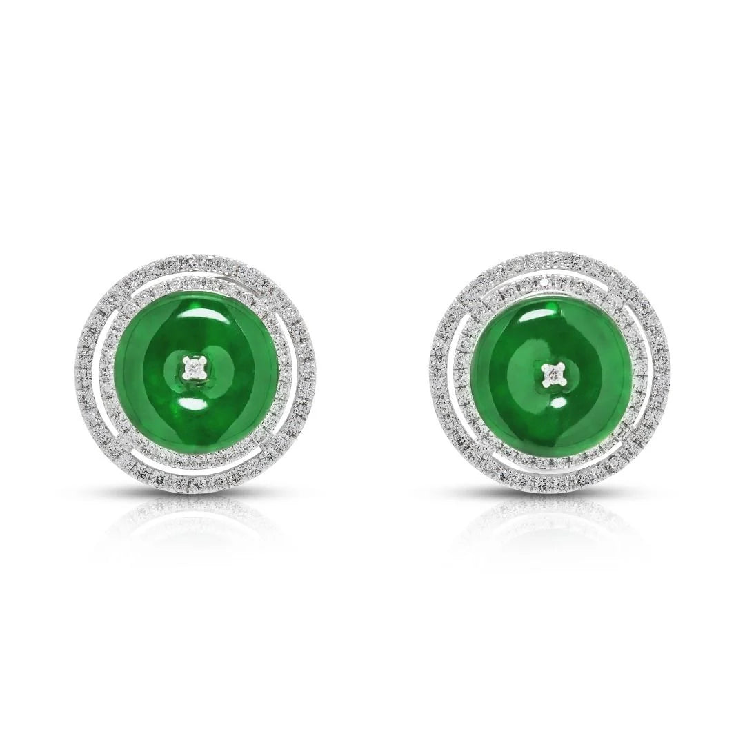 זוג עגילים צמודים נועז ואלגנטי הכולל שתי אבני ג'ייד עגולות וירוקות כהות במשקל כולל של 0.39 גרם. סביב כל אבן ג'ייד מקיפה הילה כפולה וזוהרת של 138 יהלומים טבעיים עגולים בחיתוך בריליאנט, במשקל כולל של 0.60 קראט, בדירוג צבע G–H וניקיון VS. עגילים אלה, המעוצבים בזהב לבן 18 קראט, שוקלים 6.92 גרם ומידותיהם 1.5 ס"מ x 1.5 ס"מ, ומציעים איזון מרהיב של צבע עז וברק זוהר. פריט הצהרה המשלב אומנות נצחית עם עיצוב יוקרתי.