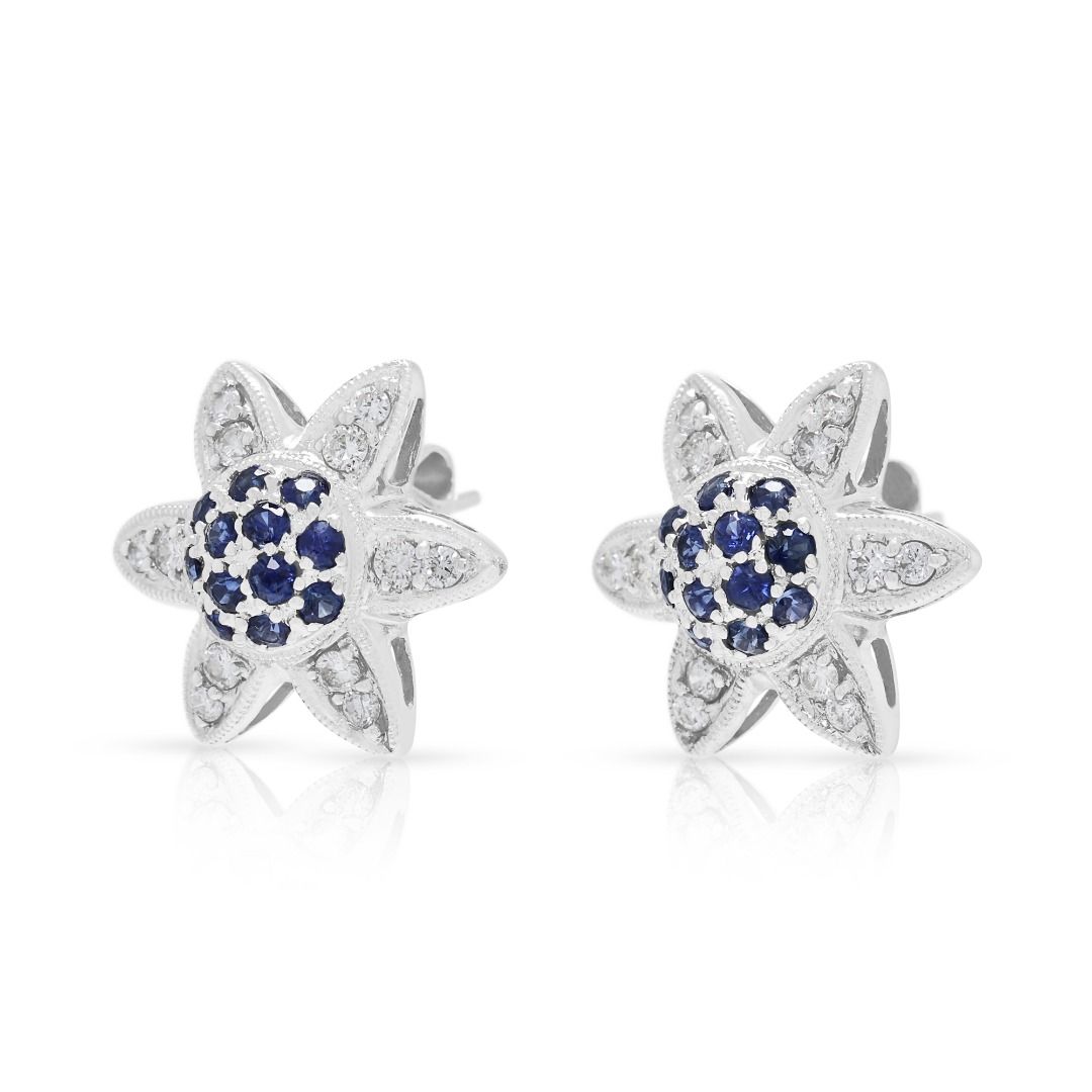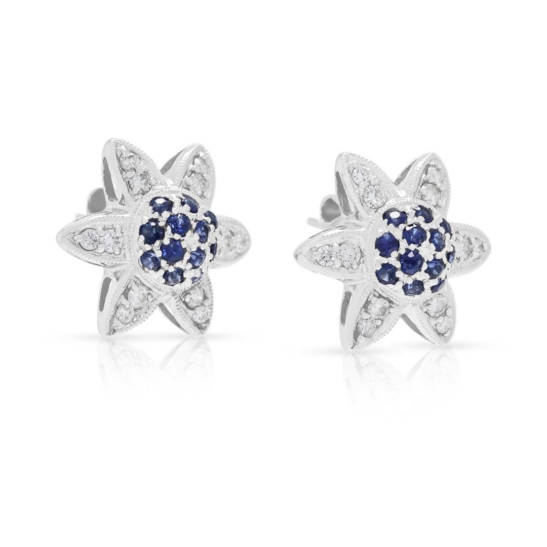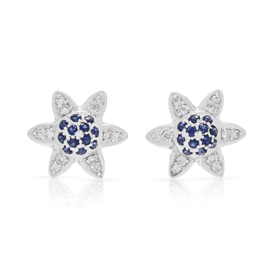 עגילים צמודים מקסימים מזהב לבן 18 קראט, משובצים בספיר ויהלומים טבעיים במשקל 0.85 קראט, בעיצוב אשכול פרחוני