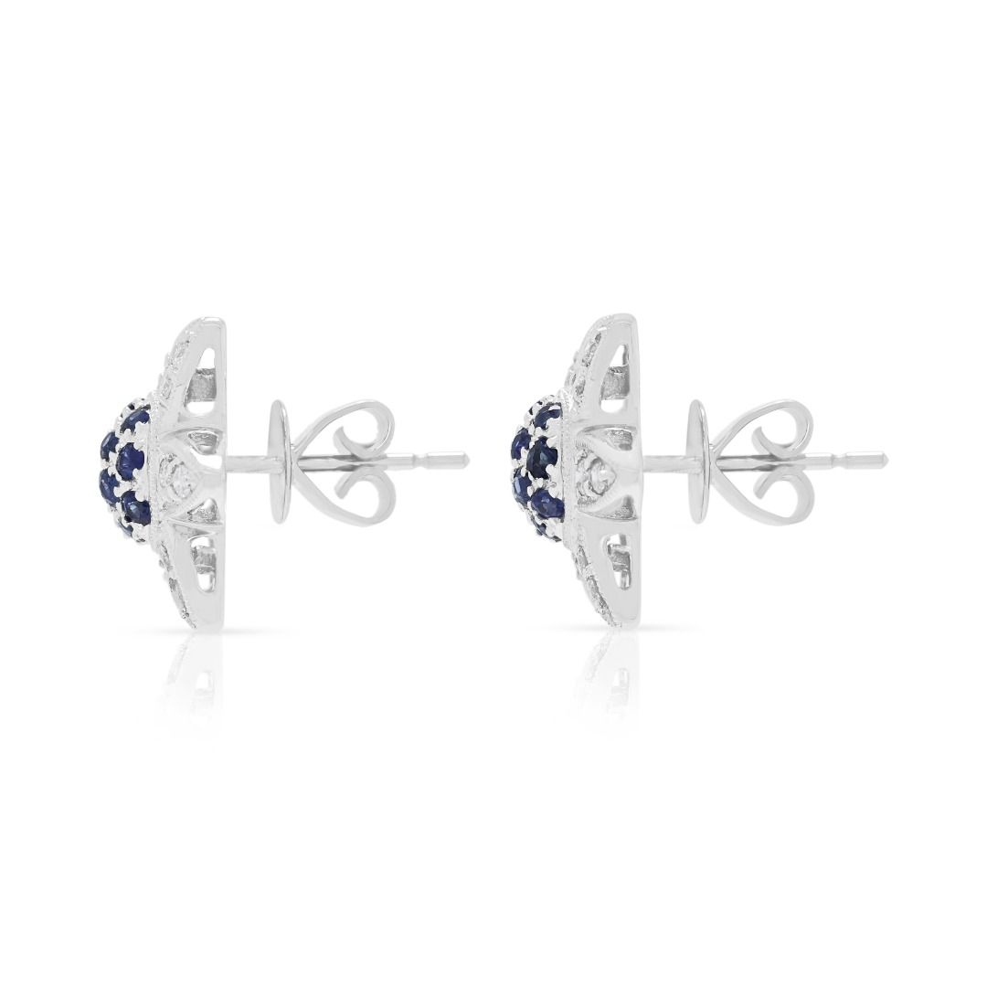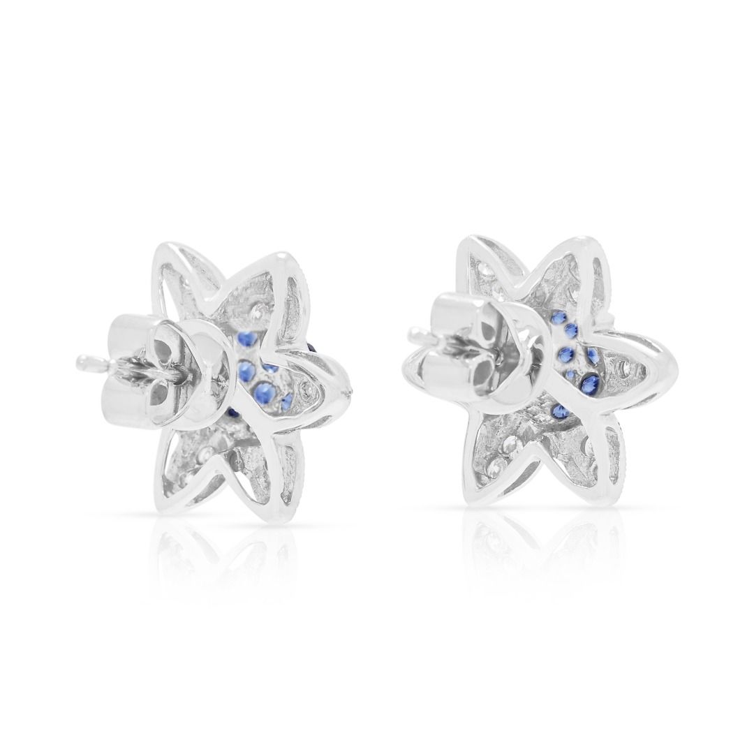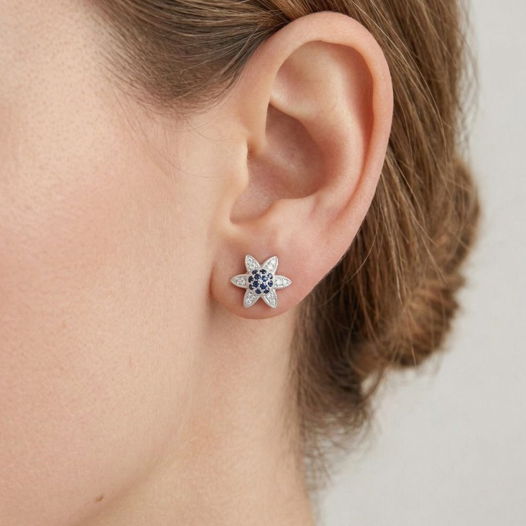 עגילים צמודים מקסימים מזהב לבן 18 קראט, משובצים בספיר ויהלומים טבעיים במשקל 0.85 קראט, בעיצוב אשכול פרחוני