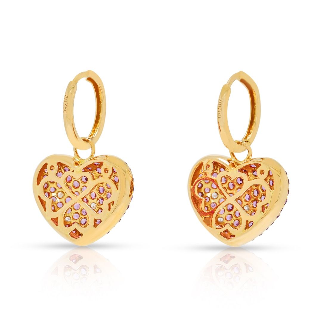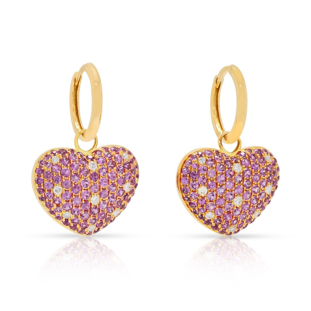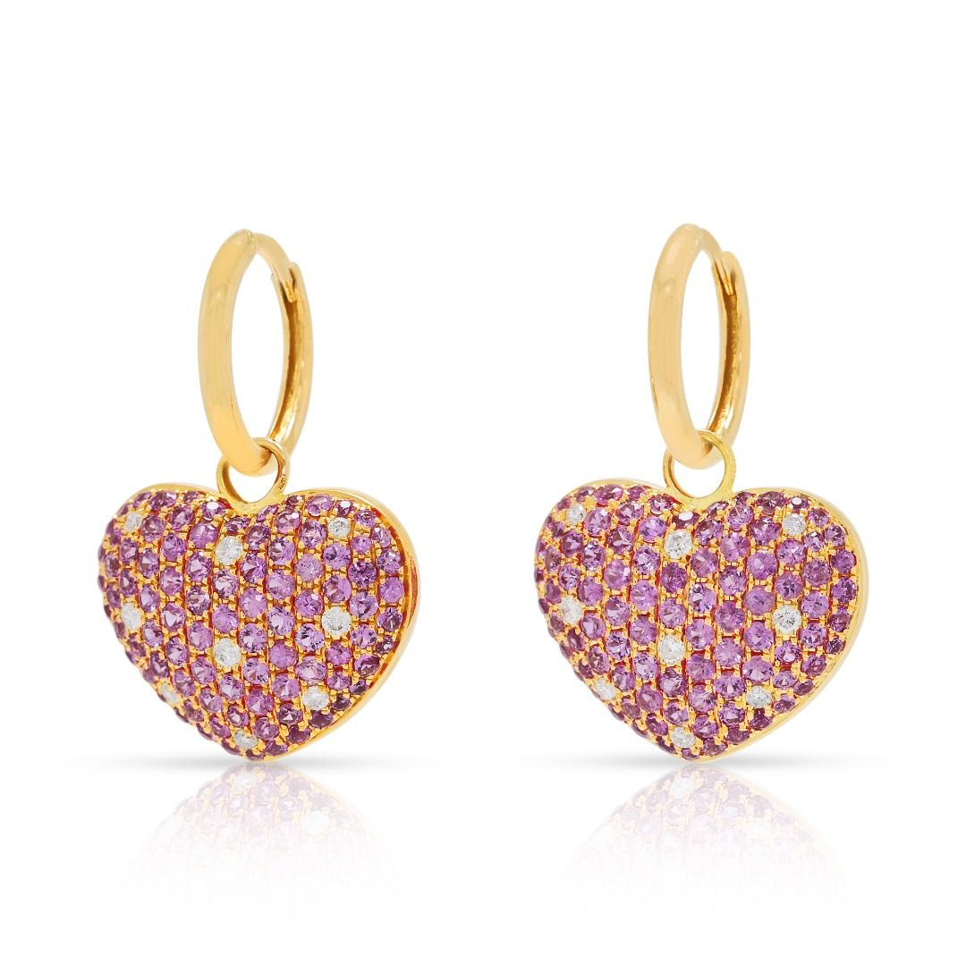 זוג עגילים המקרינים קסם ותחכום. עשויים מזהב ורוד 18 קראט, הם משובצים ב-178 ספירים ורודים בחיתוך עגול מבריק (סה"כ 1.42 קרט) המסודרים בעיצוב מרהיב בהשראת לב, ומודגשים על ידי 18 יהלומים בחיתוך עגול מבריק (סה"כ 0.12 קרט, צבע I–J, ניקיון SI). עם משקל כולל של 1.54 קרט, משקל תכשיט של 5.77 גרם, ומידות של 24 מ"מ x 16 מ"מ, עגילים אלה משלבים צבעים עזים עם פרטים נוצצים, מה שהופך אותם לתכשיט חינני לאירועים רומנטיים ולסגנון מעודן.