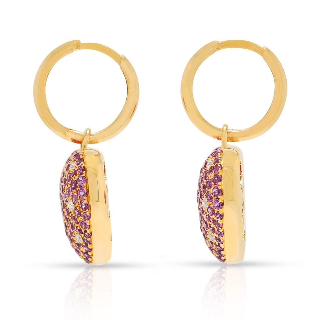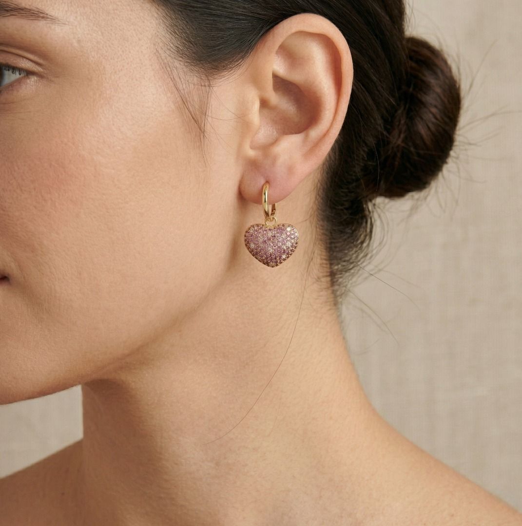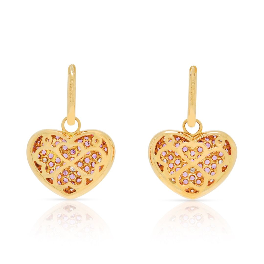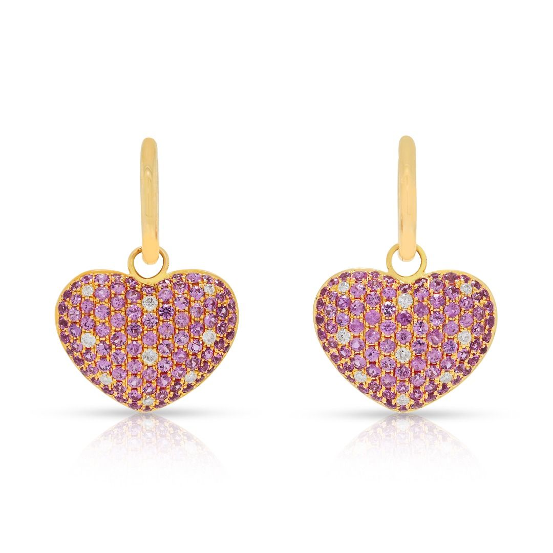 זוג עגילים המקרינים קסם ותחכום. עשויים מזהב ורוד 18 קראט, הם משובצים ב-178 ספירים ורודים בחיתוך עגול מבריק (סה"כ 1.42 קרט) המסודרים בעיצוב מרהיב בהשראת לב, ומודגשים על ידי 18 יהלומים בחיתוך עגול מבריק (סה"כ 0.12 קרט, צבע I–J, ניקיון SI). עם משקל כולל של 1.54 קרט, משקל תכשיט של 5.77 גרם, ומידות של 24 מ"מ x 16 מ"מ, עגילים אלה משלבים צבעים עזים עם פרטים נוצצים, מה שהופך אותם לתכשיט חינני לאירועים רומנטיים ולסגנון מעודן.