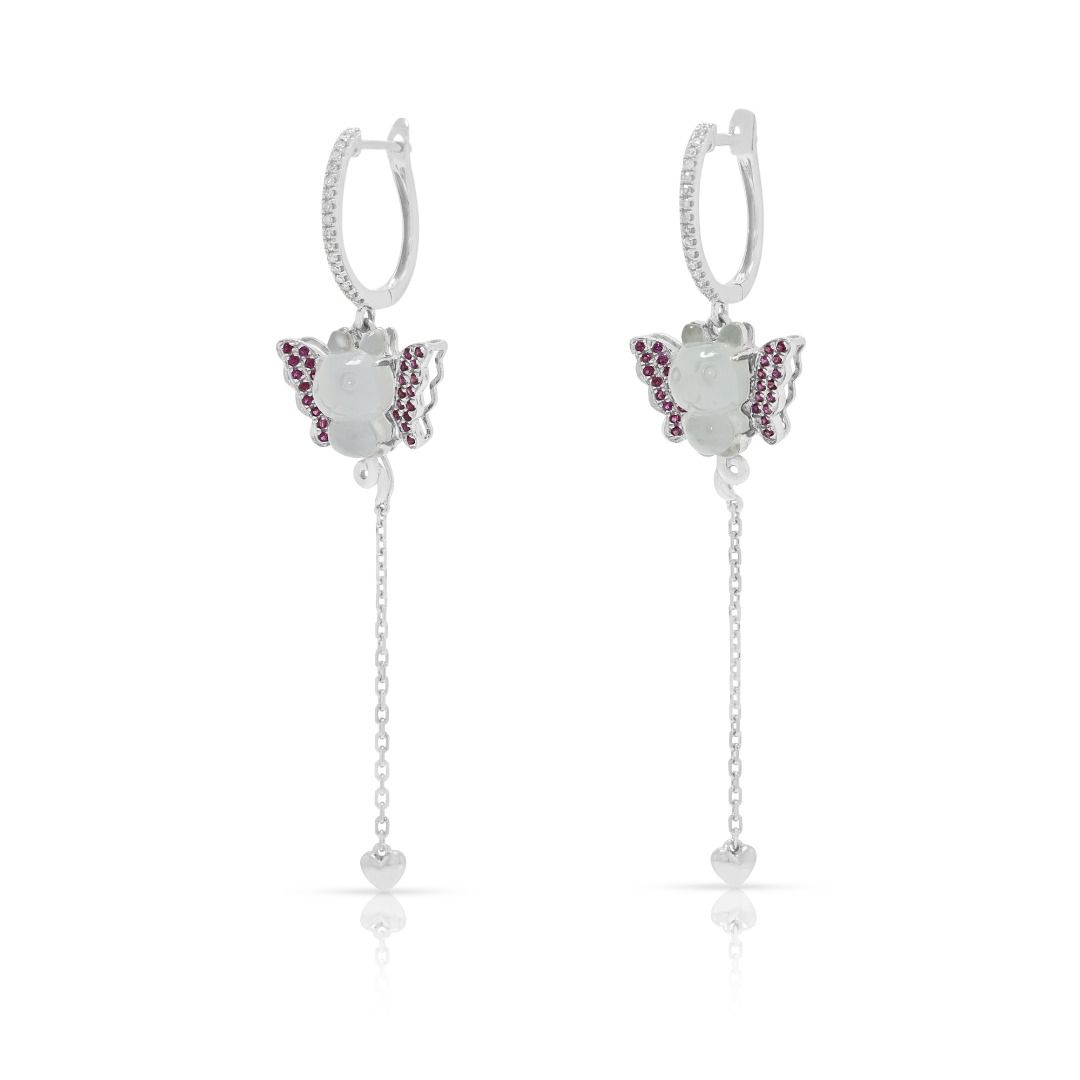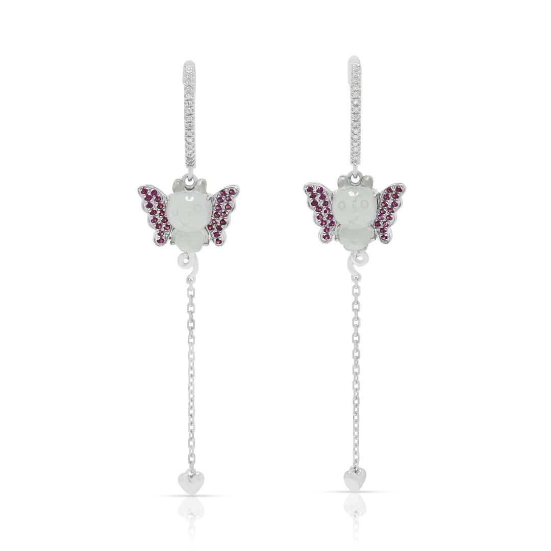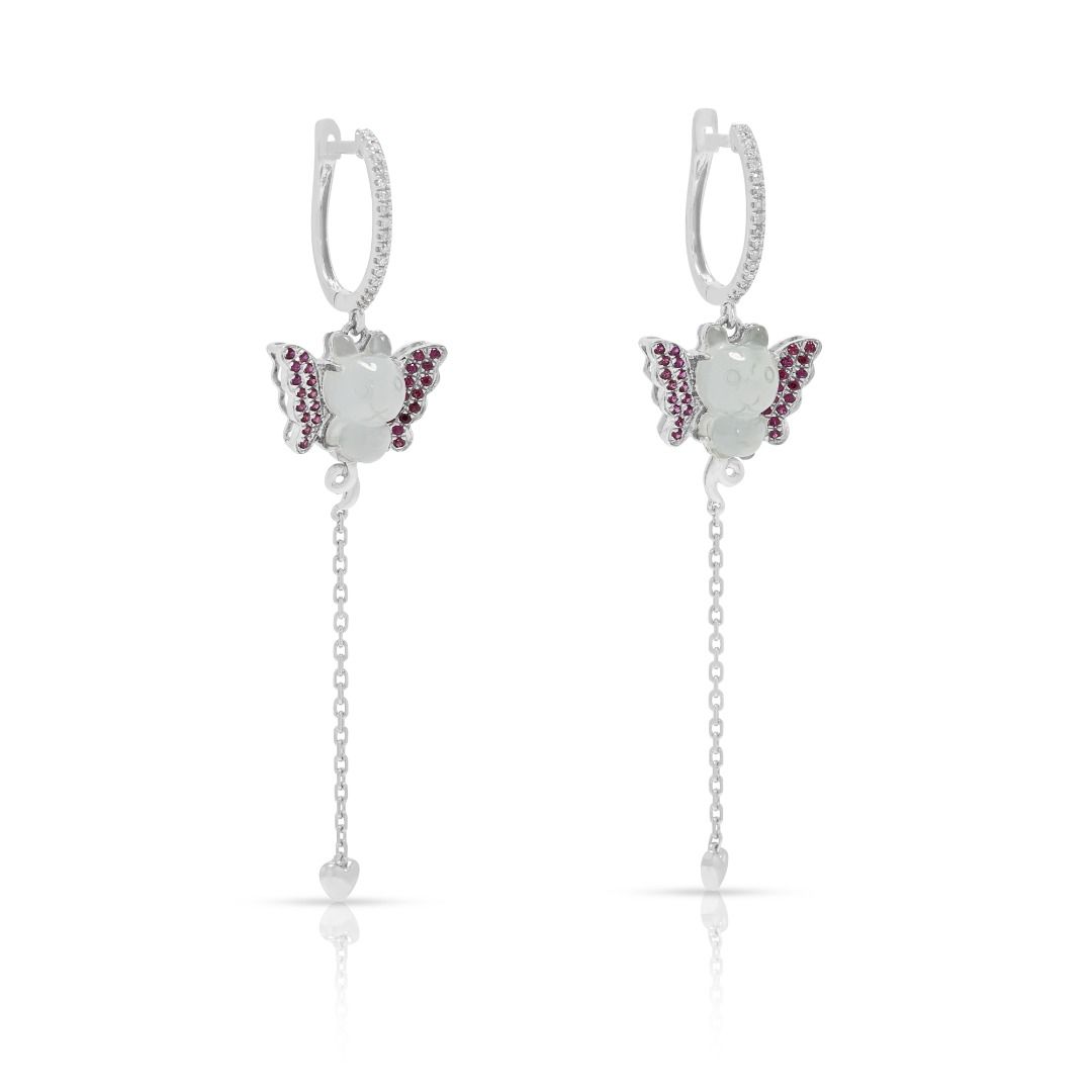 זוג עגילים המשלבים אומנות עם קסם תוסס. עשויים מזהב לבן 18K, הם משובצים בשני פריטי ג'ייד מגולפים בגוון קרח יחד עם 56 אבני ספיר ורודות בחיתוך עגול מבריק (0.14ct סה"כ) למראה מלא חיים. העיצוב משופר עוד יותר על ידי 34 יהלומים בחיתוך עגול מבריק (0.10ct סה"כ, צבע I, ניקיון SI), המוסיפים ניצוץ לצללית השובבה. עם משקל קראט כולל של 0.24ct, משקל תכשיט של 4.12g, ואורך של 54mm, עגילים אלה מגלמים תחכום שובב ואומנות מעודנת, מושלמים לסגנון הצהרתי.